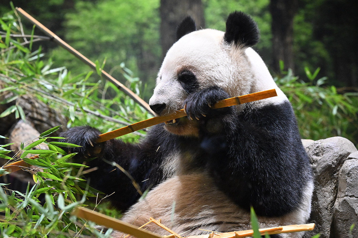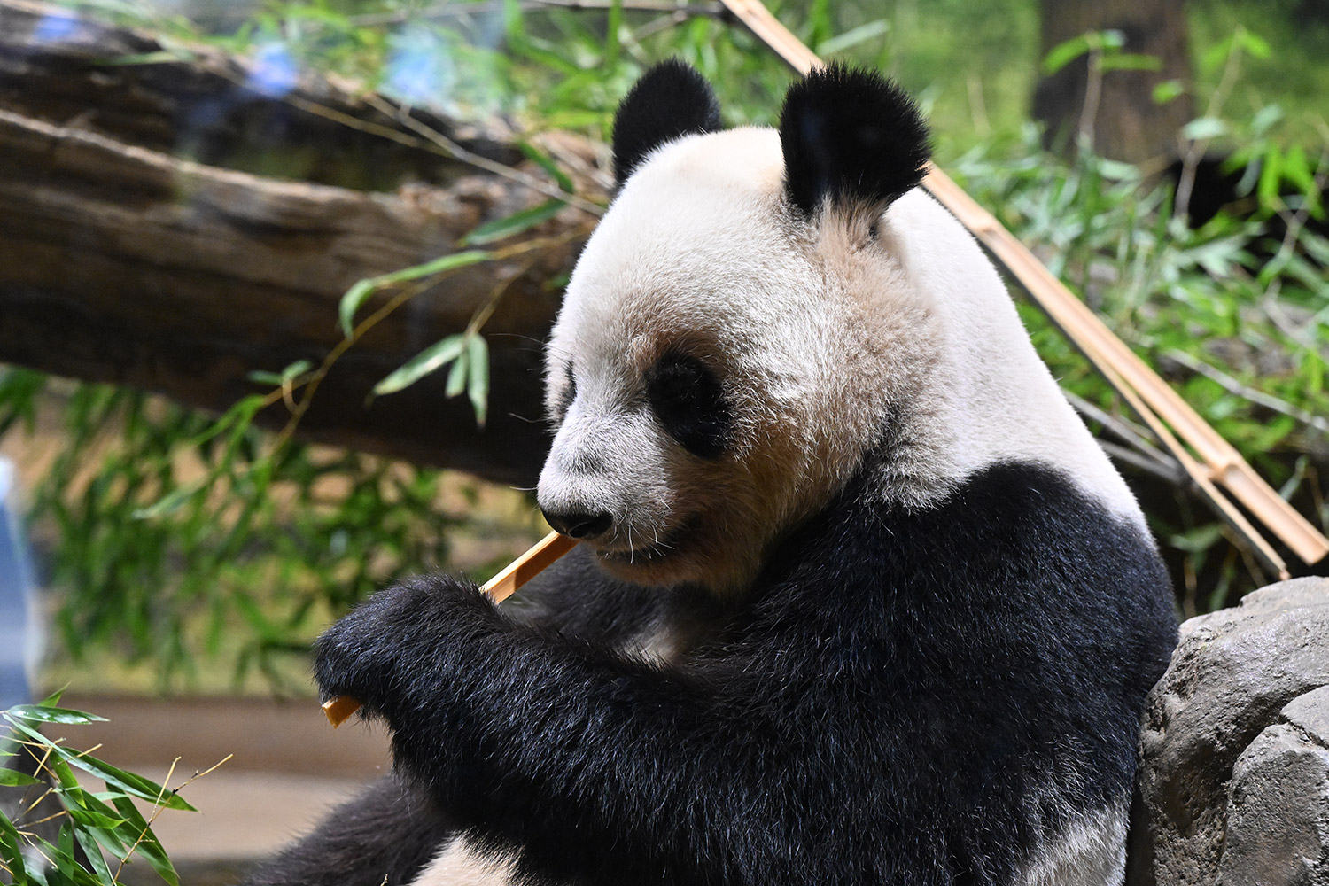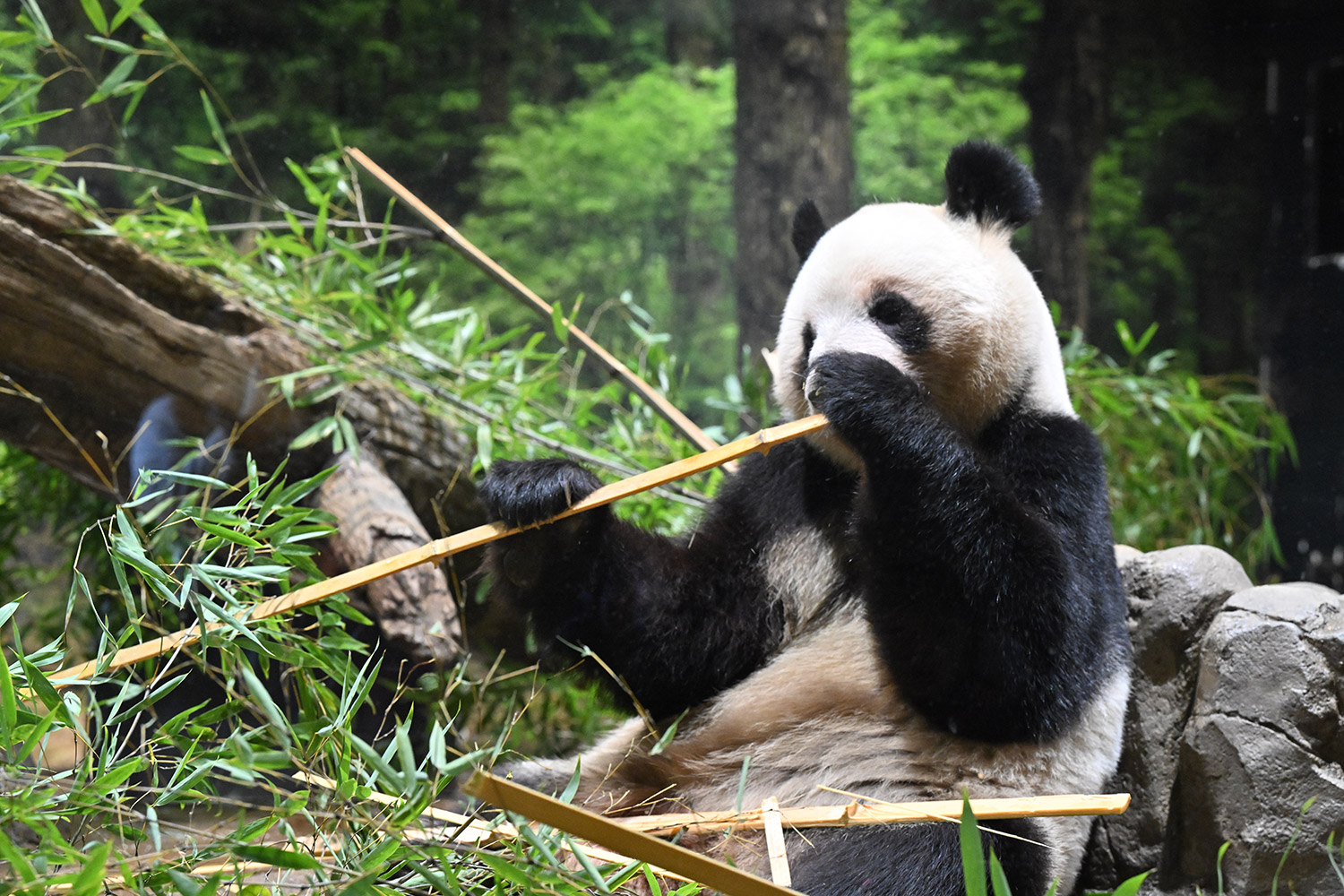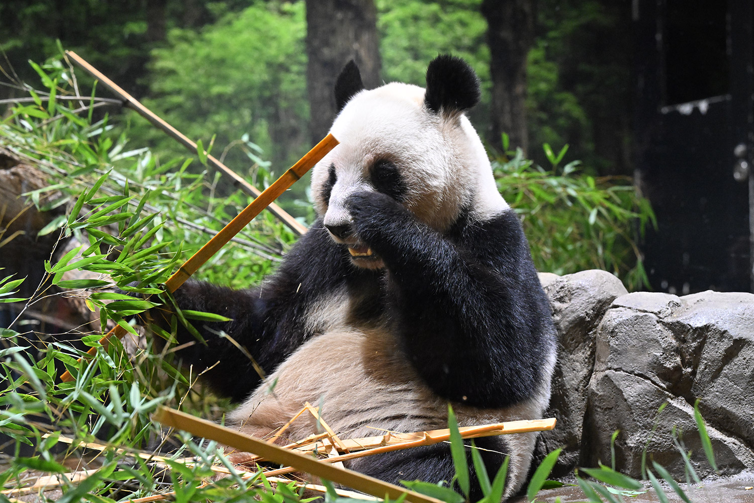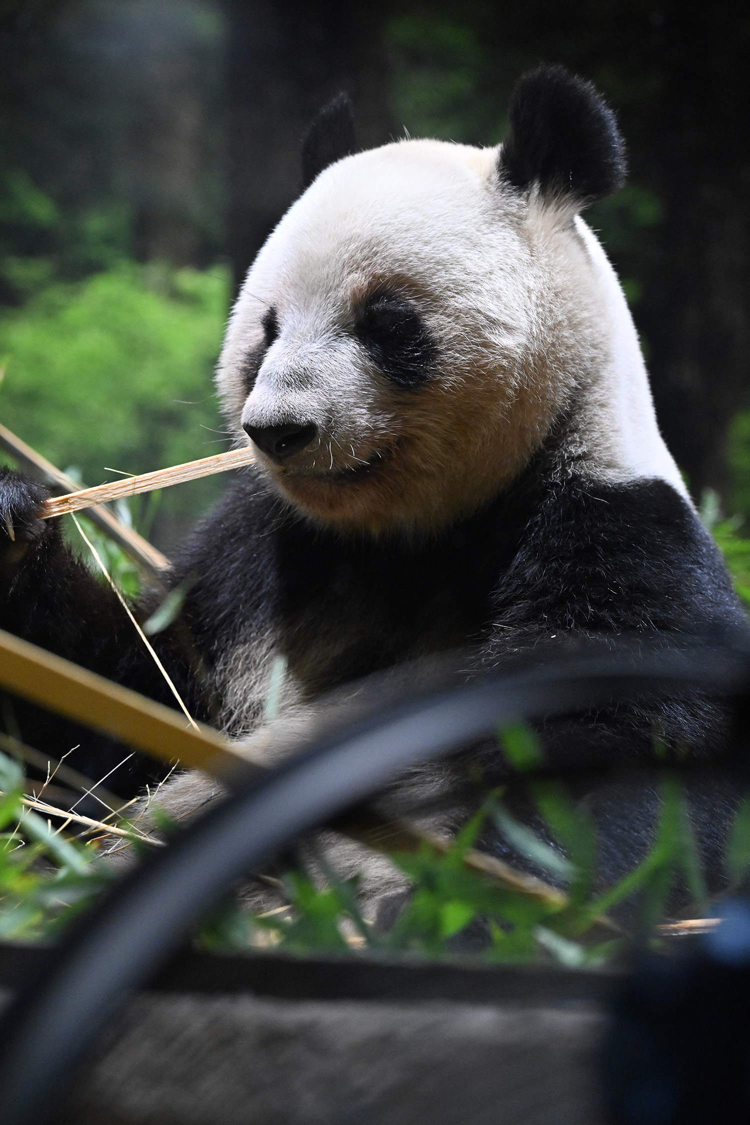 シャオくんもレイちゃんもお庭で食べるおやつを楽しみ今日を元気に暮らしていますね🤗❤️ シャオくんウヒヒと不思議な微笑み、そんなに人参おいしかったの〜?🤣🥕 レイちゃんモックでごろごろ今日は逆さに今日は😁櫓の下で大ジャーンプ⛷️そうなの竹はお部屋で食べるのね😋🎋 見る側の心情は段々とお写真が涙でにじみそうになっていますが😢、ふたりの表情や仕草が面白くてやはり笑顔になります😊💕 連日早朝から並ばれての撮影をありがとうございます🙏
