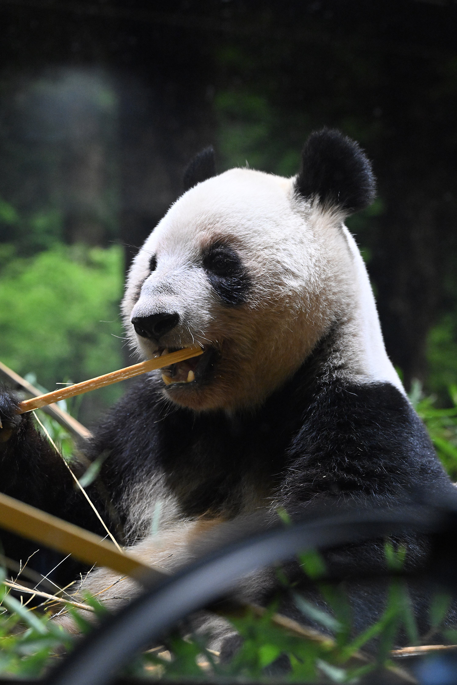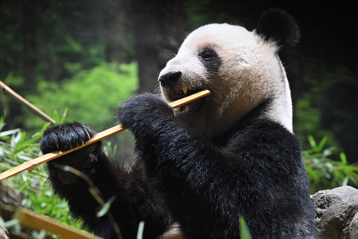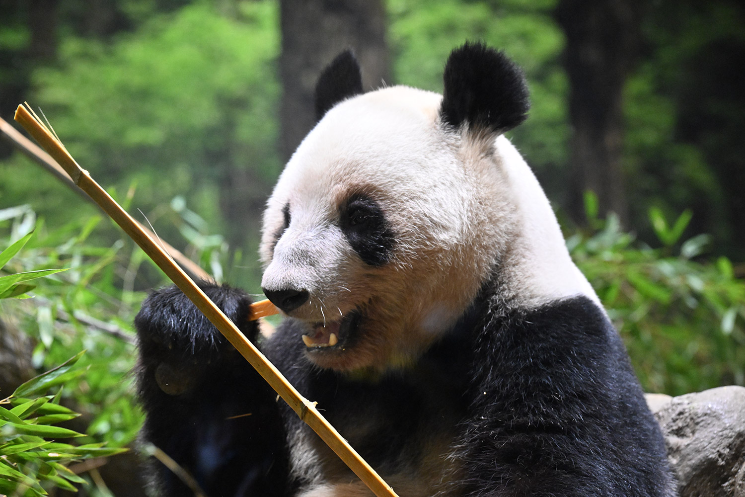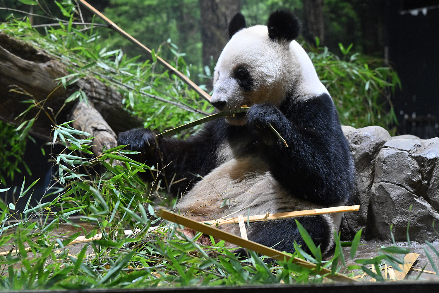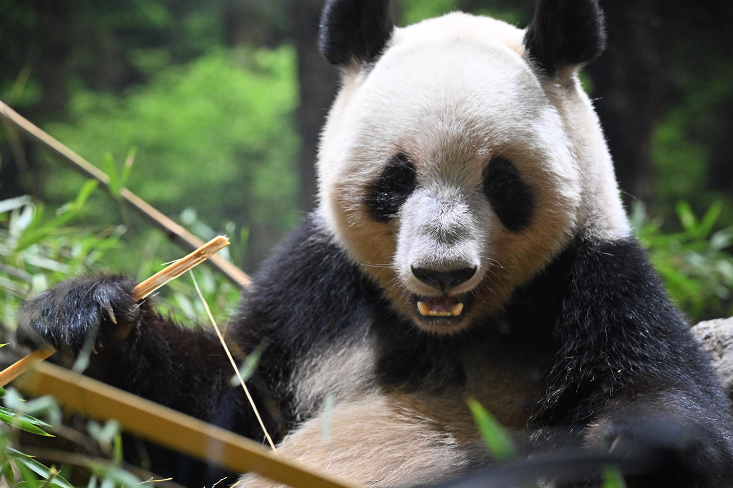 シャオくんもレイちゃんもお庭で食べるおやつを楽しみ今日を元気に暮らしていますね🤗❤️ シャオくんウヒヒと不思議な微笑み、そんなに人参おいしかったの〜?🤣🥕 レイちゃんモックでごろごろ今日は逆さに今日は😁櫓の下で大ジャーンプ⛷️そうなの竹はお部屋で食べるのね😋🎋 見る側の心情は段々とお写真が涙でにじみそうになっていますが😢、ふたりの表情や仕草が面白くてやはり笑顔になります😊💕 連日早朝から並ばれての撮影をありがとうございます🙏