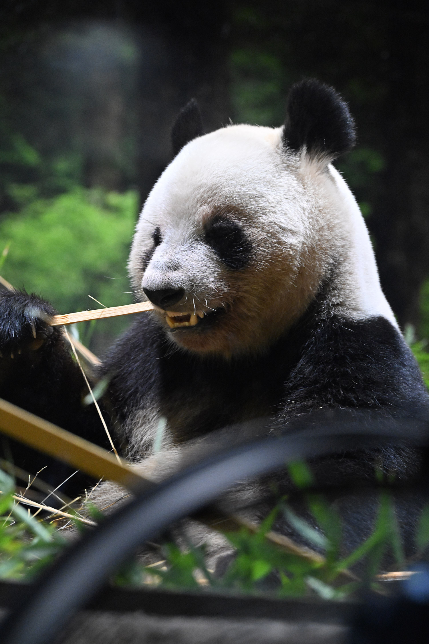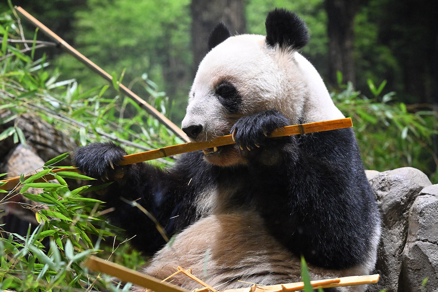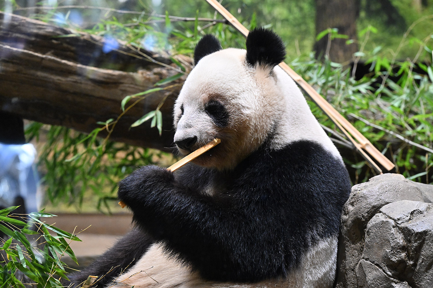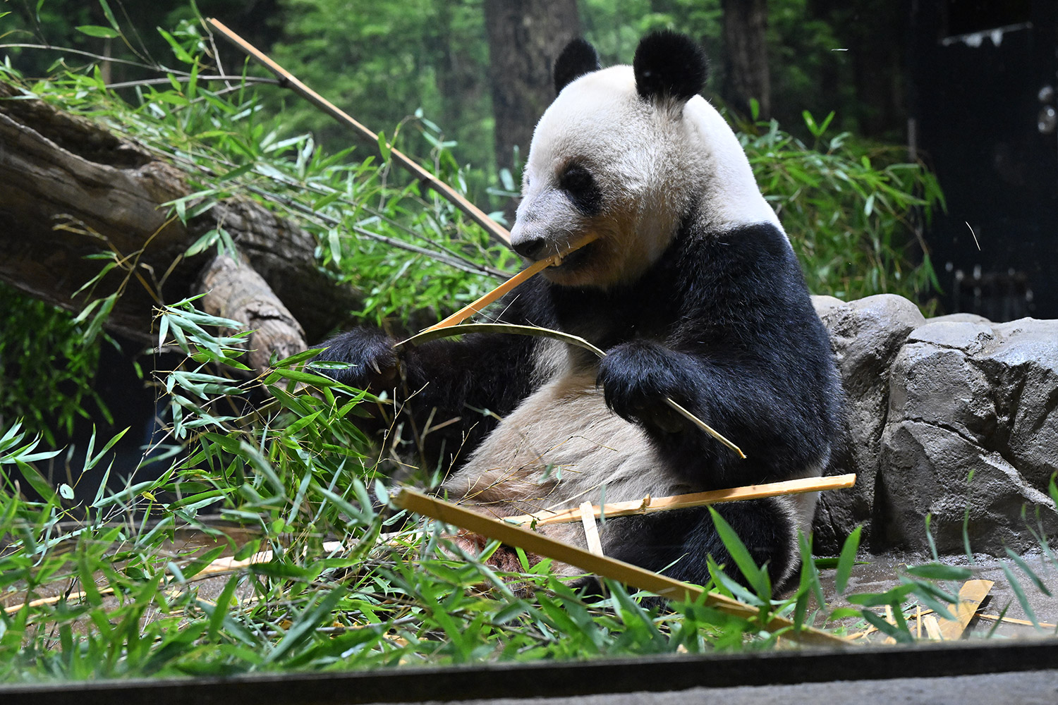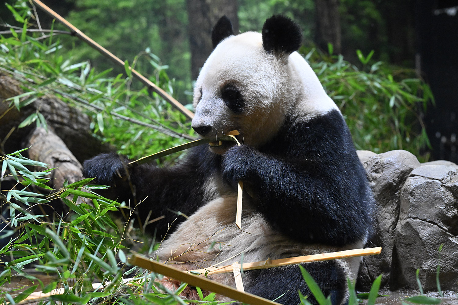 シャオくんもレイちゃんもお庭で食べるおやつを楽しみ今日を元気に暮らしていますね🤗❤️ シャオくんウヒヒと不思議な微笑み、そんなに人参おいしかったの〜?🤣🥕 レイちゃんモックでごろごろ今日は逆さに今日は😁櫓の下で大ジャーンプ⛷️そうなの竹はお部屋で食べるのね😋🎋 見る側の心情は段々とお写真が涙でにじみそうになっていますが😢、ふたりの表情や仕草が面白くてやはり笑顔になります😊💕 連日早朝から並ばれての撮影をありがとうございます🙏
