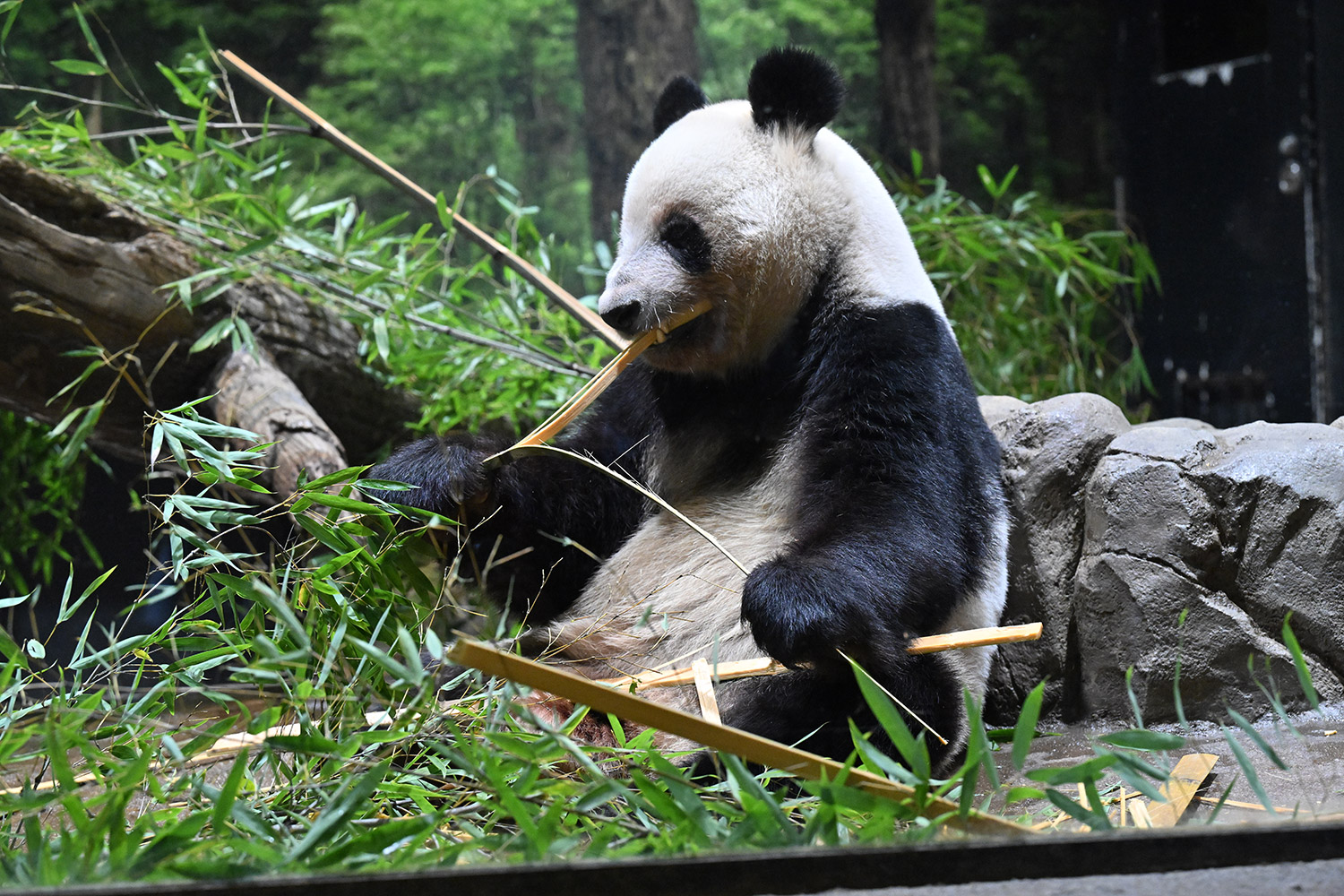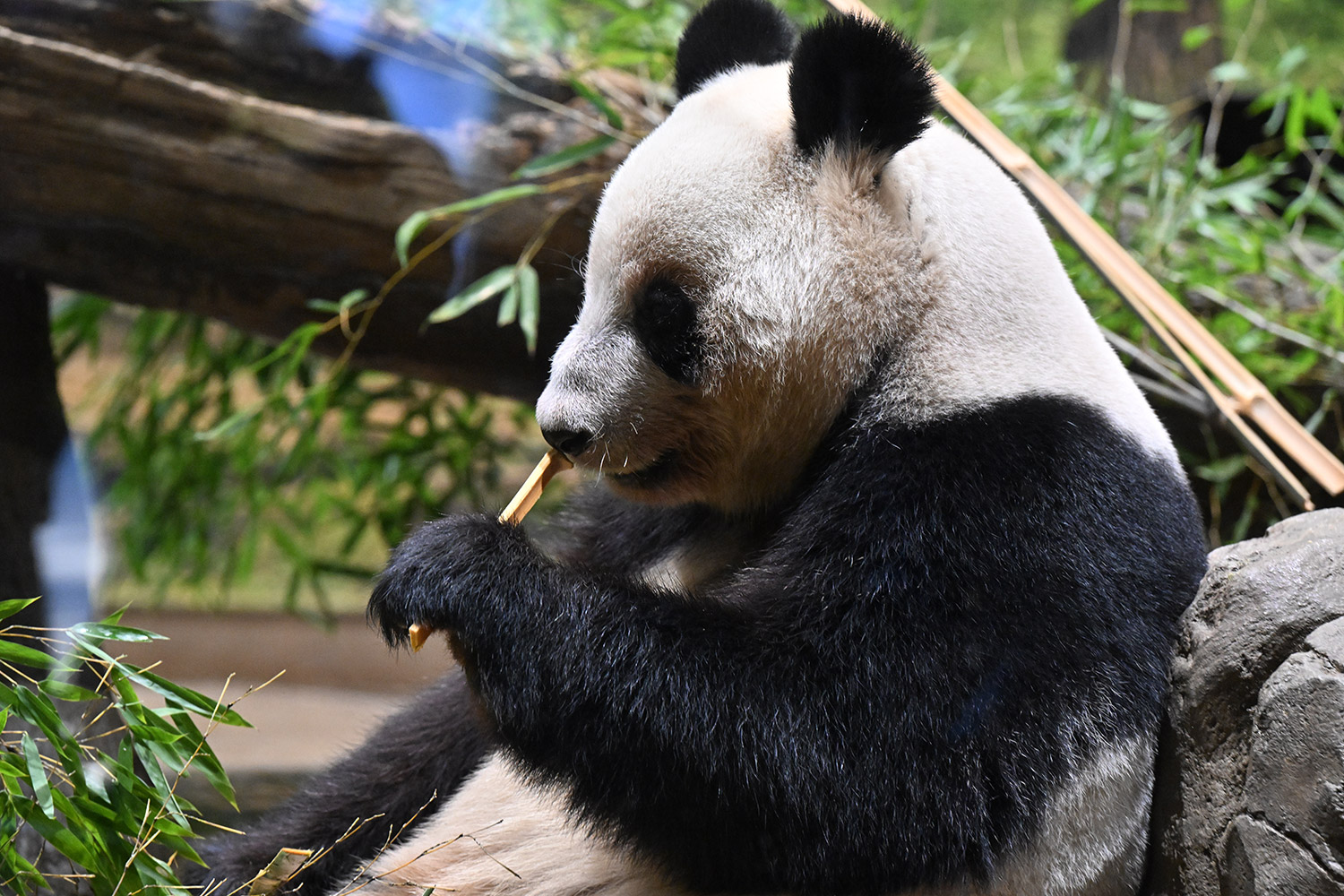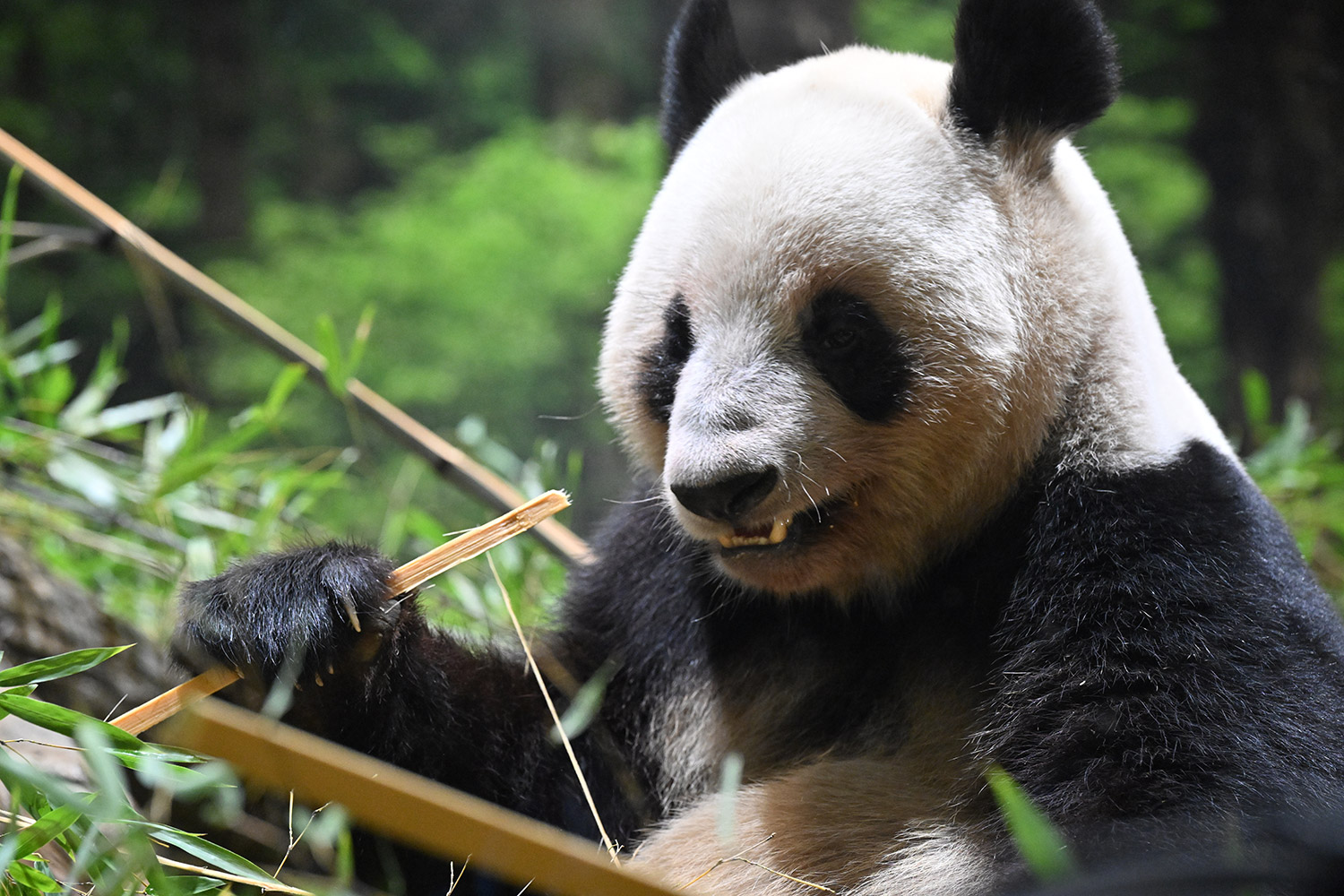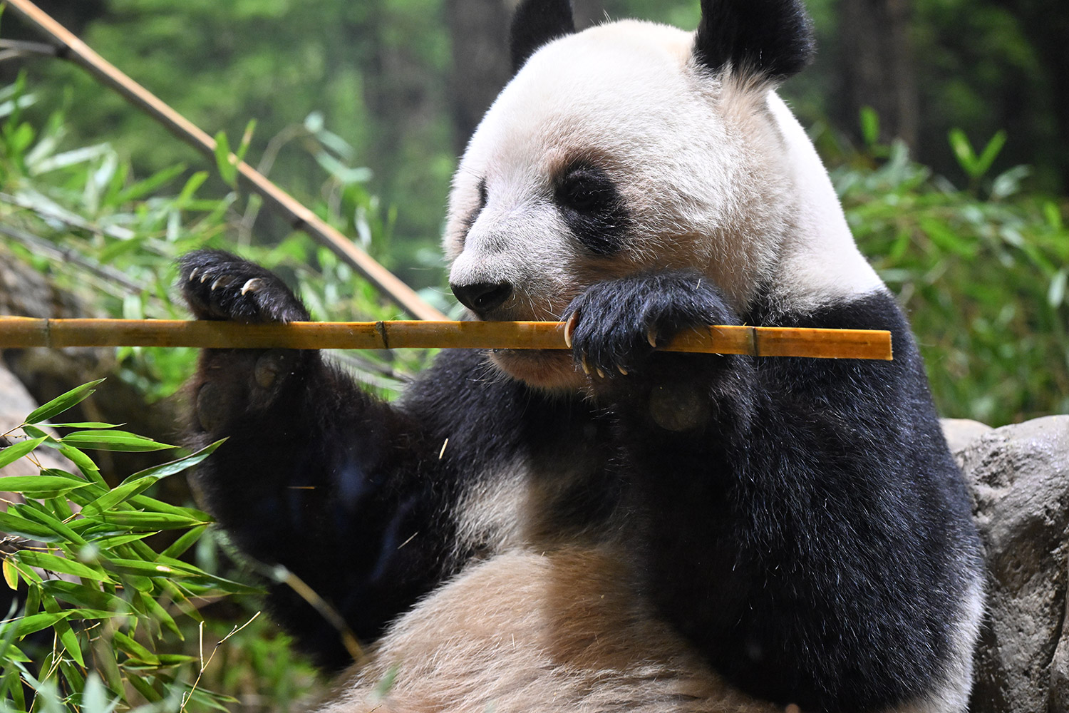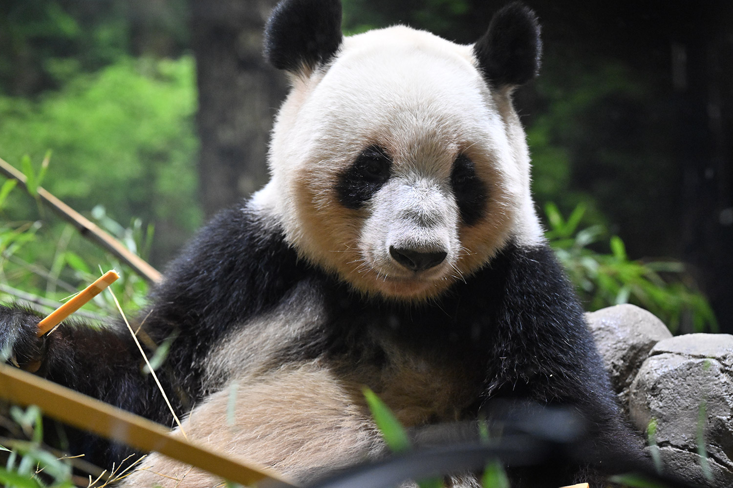 シャオくんもレイちゃんもお庭で食べるおやつを楽しみ今日を元気に暮らしていますね🤗❤️ シャオくんウヒヒと不思議な微笑み、そんなに人参おいしかったの〜?🤣🥕 レイちゃんモックでごろごろ今日は逆さに今日は😁櫓の下で大ジャーンプ⛷️そうなの竹はお部屋で食べるのね😋🎋 見る側の心情は段々とお写真が涙でにじみそうになっていますが😢、ふたりの表情や仕草が面白くてやはり笑顔になります😊💕 連日早朝から並ばれての撮影をありがとうございます🙏