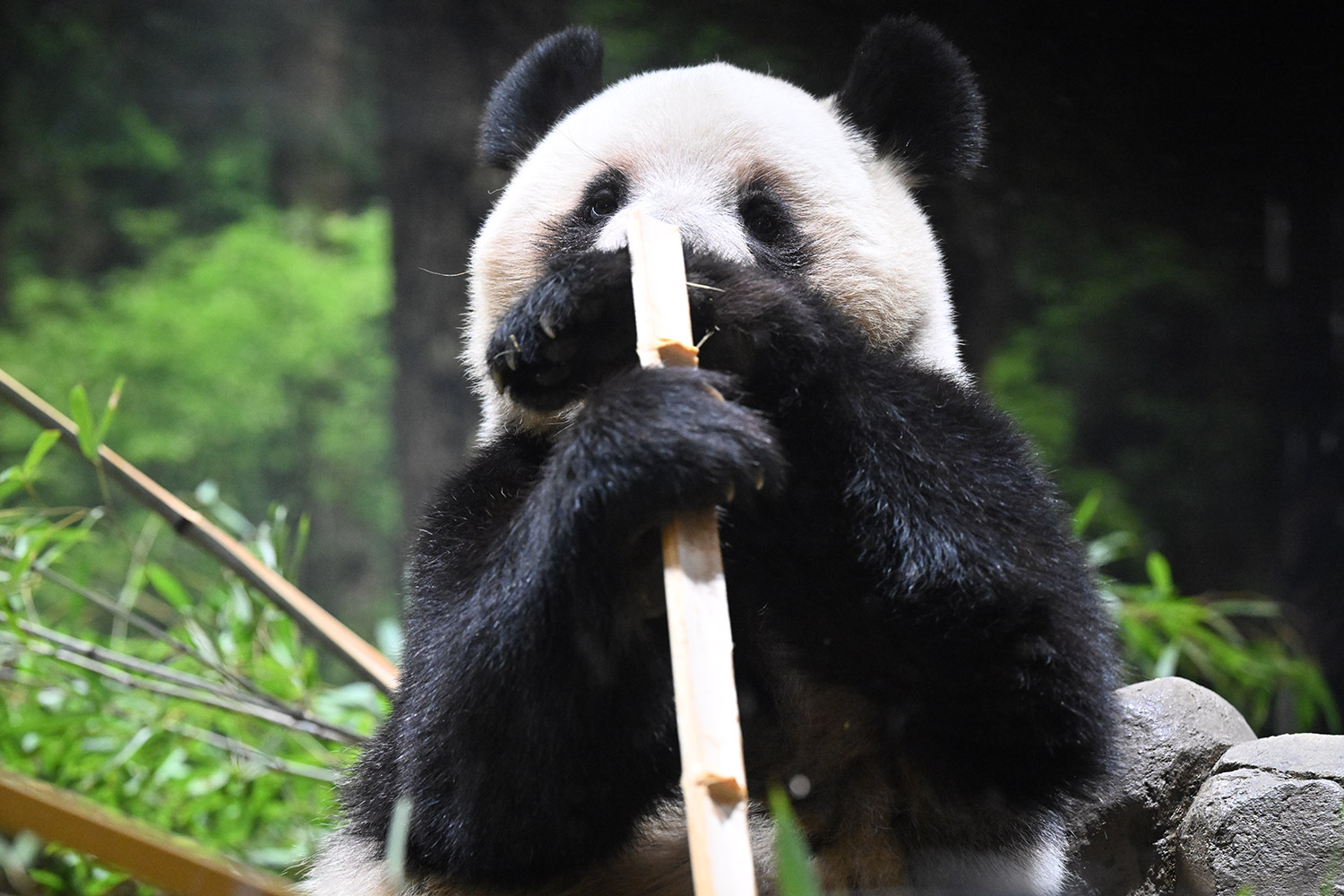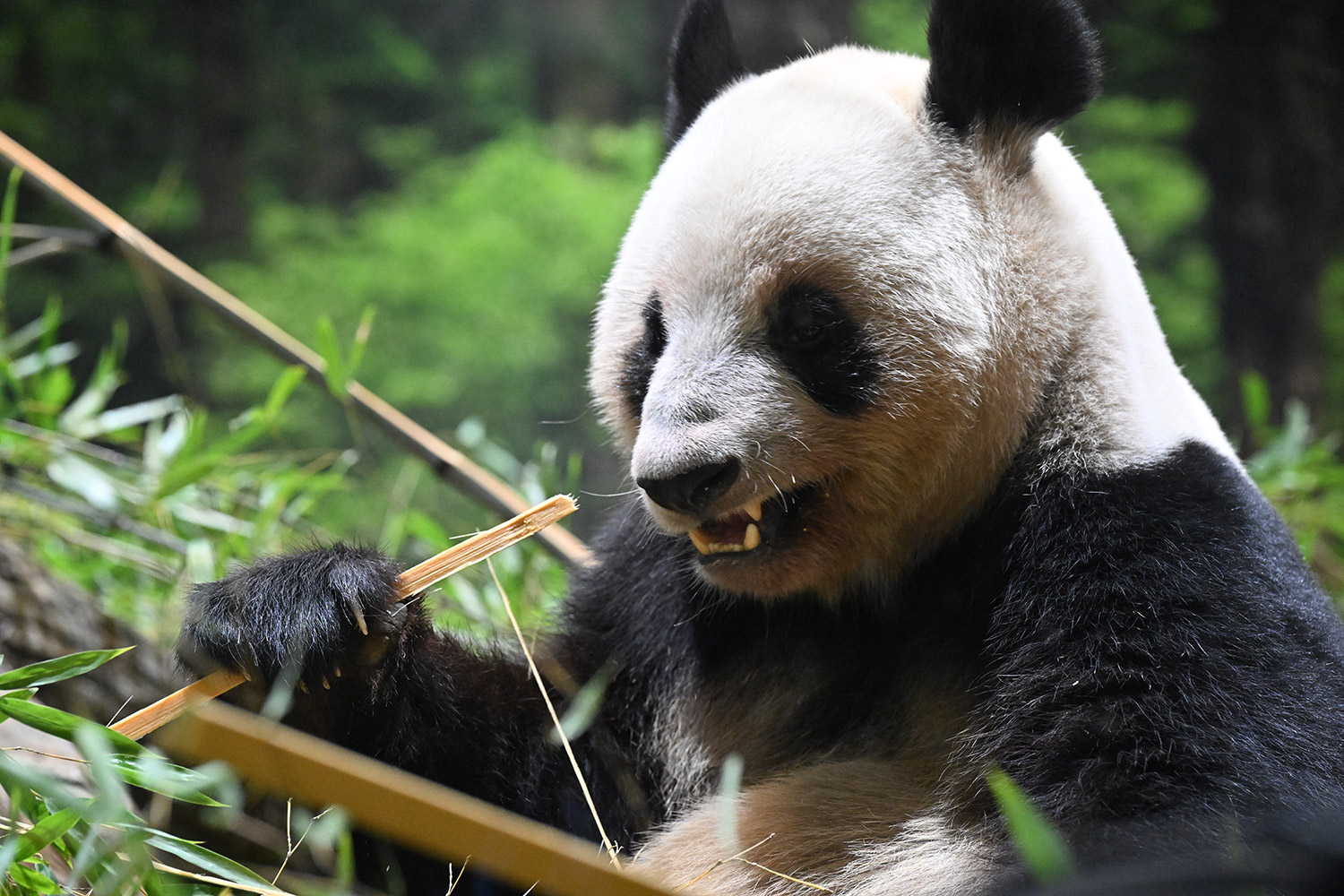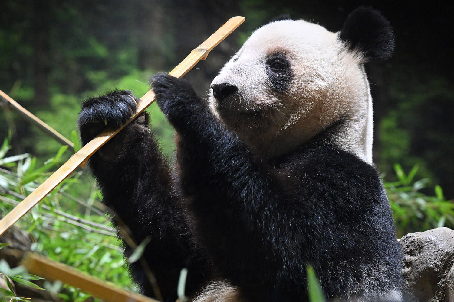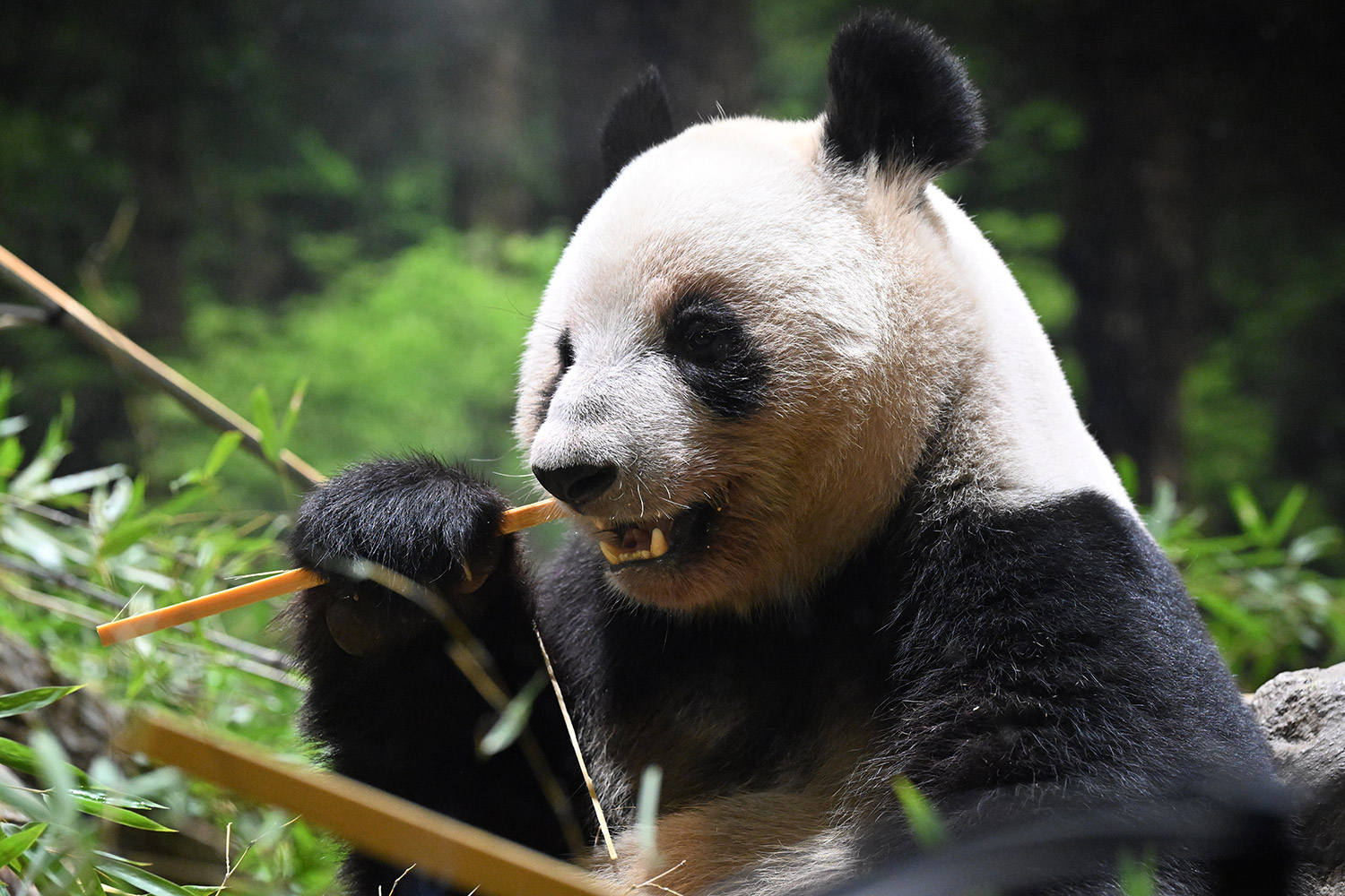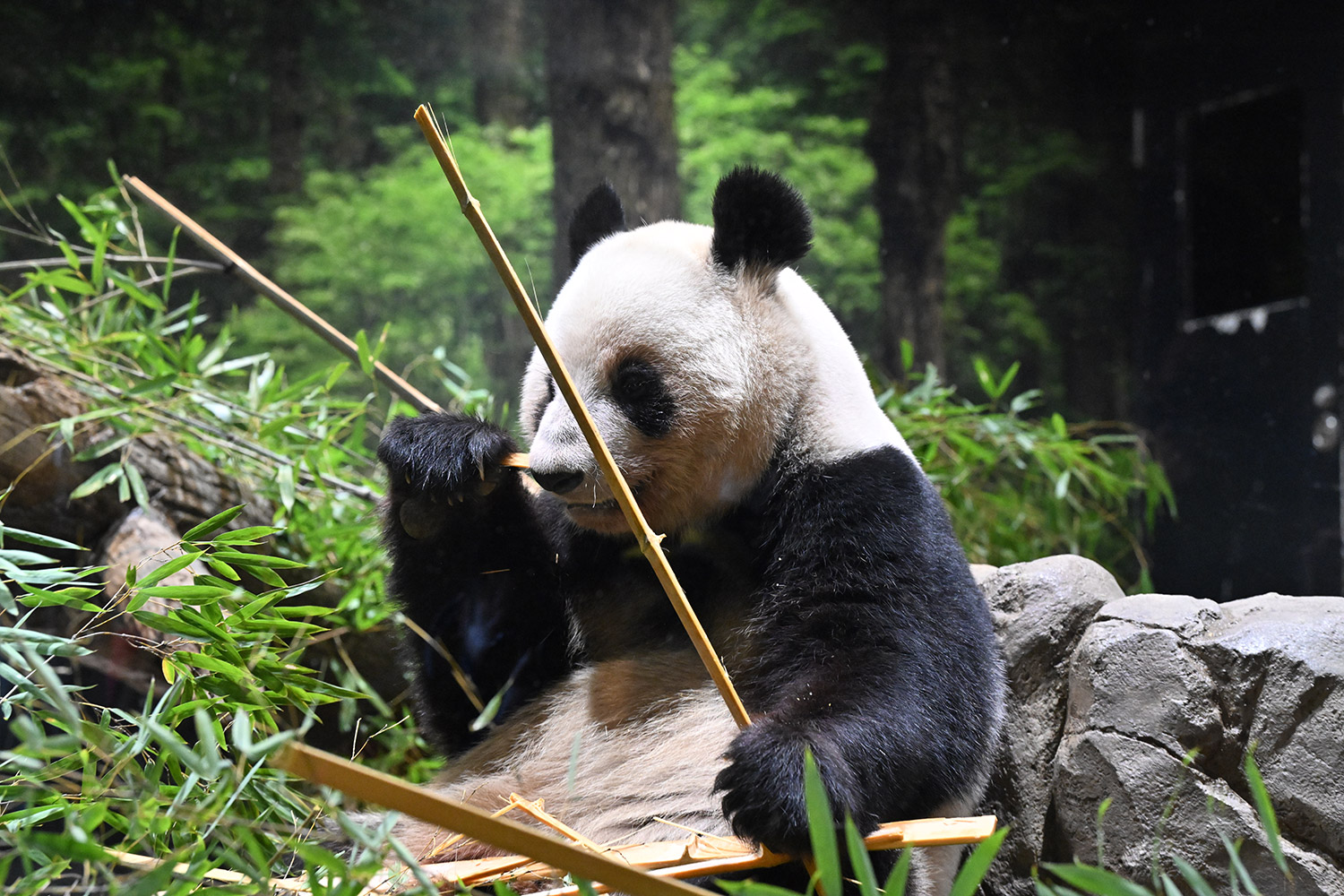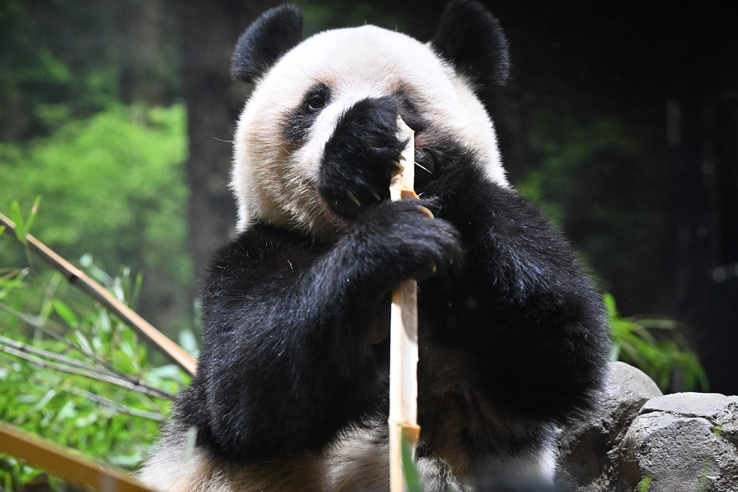 シャオくんもレイちゃんもお庭で食べるおやつを楽しみ今日を元気に暮らしていますね🤗❤️ シャオくんウヒヒと不思議な微笑み、そんなに人参おいしかったの〜?🤣🥕 レイちゃんモックでごろごろ今日は逆さに今日は😁櫓の下で大ジャーンプ⛷️そうなの竹はお部屋で食べるのね😋🎋 見る側の心情は段々とお写真が涙でにじみそうになっていますが😢、ふたりの表情や仕草が面白くてやはり笑顔になります😊💕 連日早朝から並ばれての撮影をありがとうございます🙏