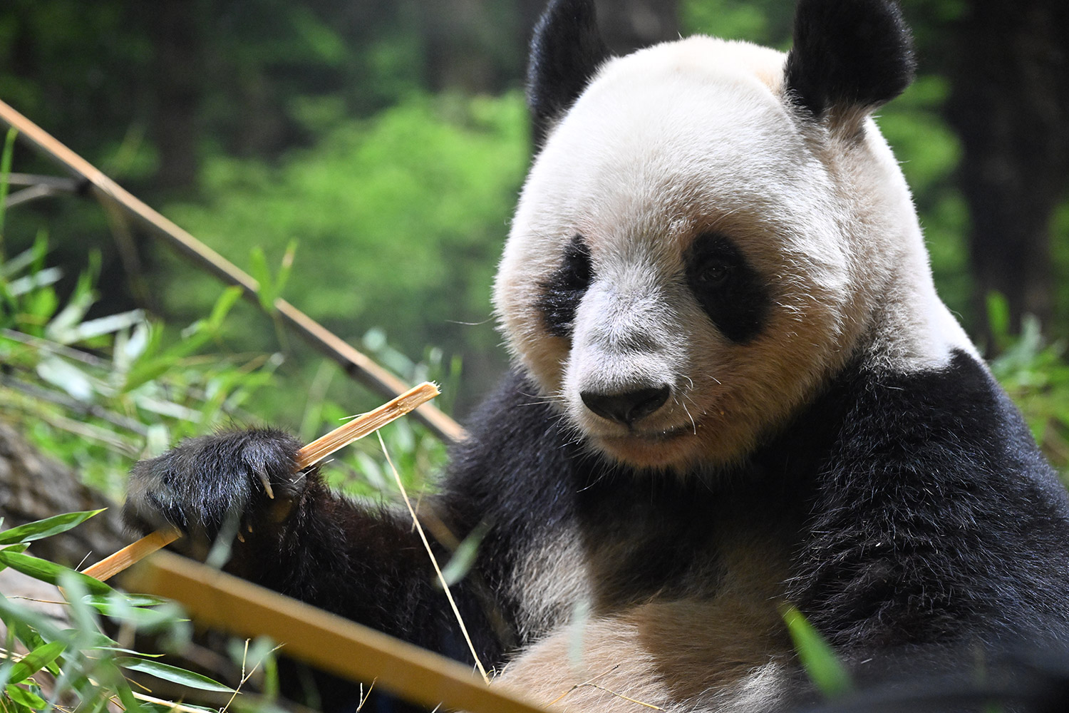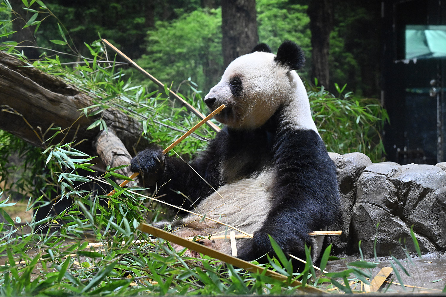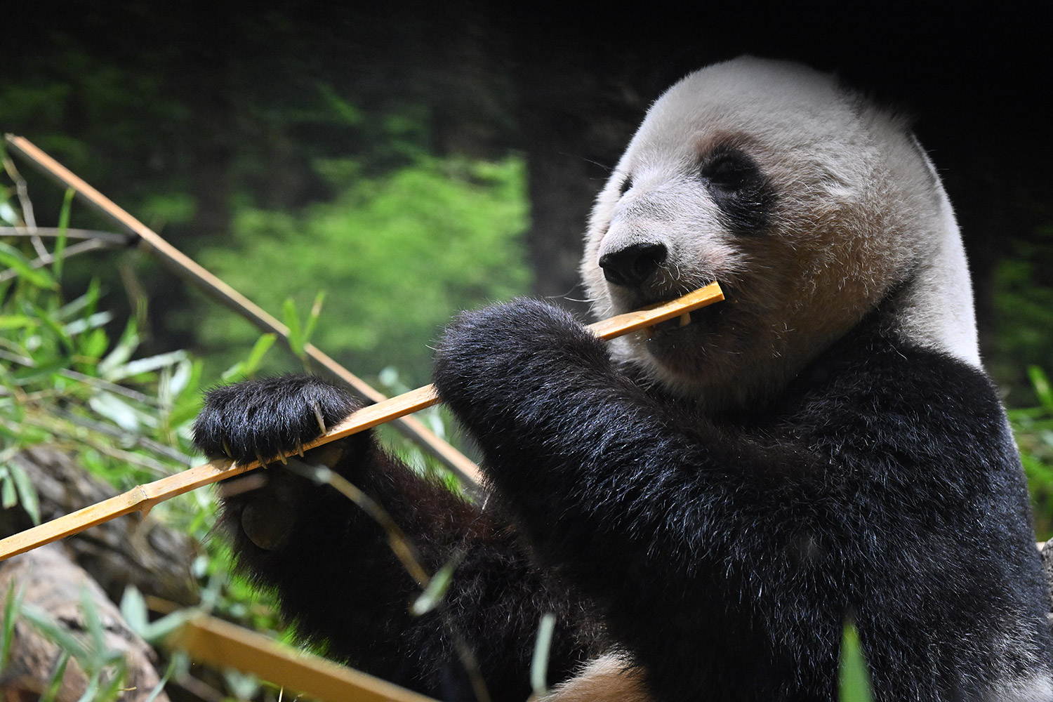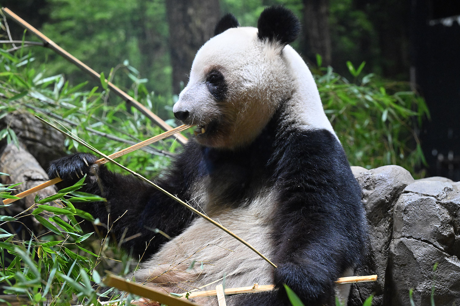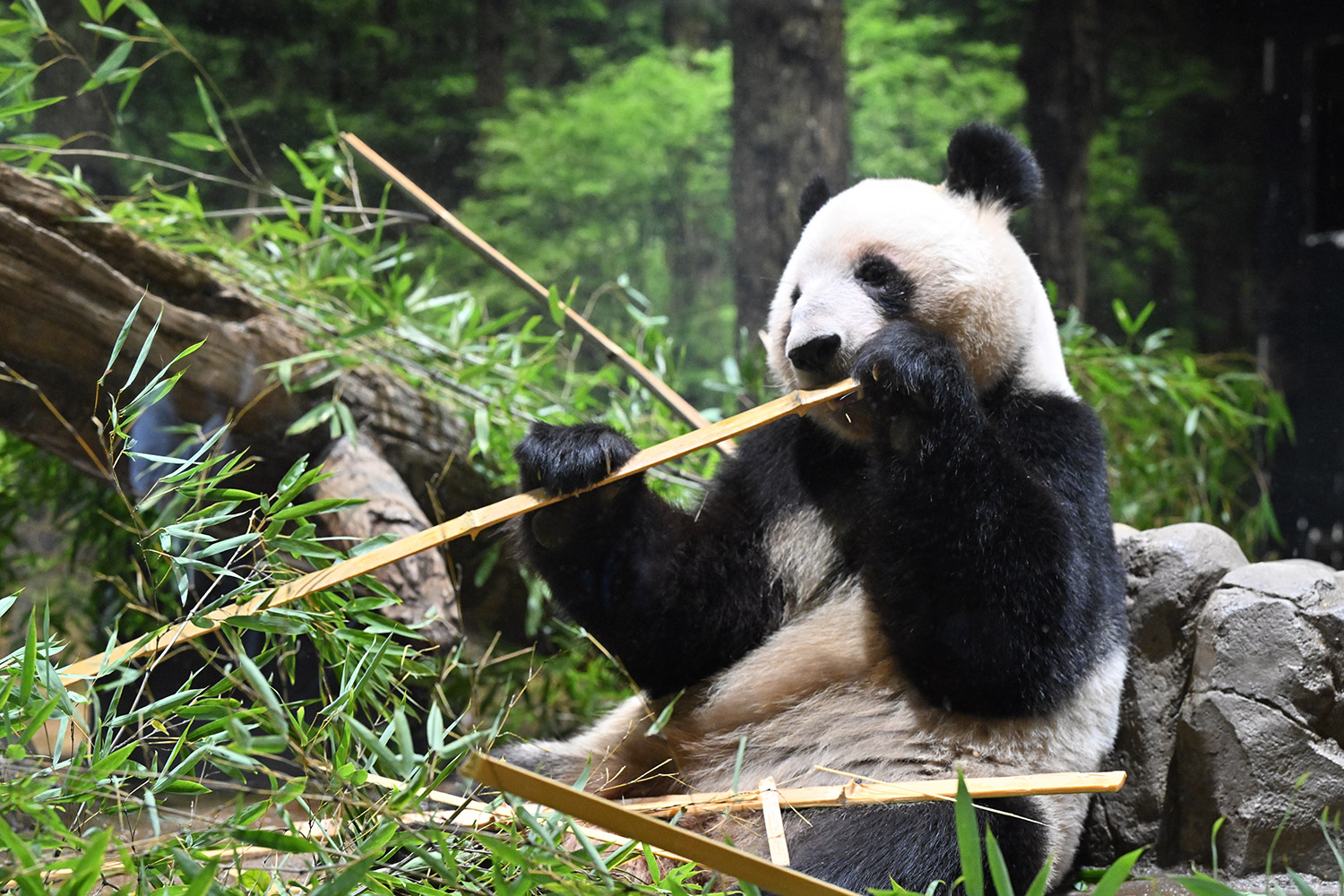 シャオくんもレイちゃんもお庭で食べるおやつを楽しみ今日を元気に暮らしていますね🤗❤️ シャオくんウヒヒと不思議な微笑み、そんなに人参おいしかったの〜?🤣🥕 レイちゃんモックでごろごろ今日は逆さに今日は😁櫓の下で大ジャーンプ⛷️そうなの竹はお部屋で食べるのね😋🎋 見る側の心情は段々とお写真が涙でにじみそうになっていますが😢、ふたりの表情や仕草が面白くてやはり笑顔になります😊💕 連日早朝から並ばれての撮影をありがとうございます🙏