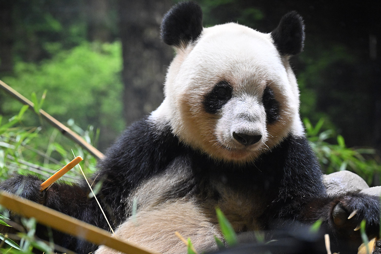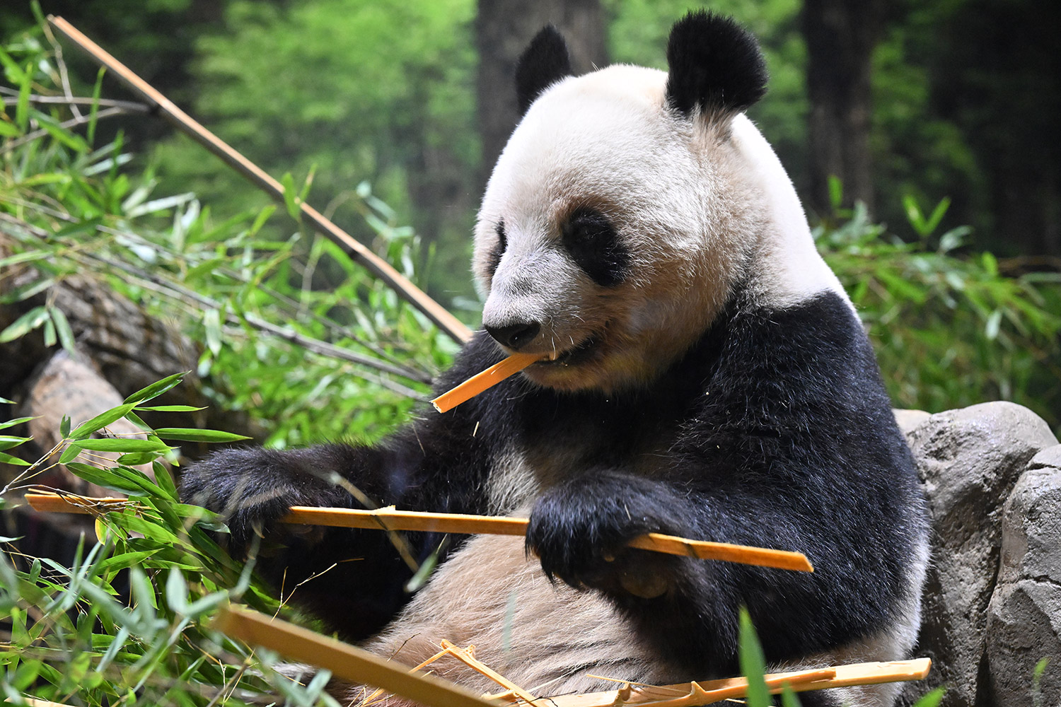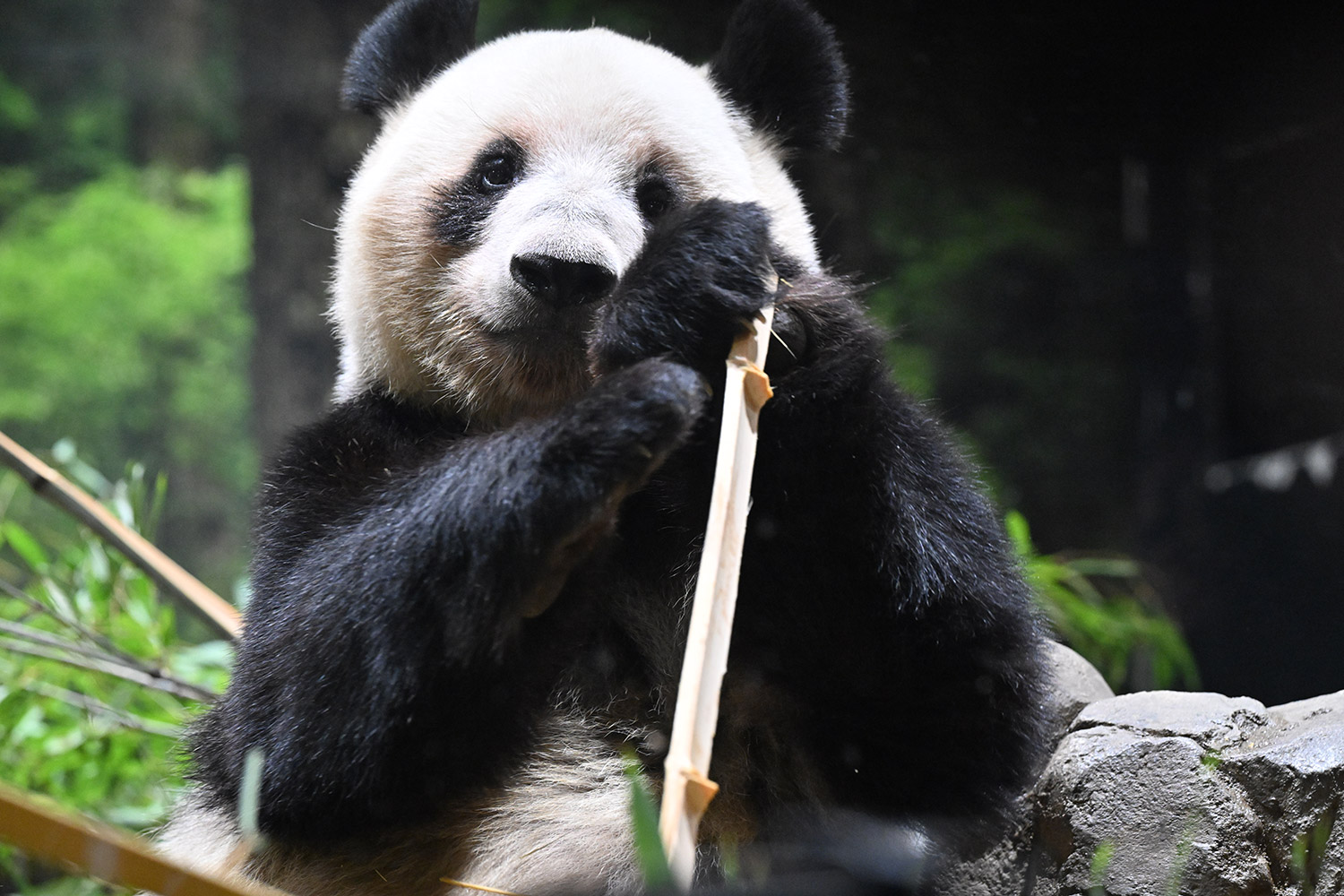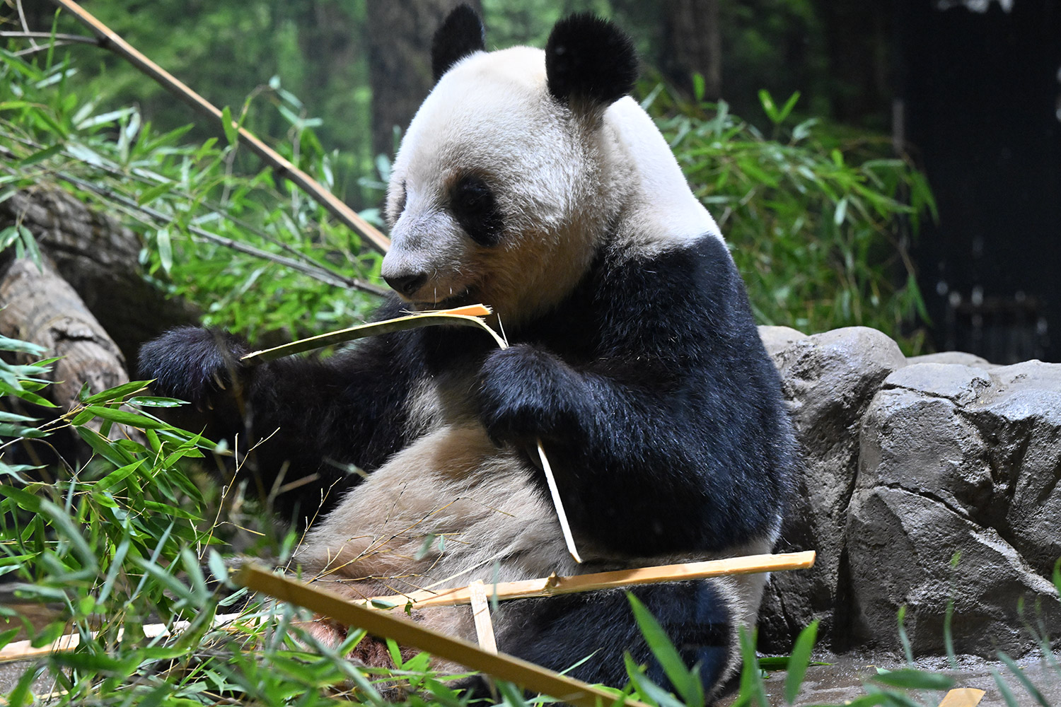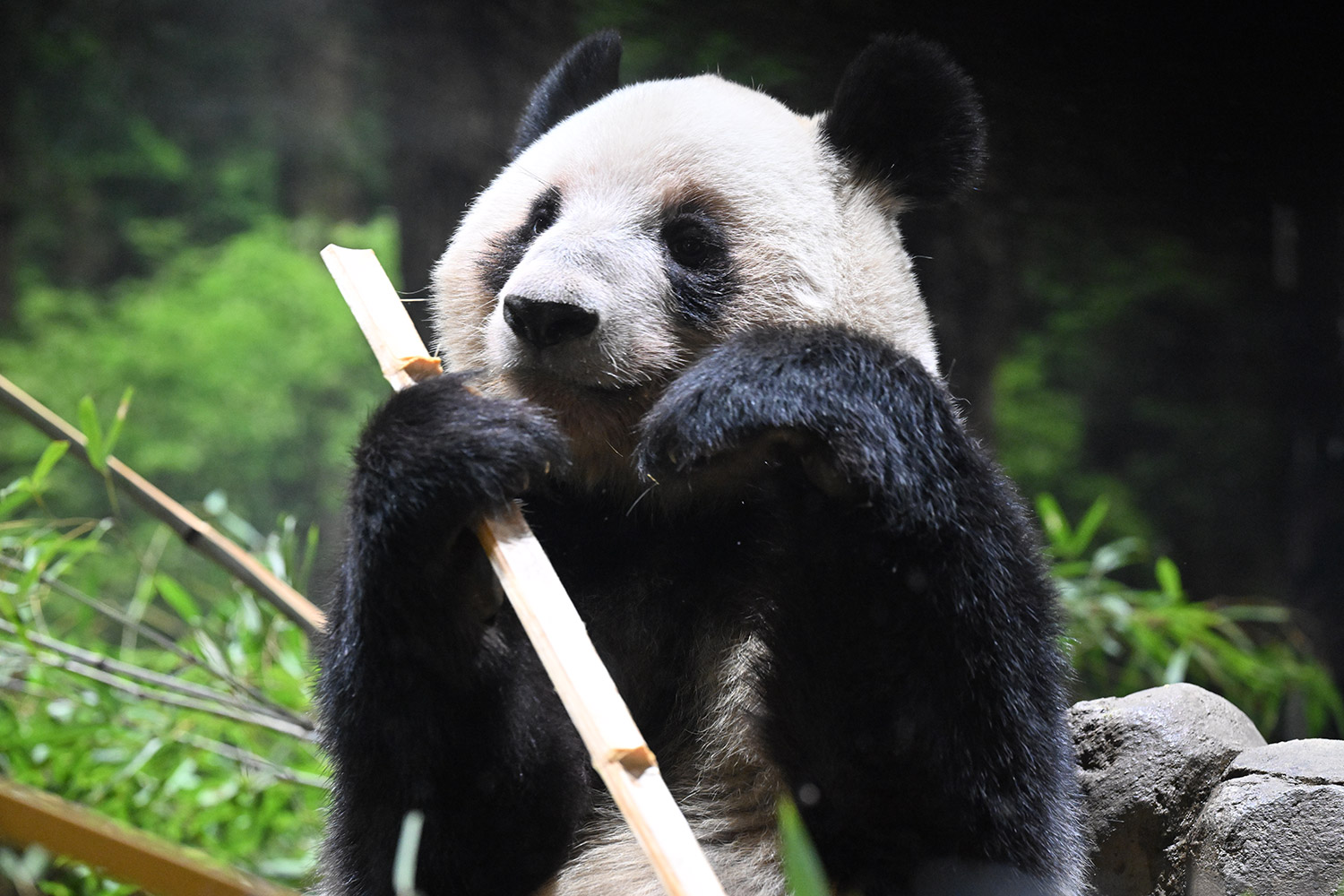 シャオくんもレイちゃんもお庭で食べるおやつを楽しみ今日を元気に暮らしていますね🤗❤️ シャオくんウヒヒと不思議な微笑み、そんなに人参おいしかったの〜?🤣🥕 レイちゃんモックでごろごろ今日は逆さに今日は😁櫓の下で大ジャーンプ⛷️そうなの竹はお部屋で食べるのね😋🎋 見る側の心情は段々とお写真が涙でにじみそうになっていますが😢、ふたりの表情や仕草が面白くてやはり笑顔になります😊💕 連日早朝から並ばれての撮影をありがとうございます🙏