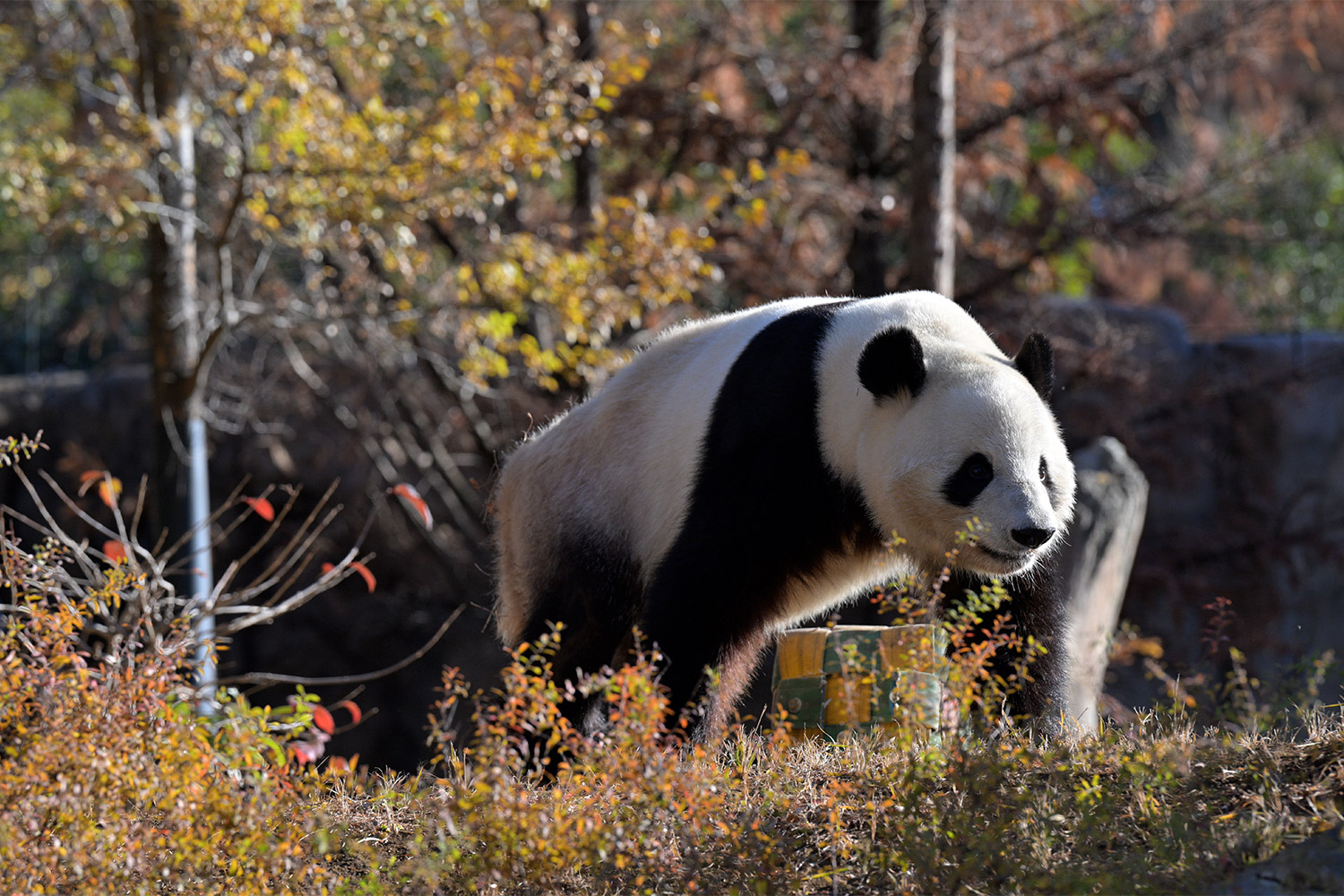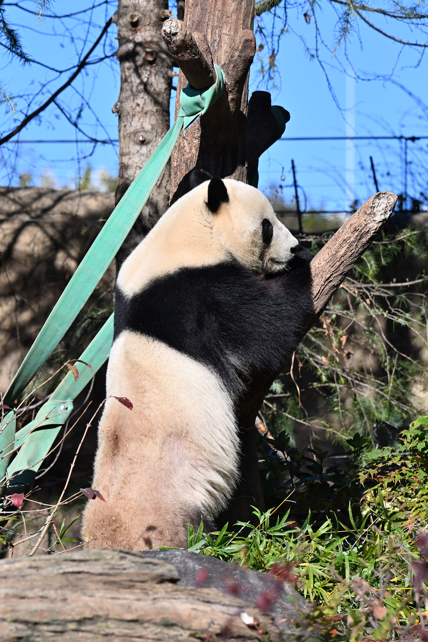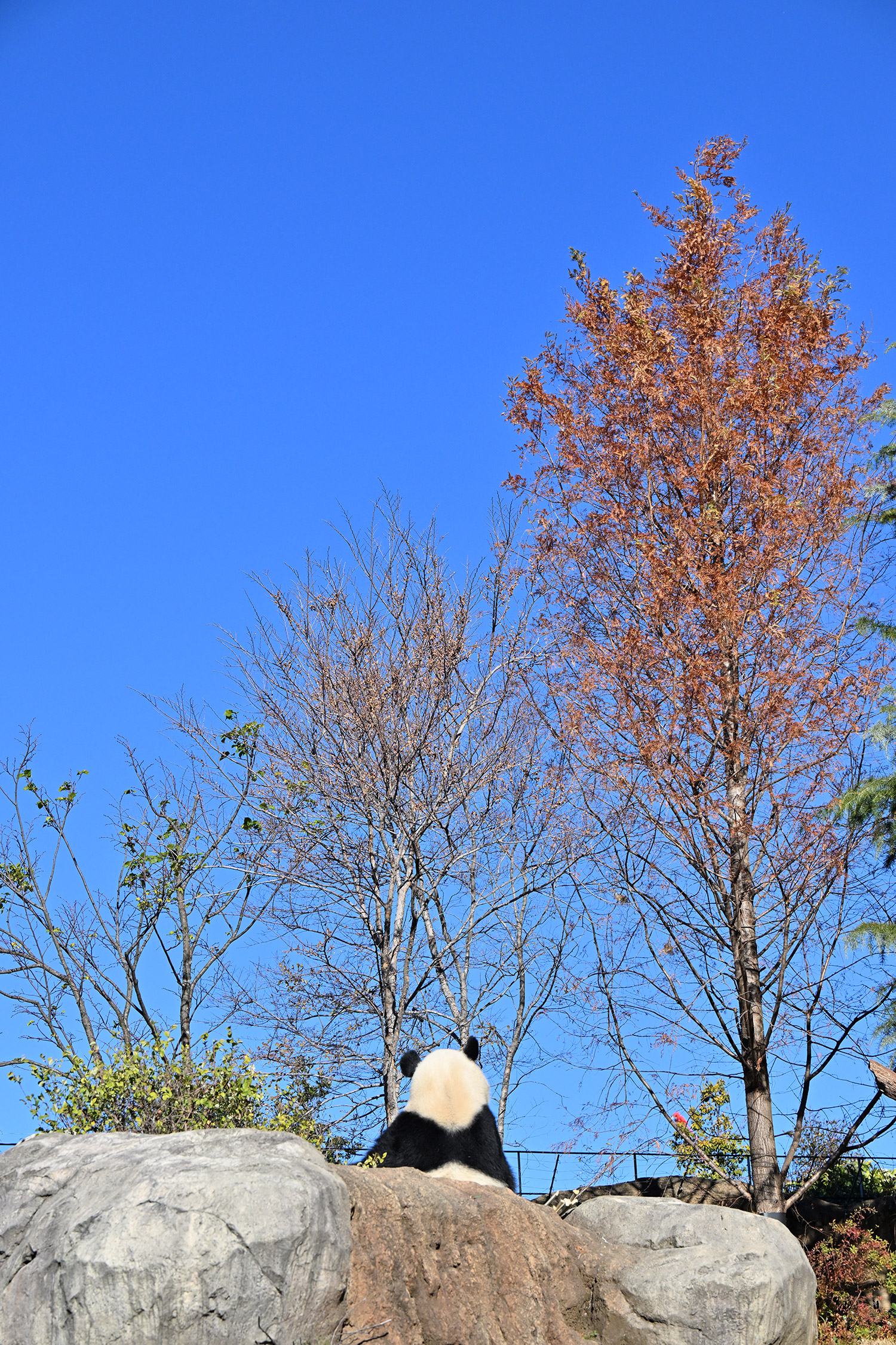 抜けるようなどこまでも澄み切った青空にシャオくん、なんて素敵なんでしょう‼️青い空と木々の紅葉と白黒のパンダさんが映えるこの光景をいつまでも見ていたいです☺️