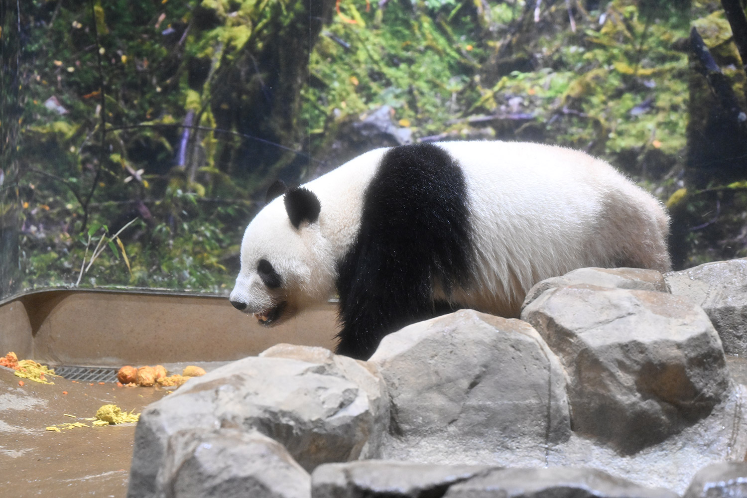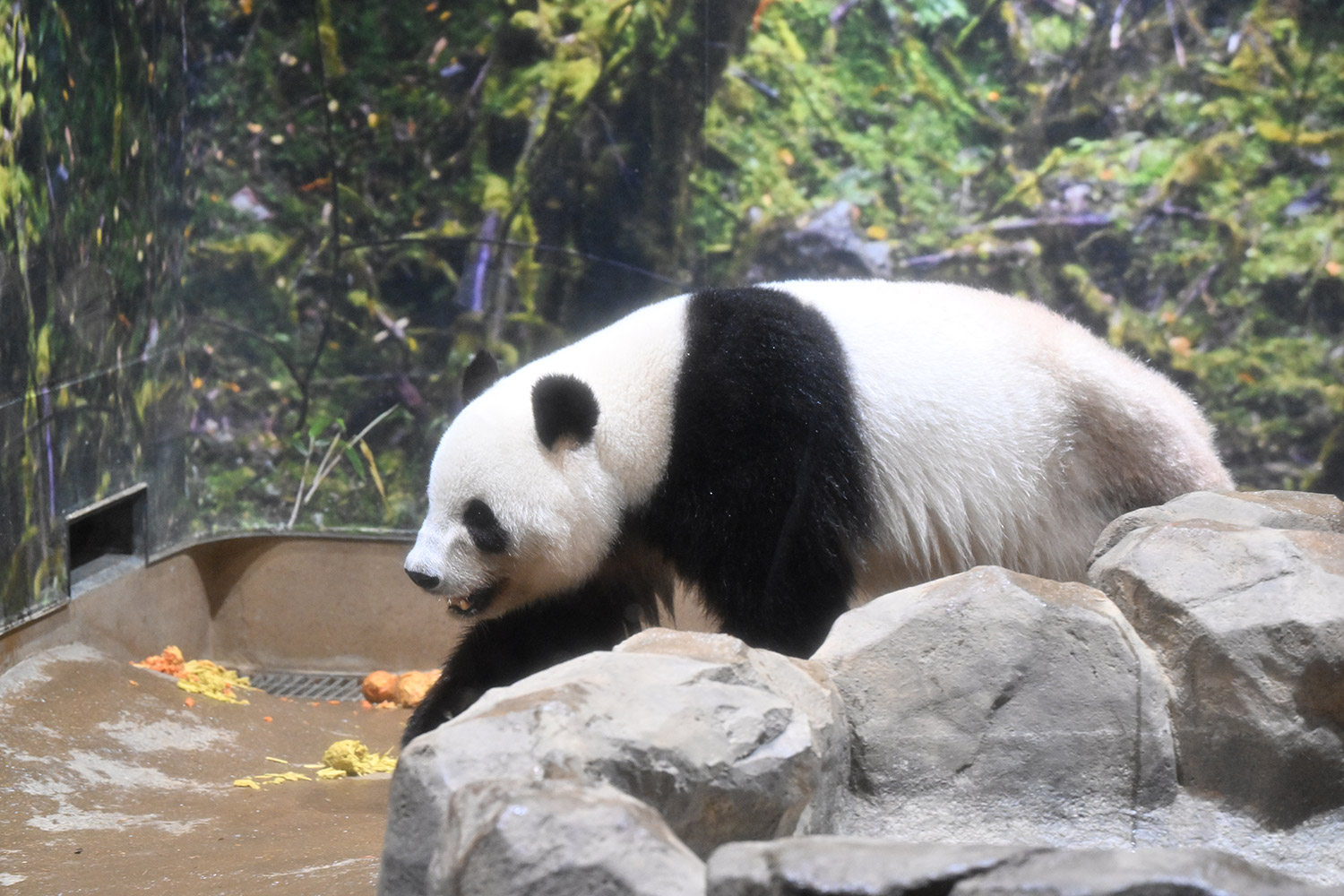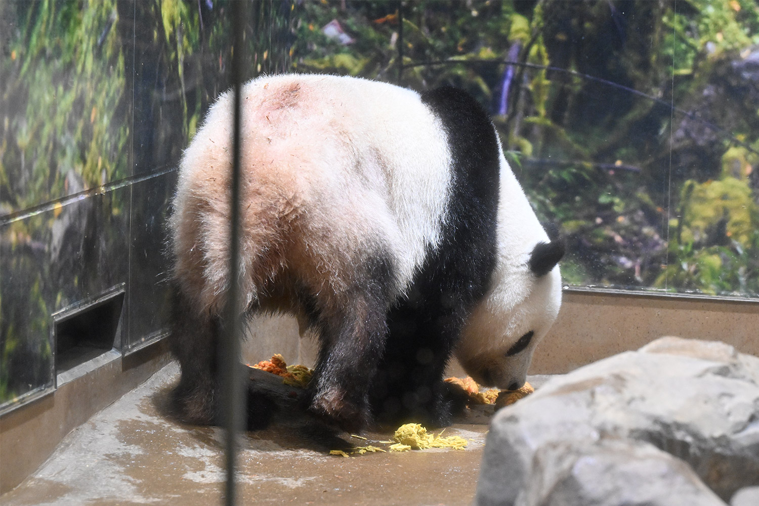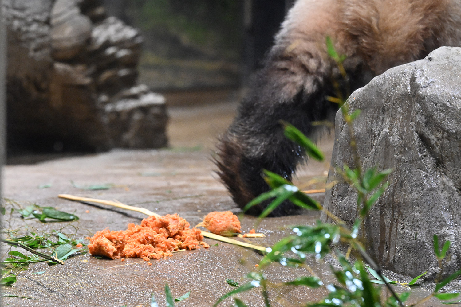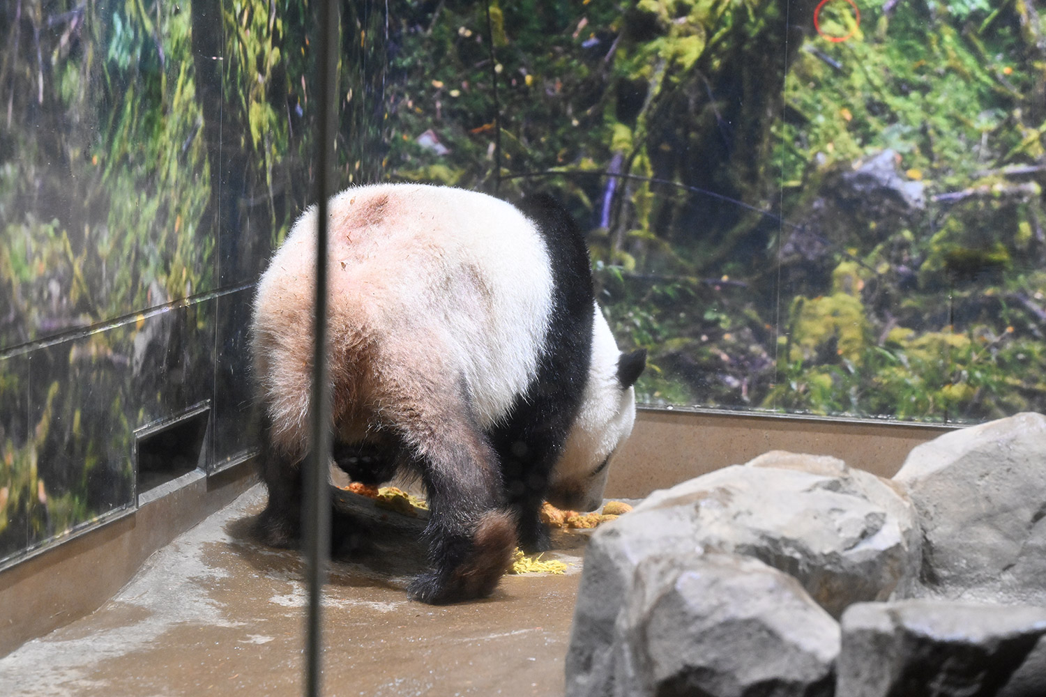 お水飲んでから左側に背を向けて竹を食べてました正面のお顔が見れなくて残念😞シャオもお外でお水飲んでから洞窟前で笹食べながらゲップ!すると林檎が出てきてそれをパックンと😂