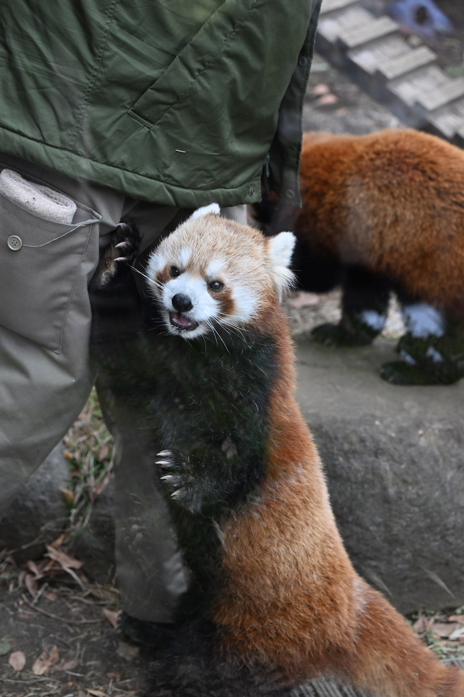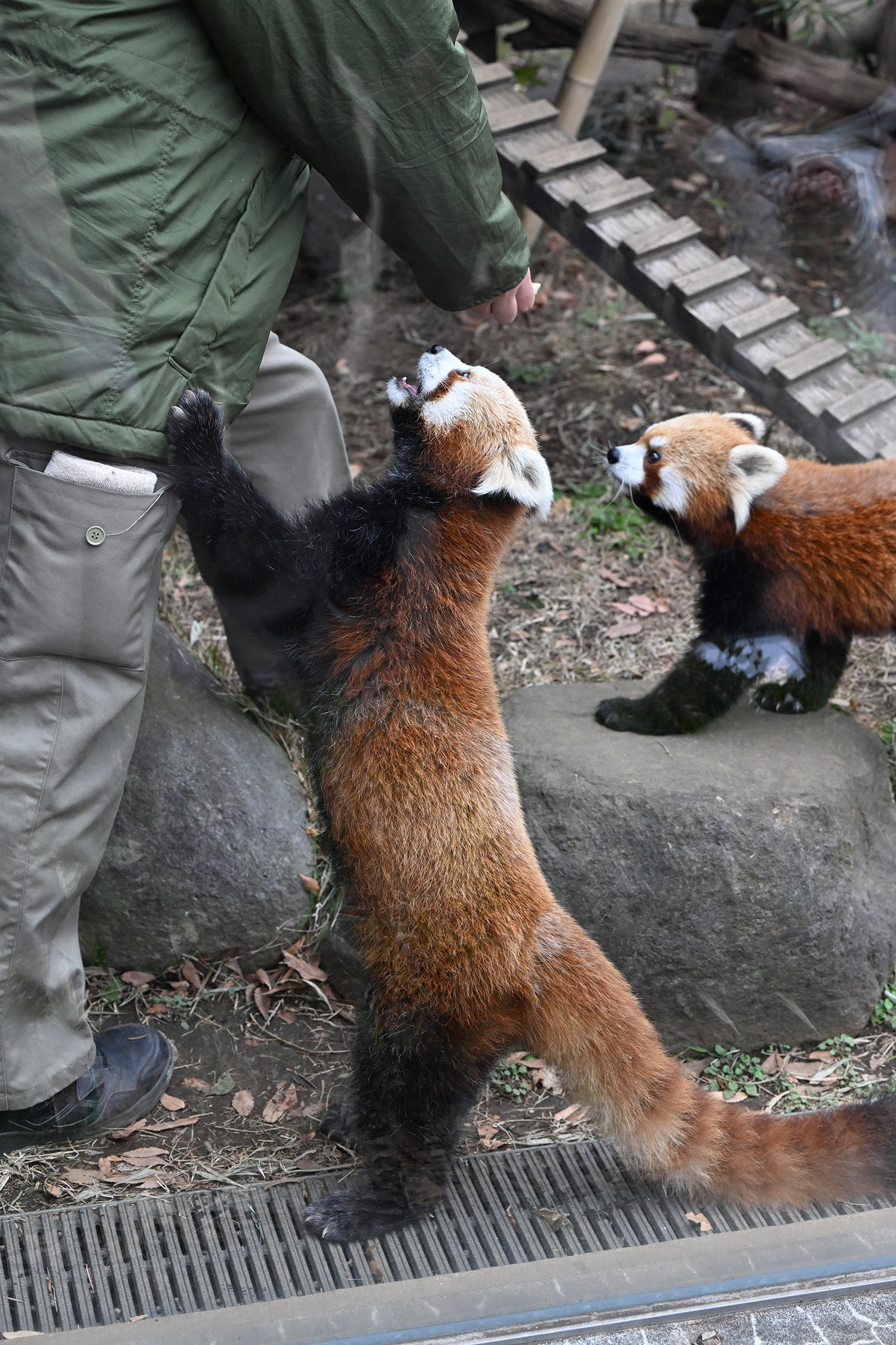 レッサーパンダのカリンちゃんとルカちゃん、飼育員さんにおねだりして、可愛い。