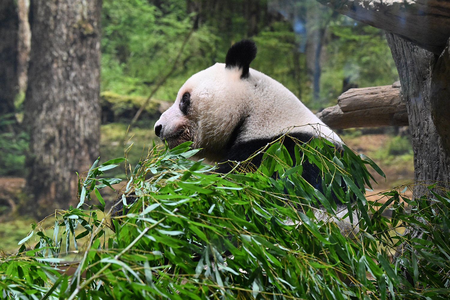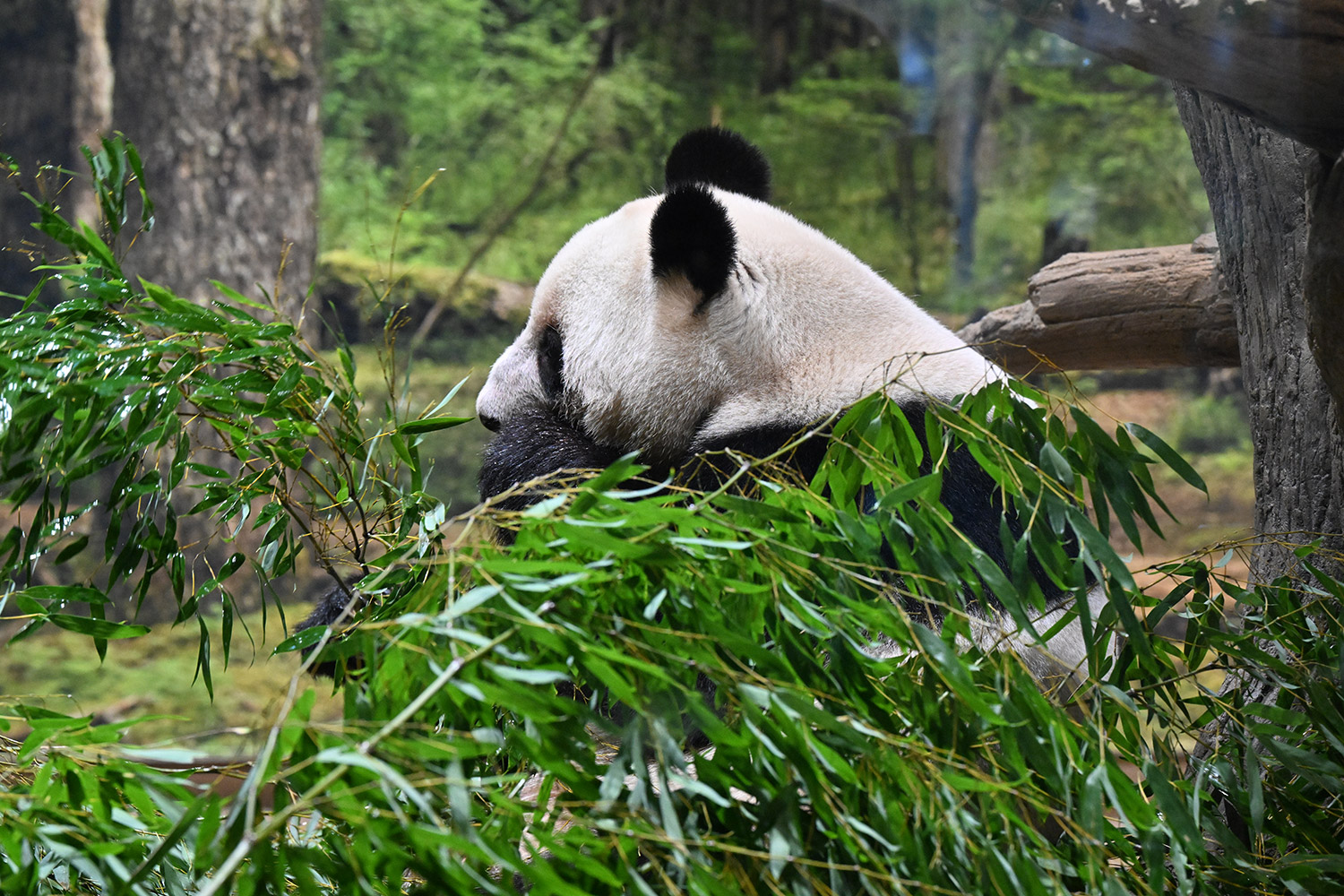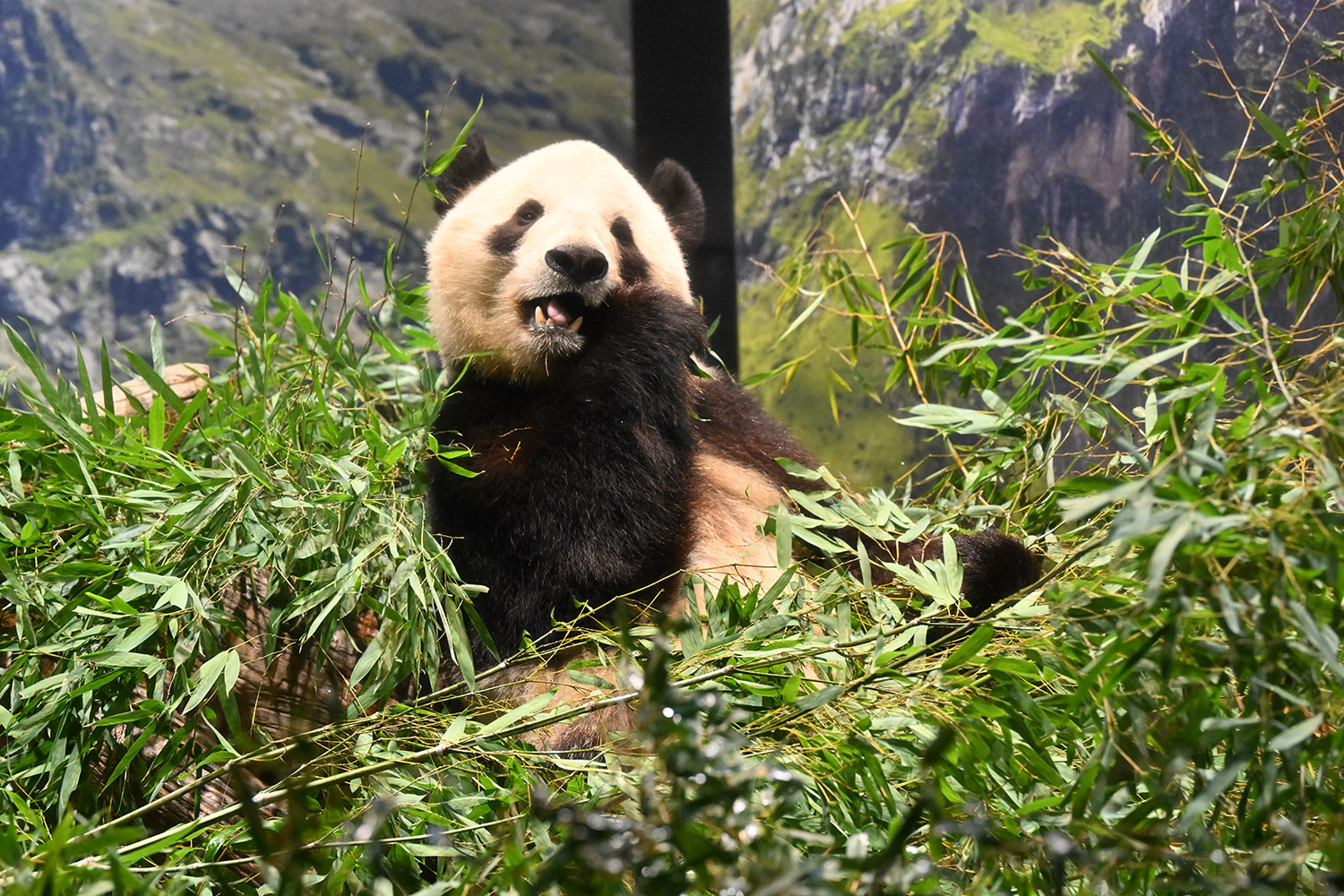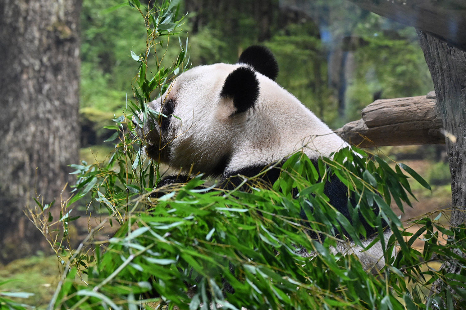 レイちゃんもぐもぐいっぱいごぱんいただきます😊シャオくん笹に囲まれていつものシャオスマイル😃