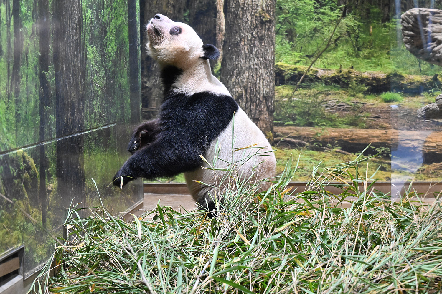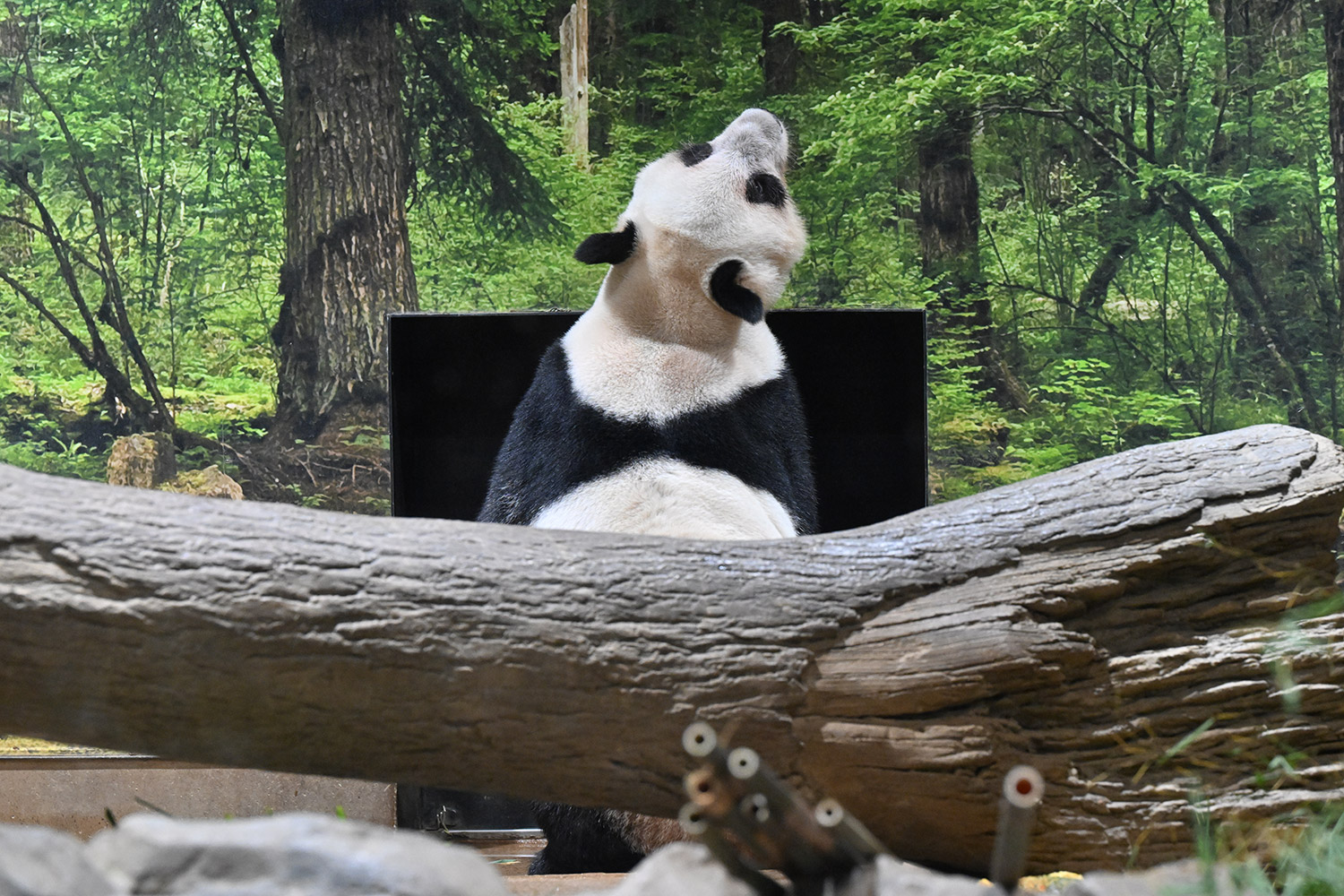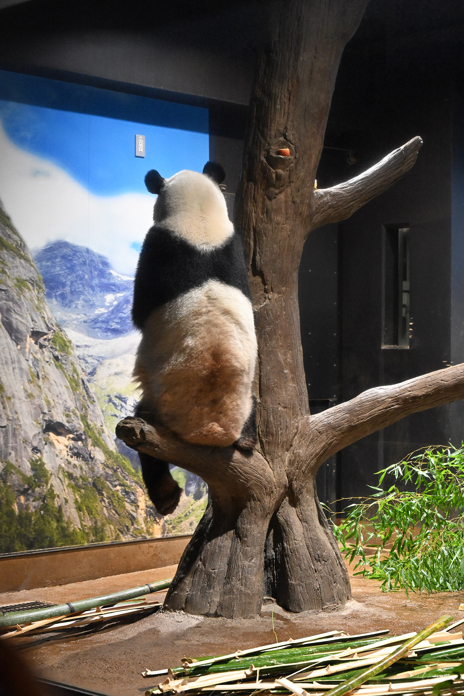 シャオシャオ擬木から山の景色を眺めて何を思っているのかな。リーリー、シンシン、シャンシャンから中国って山がいっぱい見えるよって聞いているのかな