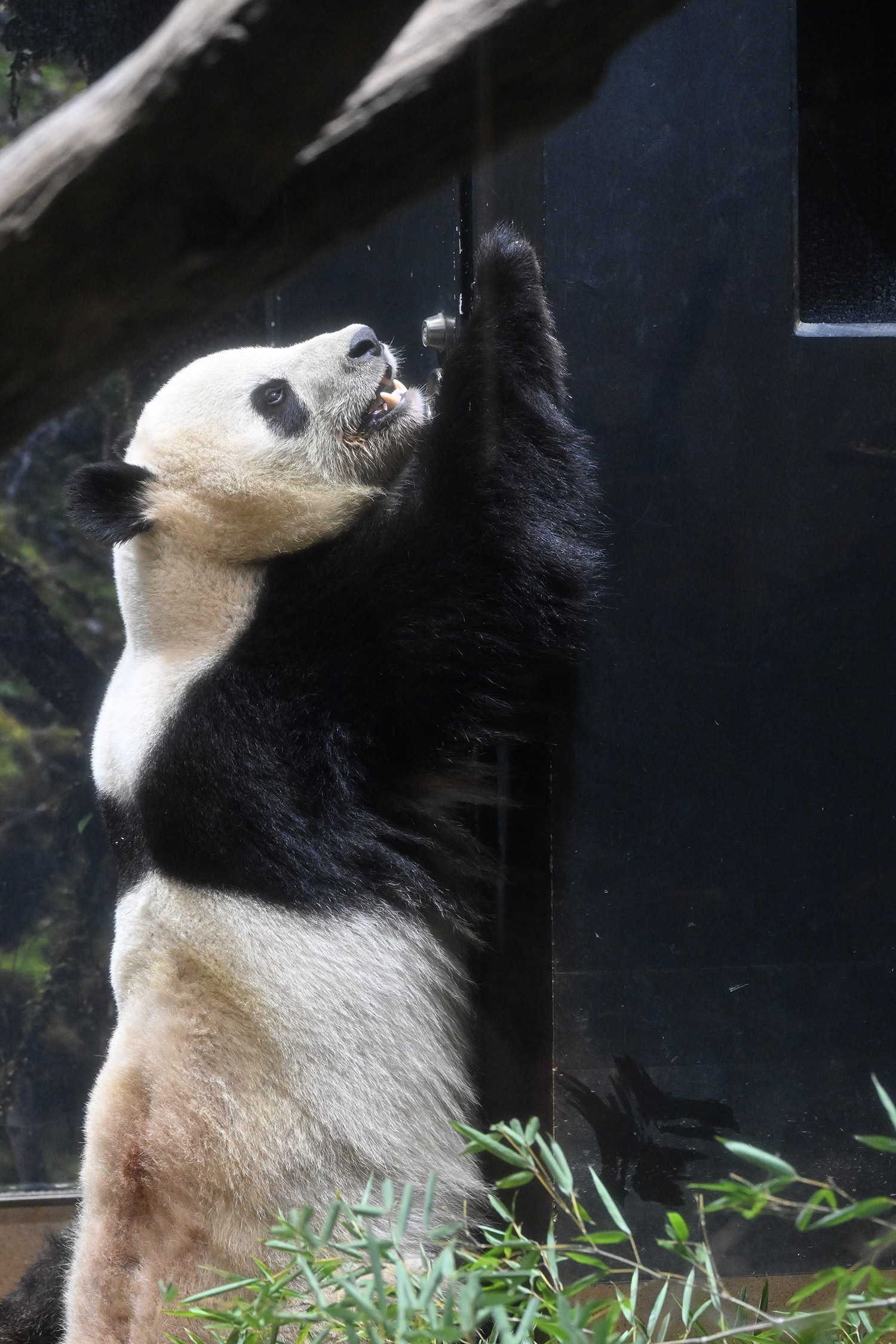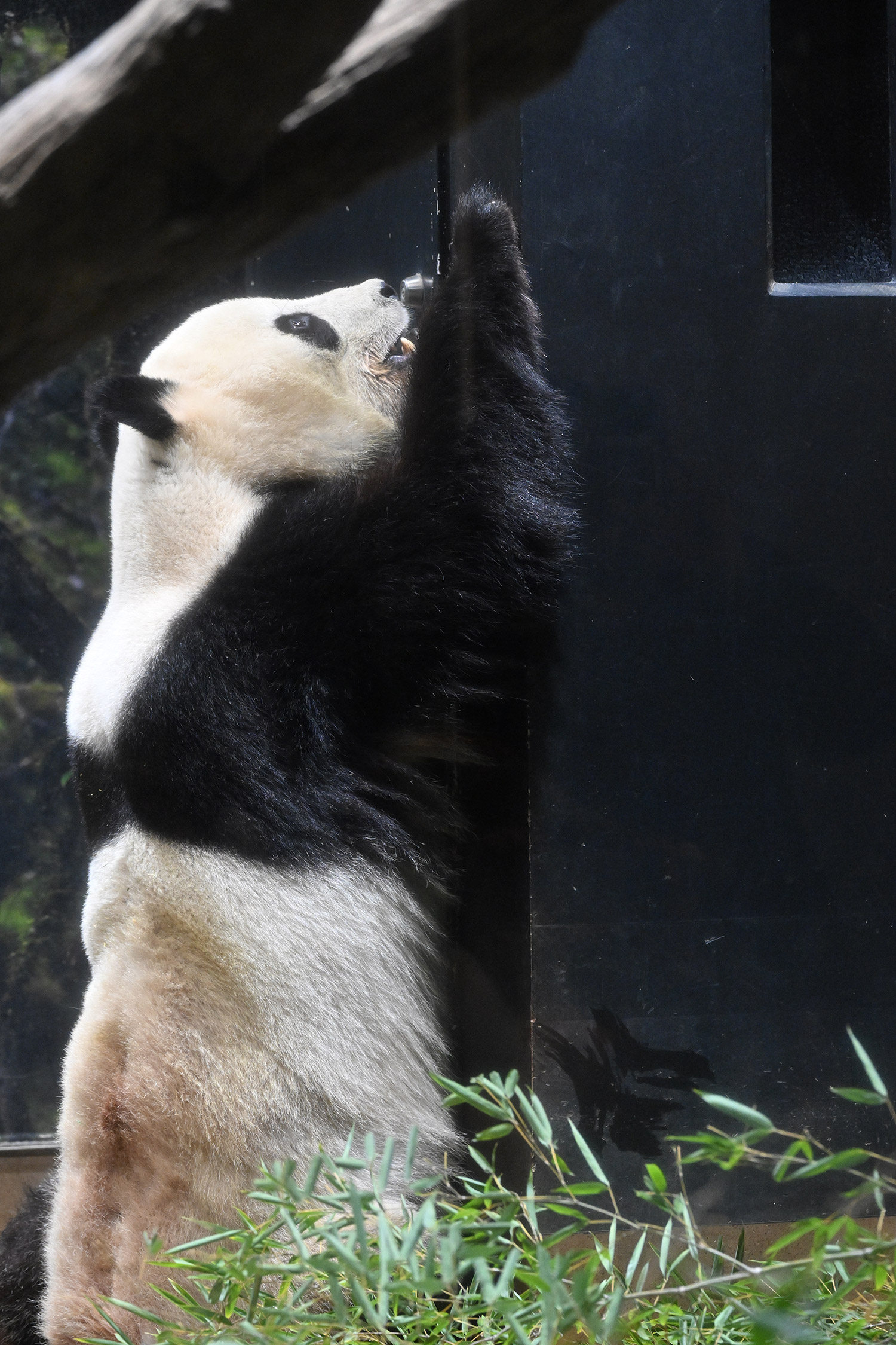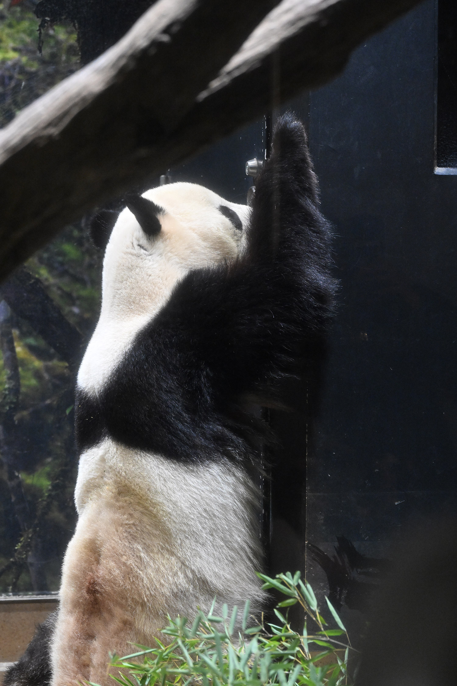 ❇️昨日ラスト観覧10:15~は、レイレイが室内の擬木に登り、竹筒チャレンジ中でした。最後の20秒ぐらい肉眼で見たら、頭が小刻みに震えて、相当の力で噛んでいると確認。室内続きで?真っ白な毛皮!
