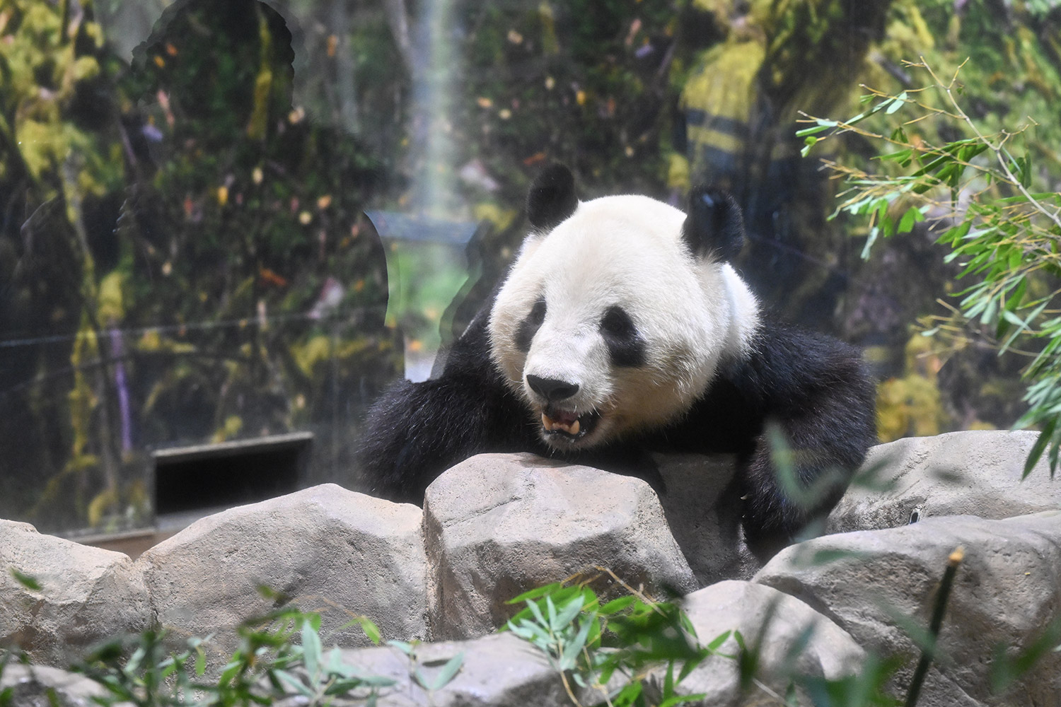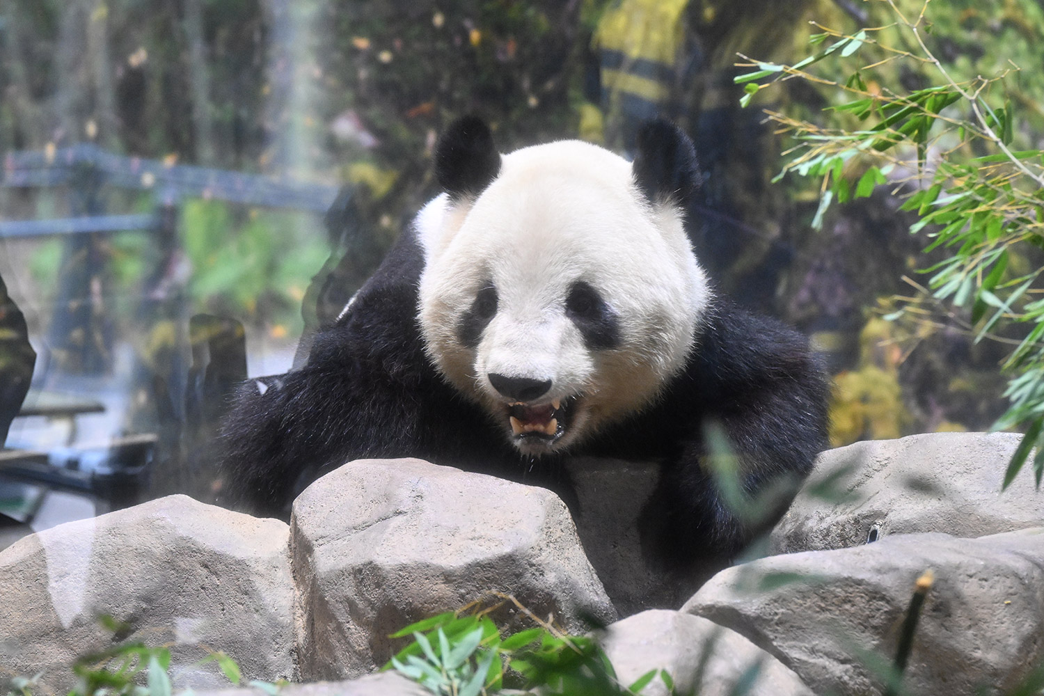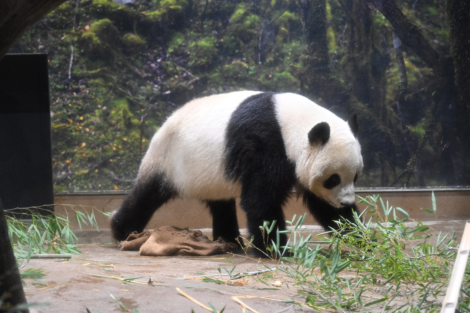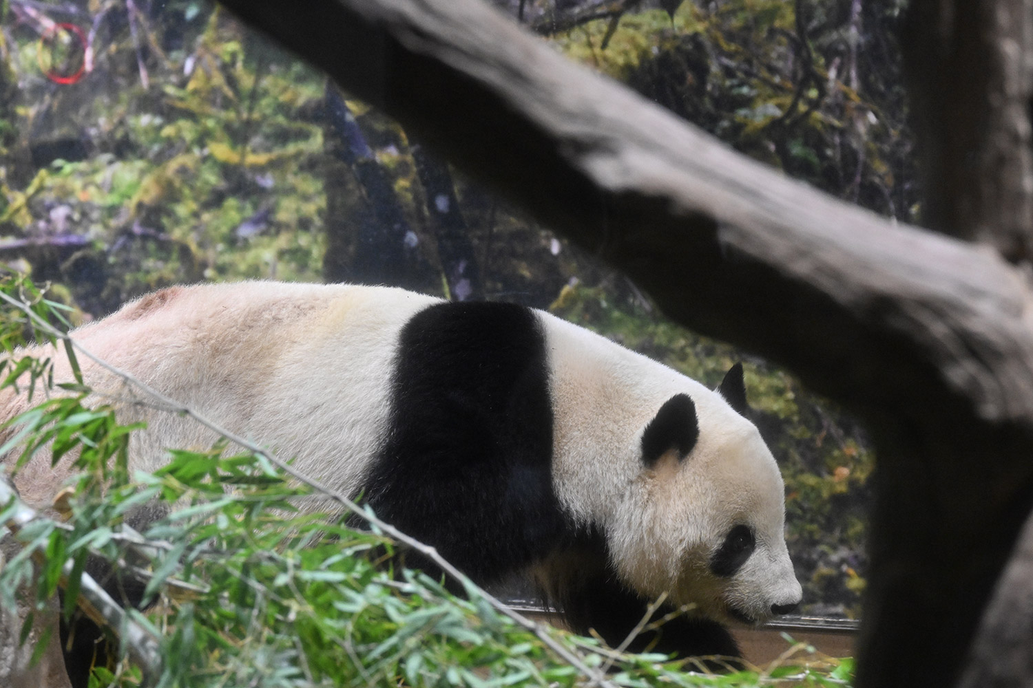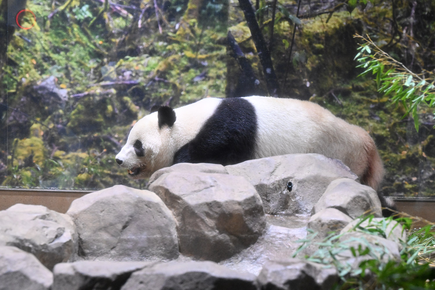 レイちゃん、たくさんの竹の向こうで寝ていました。顔は見えない。次の1分スペースへ。お顔が見えました。竹の葉っぱが邪魔でしたが。寝顔も可愛いパンダ。そして、一瞬動いたレイちゃん。慌ててシャッターを切ると、奇跡の1枚が。左手を上げて、笑顔のバイバイポーズのレイちゃんが写っていました。ボケボケでしたが、笑顔でレイちゃんが挨拶してくれたと勝手に受け止めました。