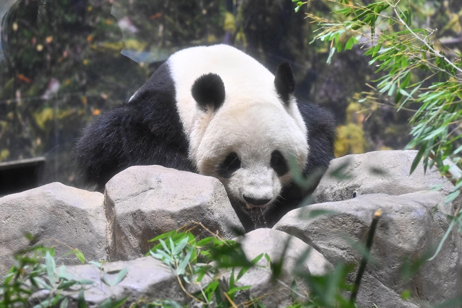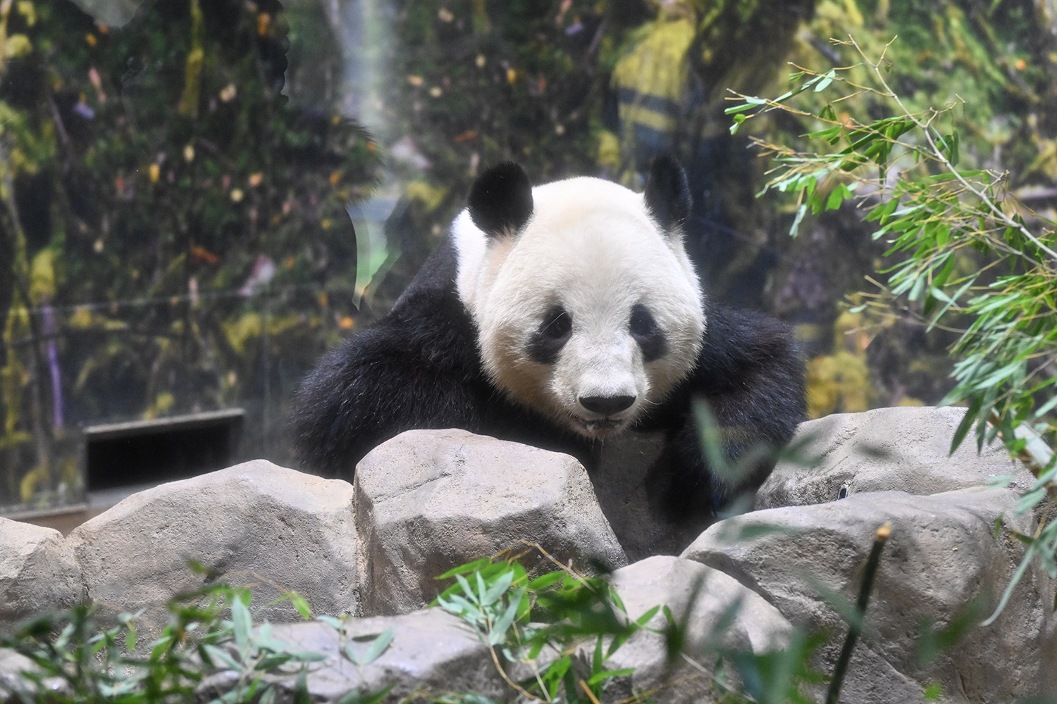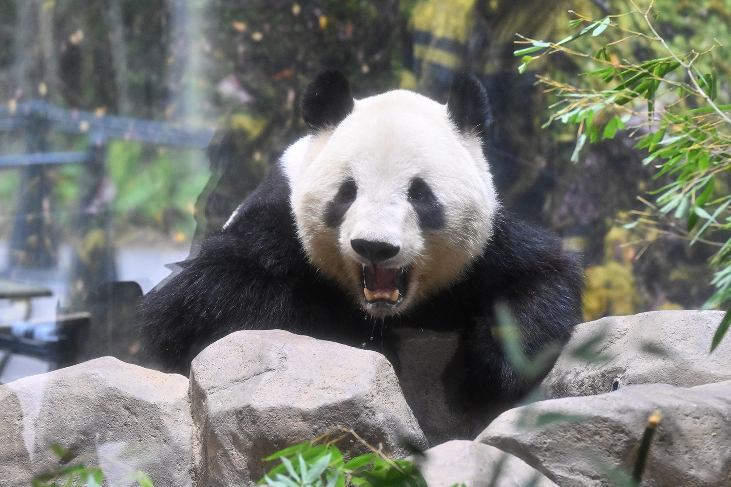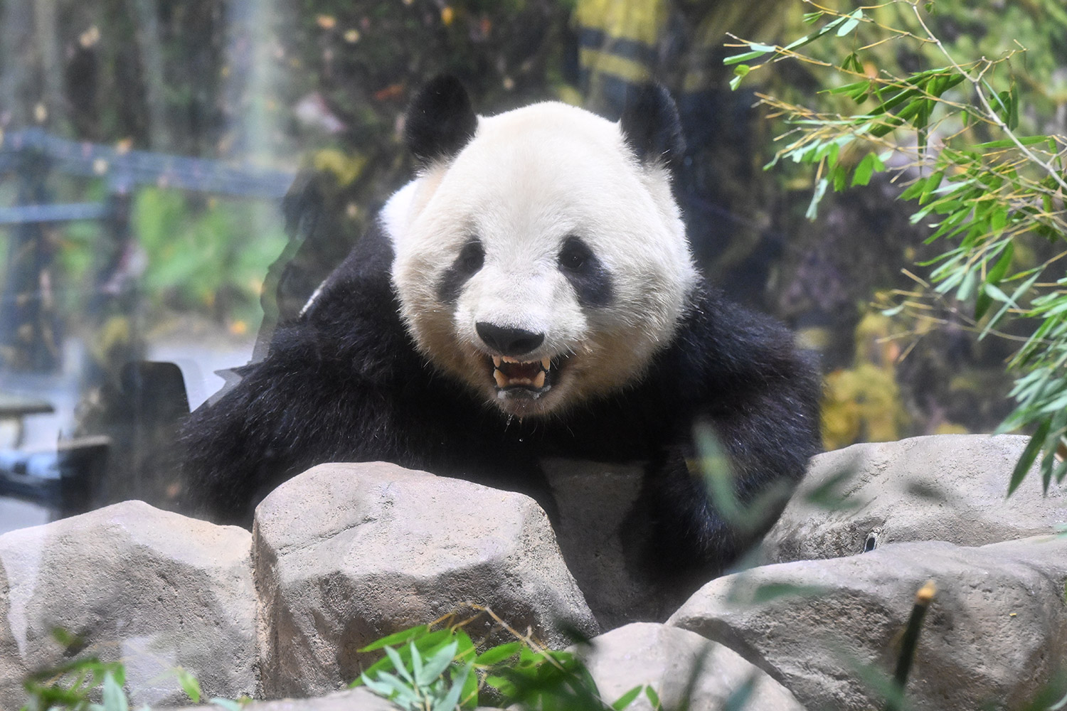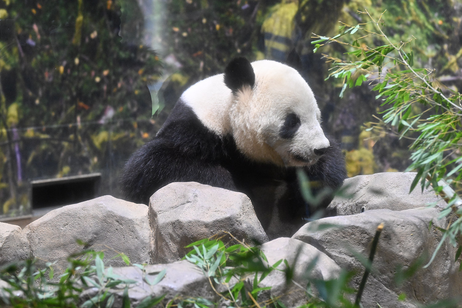 レイちゃん、たくさんの竹の向こうで寝ていました。顔は見えない。次の1分スペースへ。お顔が見えました。竹の葉っぱが邪魔でしたが。寝顔も可愛いパンダ。そして、一瞬動いたレイちゃん。慌ててシャッターを切ると、奇跡の1枚が。左手を上げて、笑顔のバイバイポーズのレイちゃんが写っていました。ボケボケでしたが、笑顔でレイちゃんが挨拶してくれたと勝手に受け止めました。
