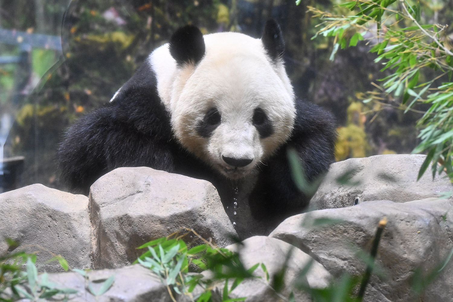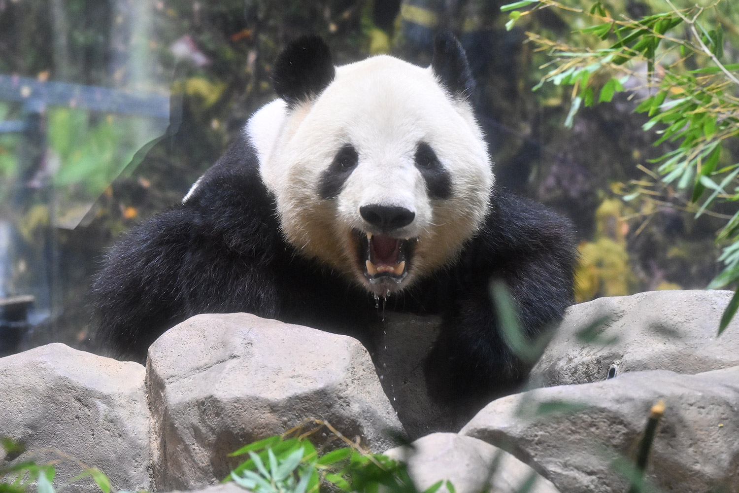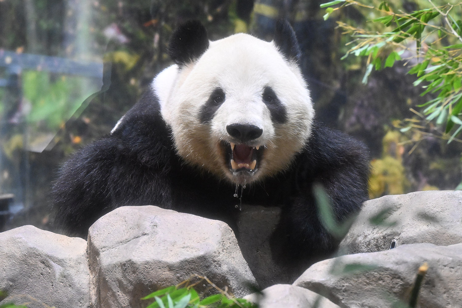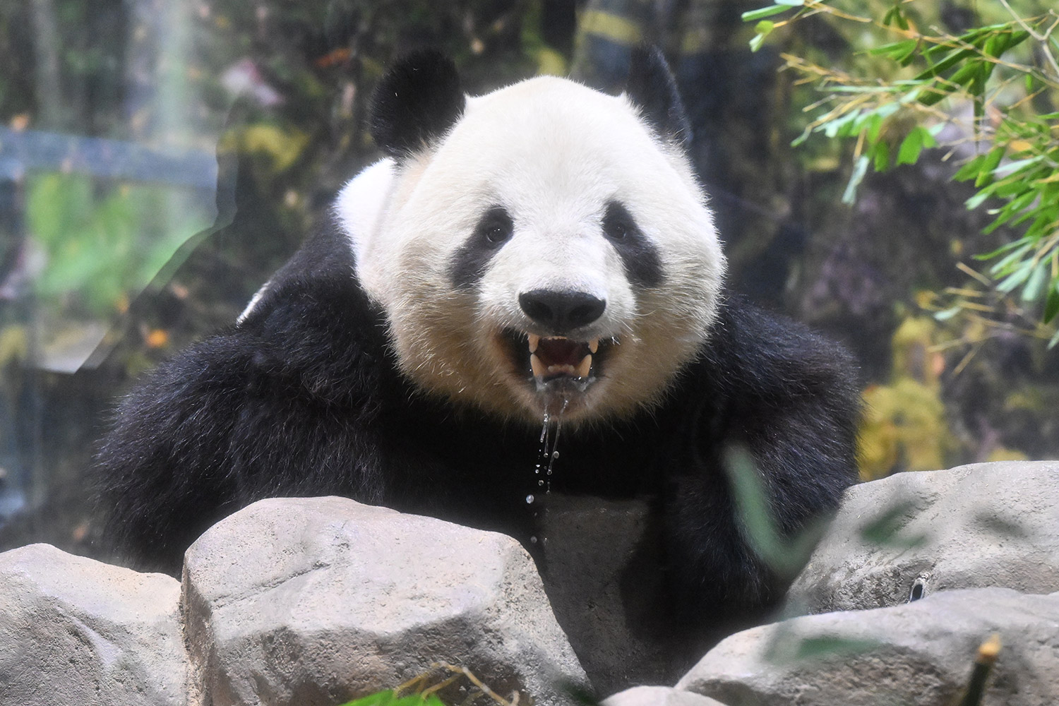 シャオくんのお水ごくごくの後のお口開けている顔が笑っているようなカメラ目線!?水滴もくっきりで愛らしい💕竹を味わいながらしっかり食事中のレイちゃん、明日の園の報告では体重増えてるかしら?日本の竹の味忘れないでね☺️