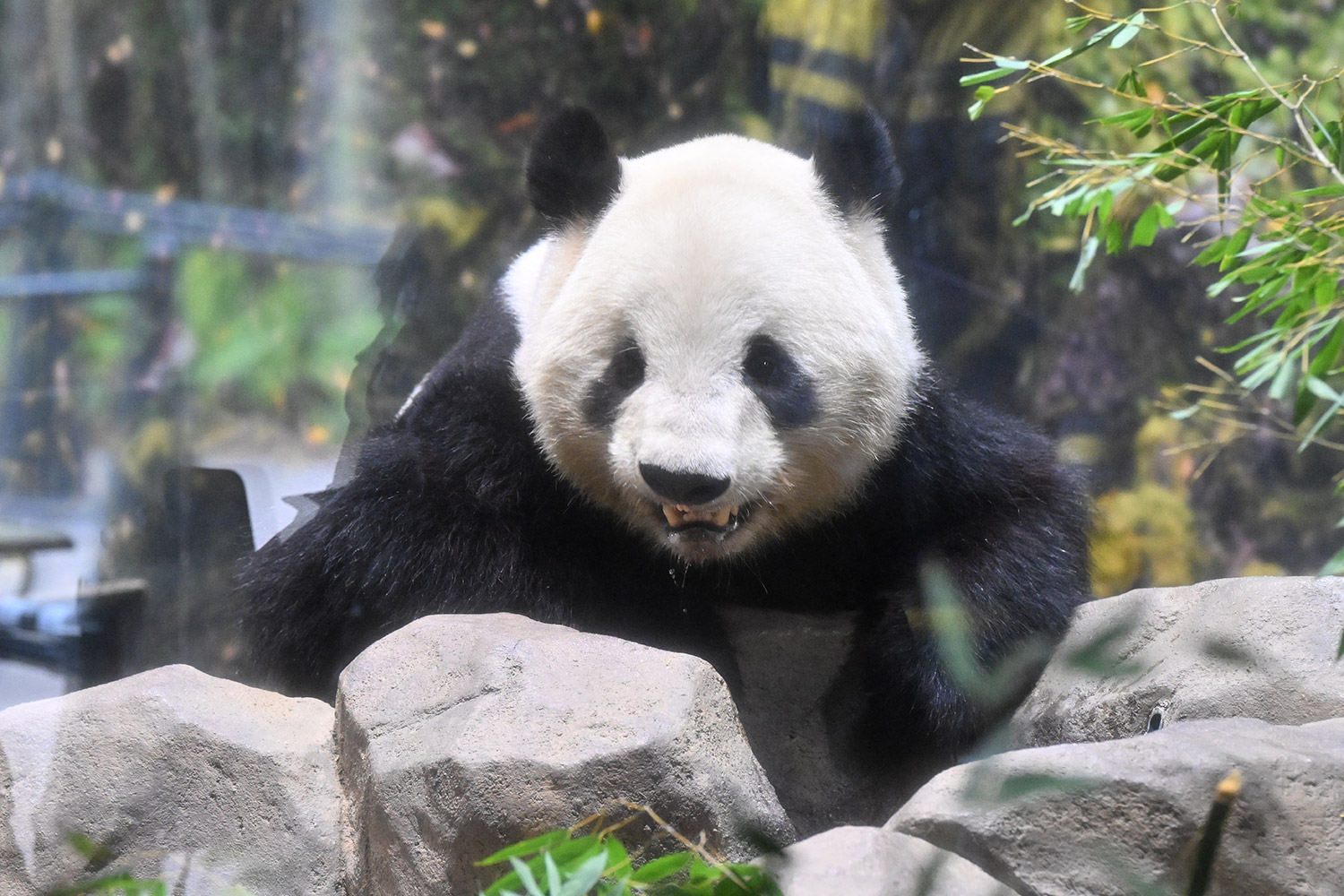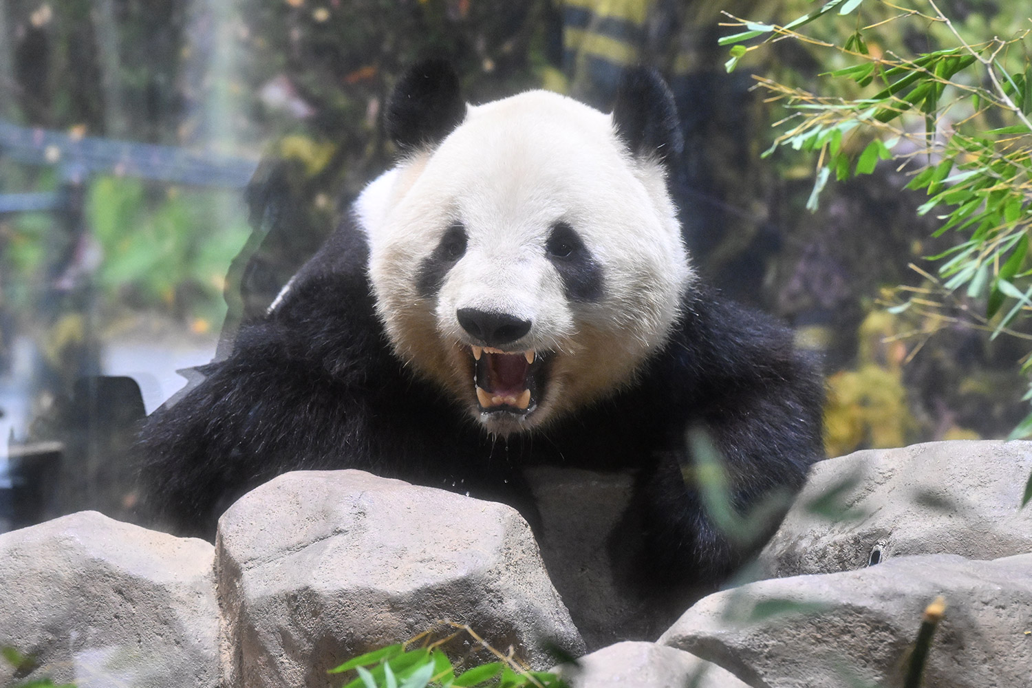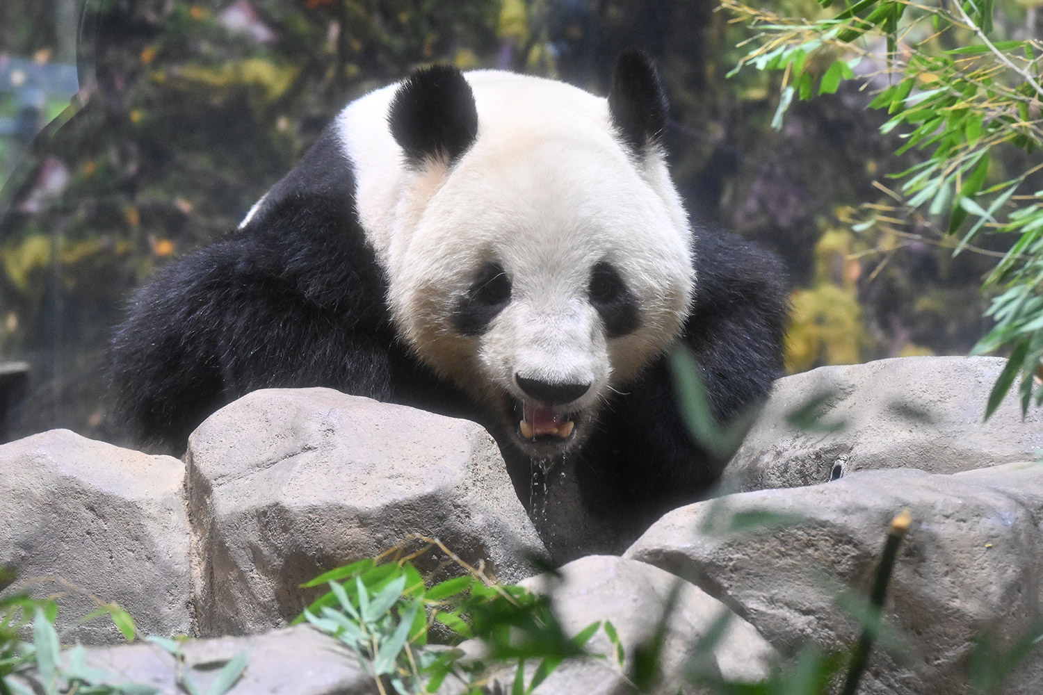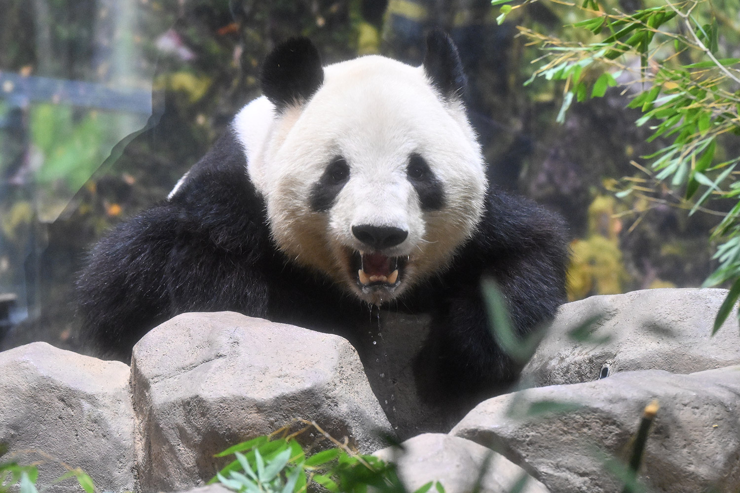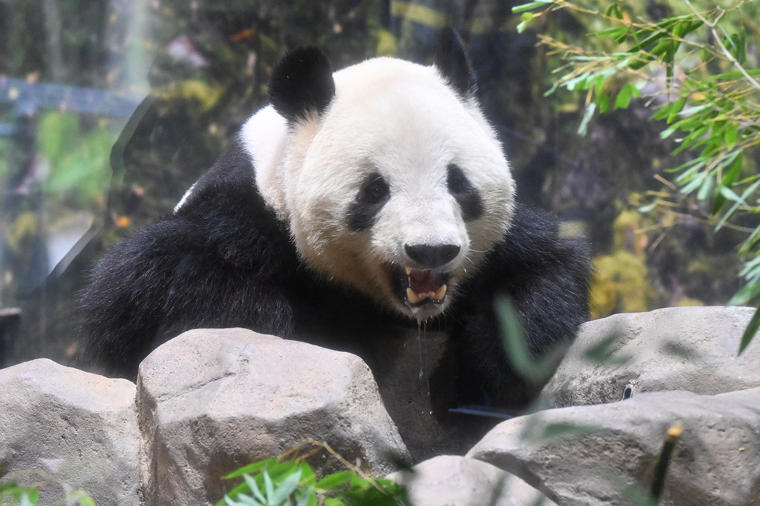 シャオくんのお水ごくごくの後のお口開けている顔が笑っているようなカメラ目線!?水滴もくっきりで愛らしい💕竹を味わいながらしっかり食事中のレイちゃん、明日の園の報告では体重増えてるかしら?日本の竹の味忘れないでね☺️