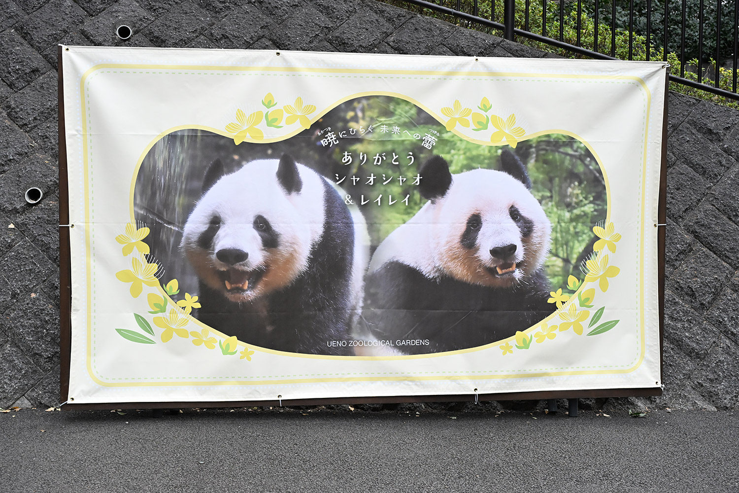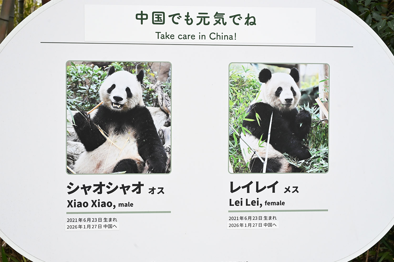 ふたりを紹介する看板に「中国でも元気でね」というステッカーが貼られ、これまで愛情込めてお世話された飼育員さん、スタッフさん、警備員さんの気持ちが込められているようで号泣😭