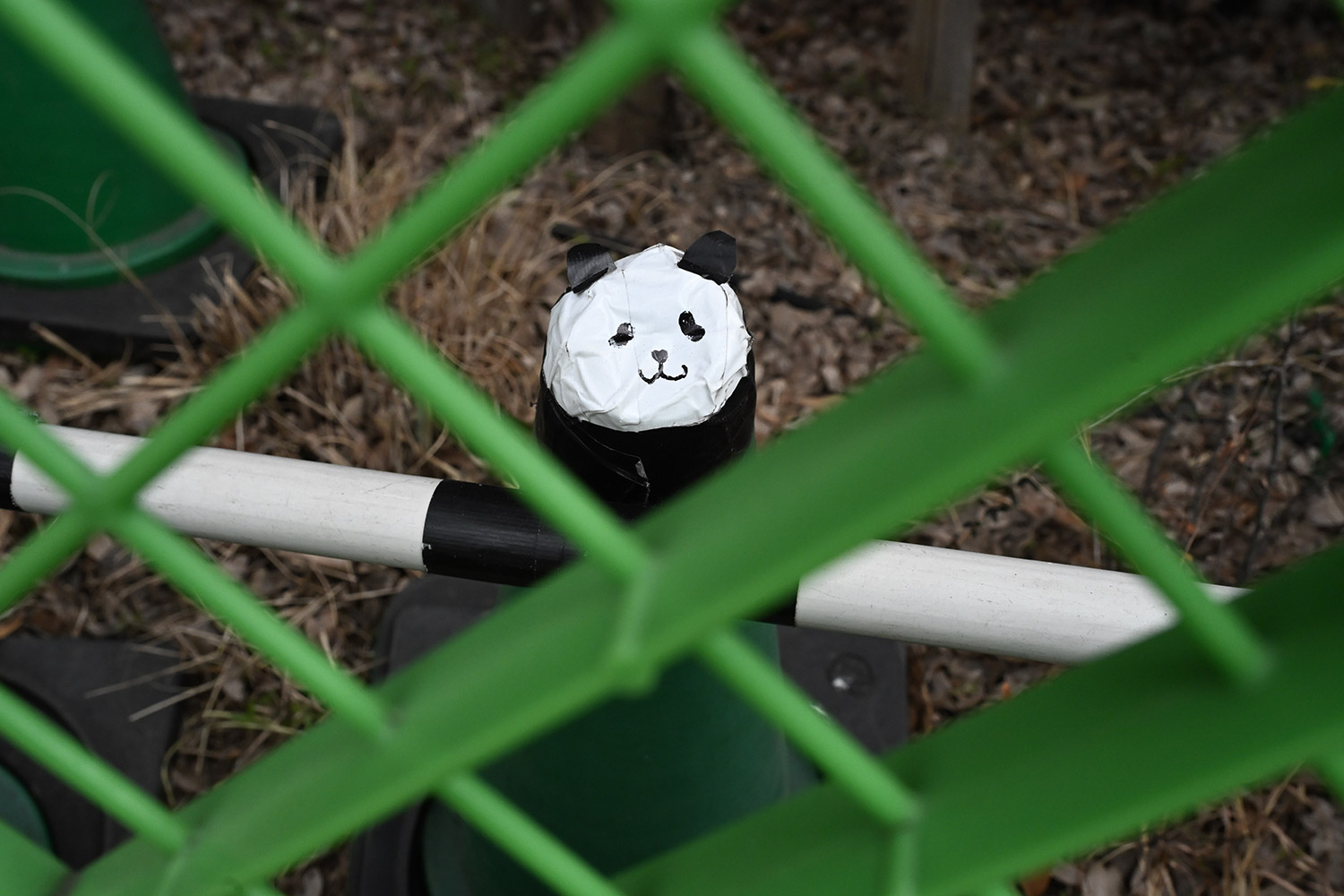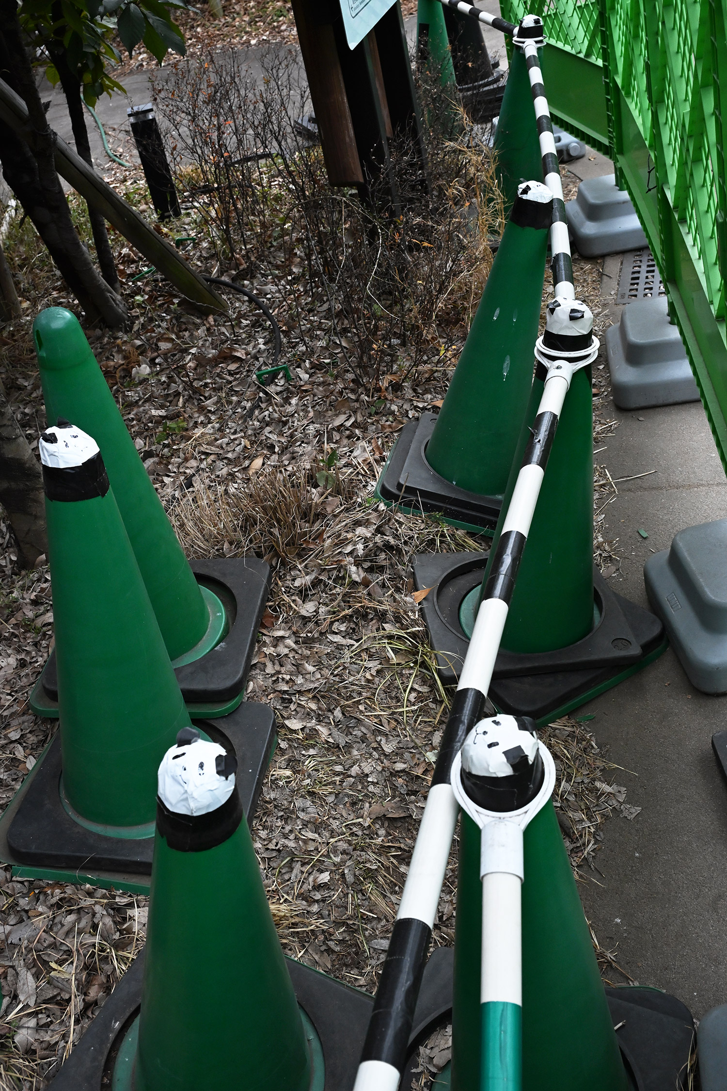 レイちゃんのいた場所、緑のコーンに貼られたテープで作られたパンダの顔。並んでいる時はほっこりしましたが、今日はなんだか淋しげな顔に見えます🥹
