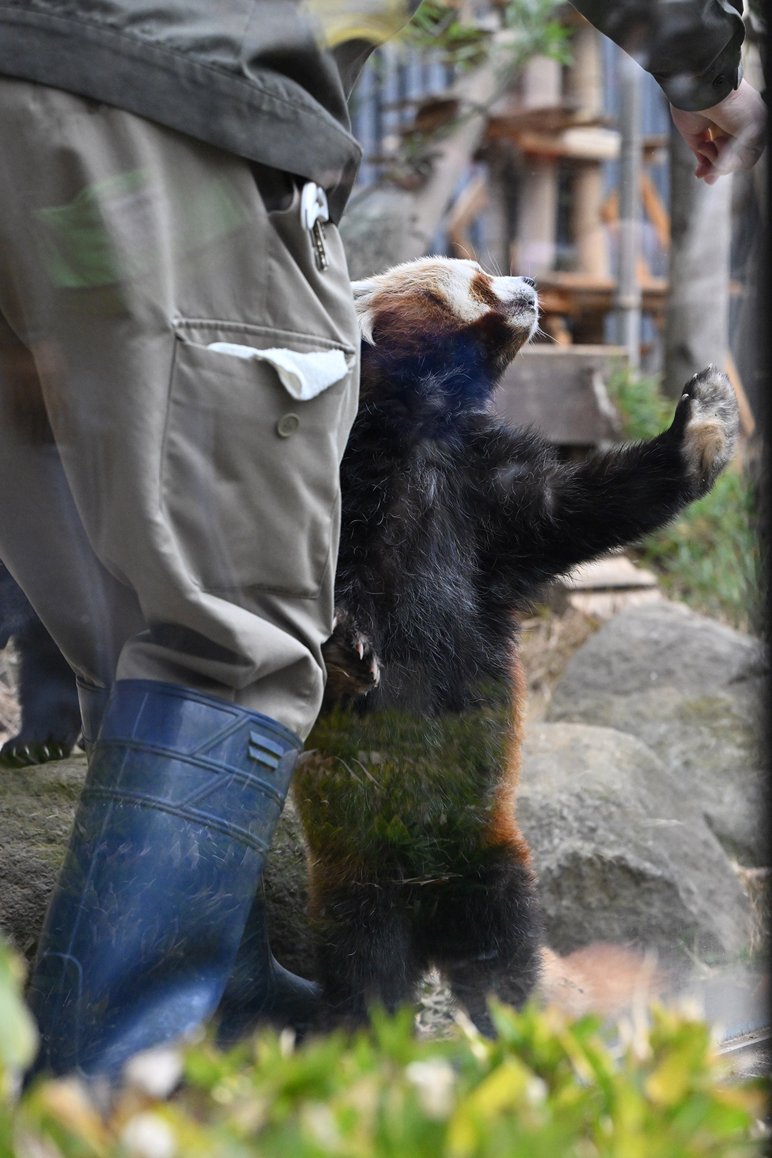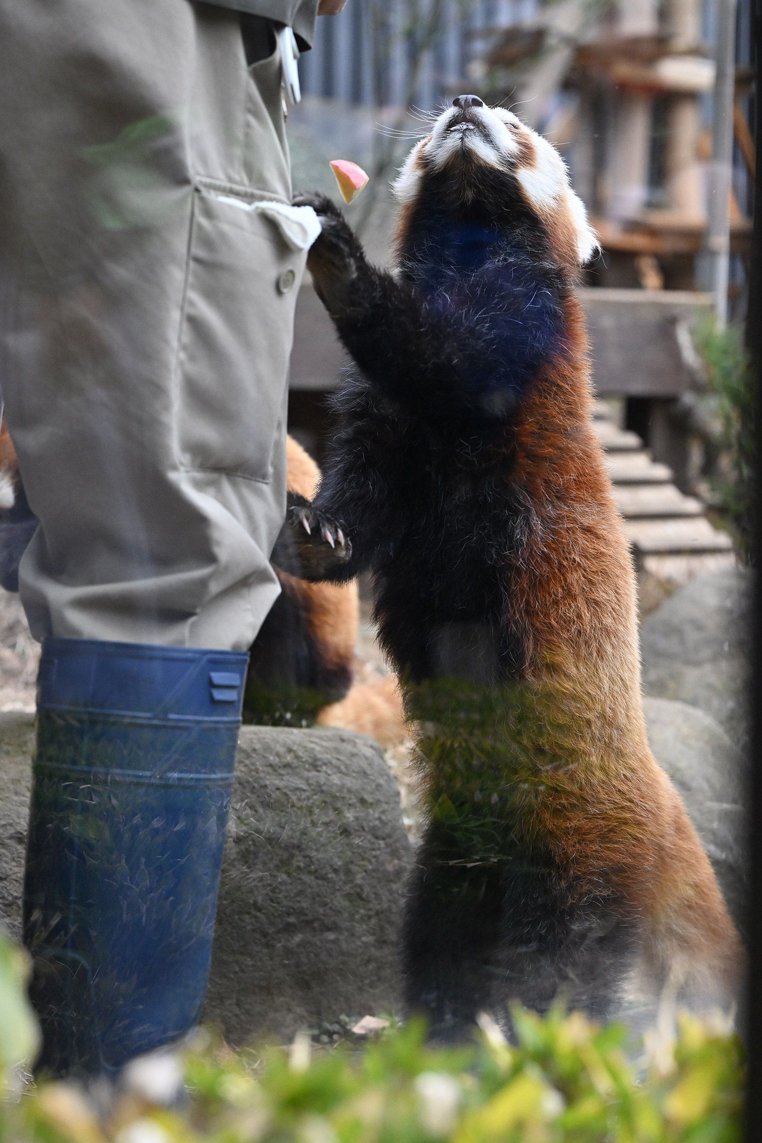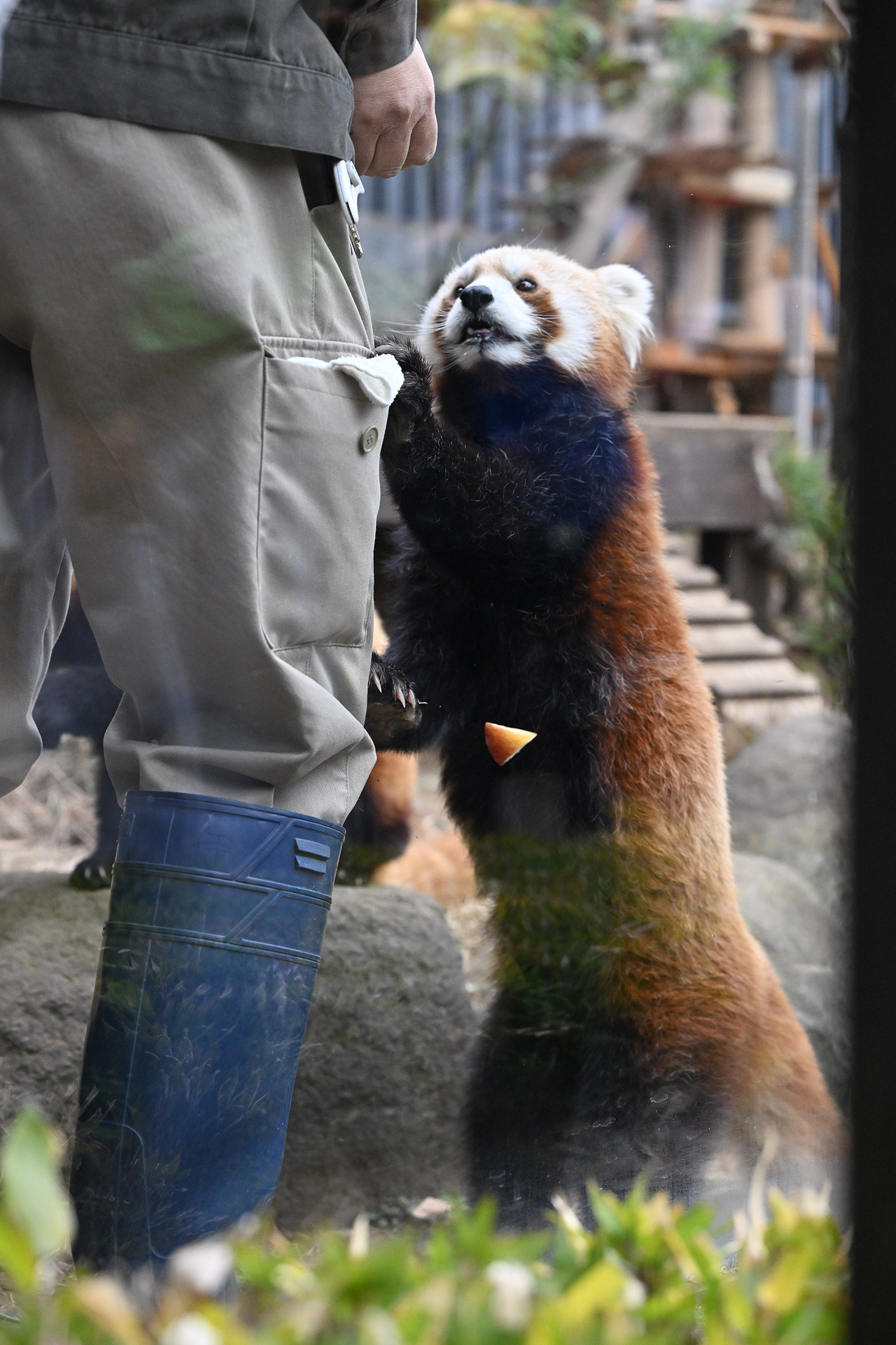 レッサーパンダ、飼育員さんにおねだりしている姿、カメラ目線でじっとみつめるお顔、可愛いです。