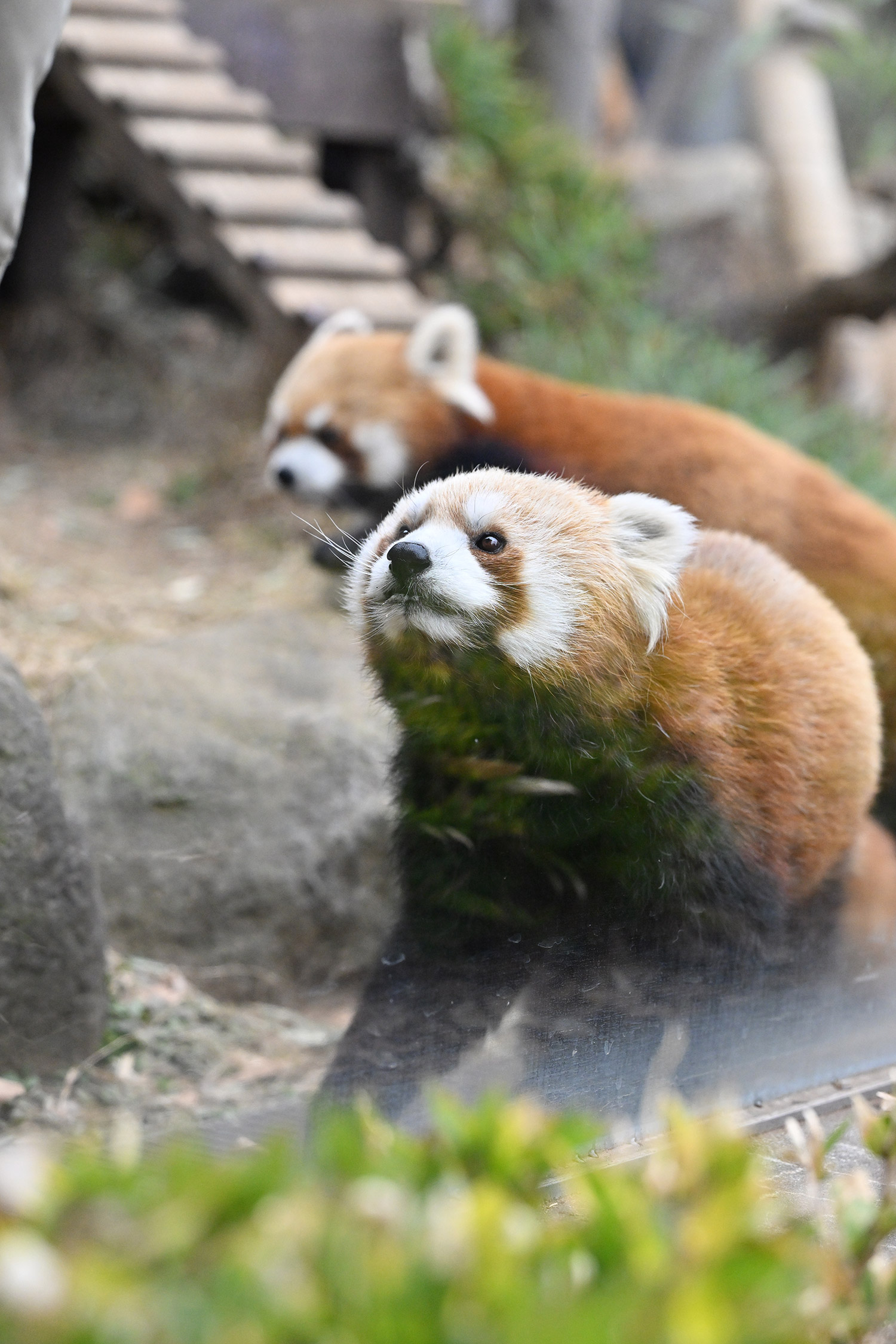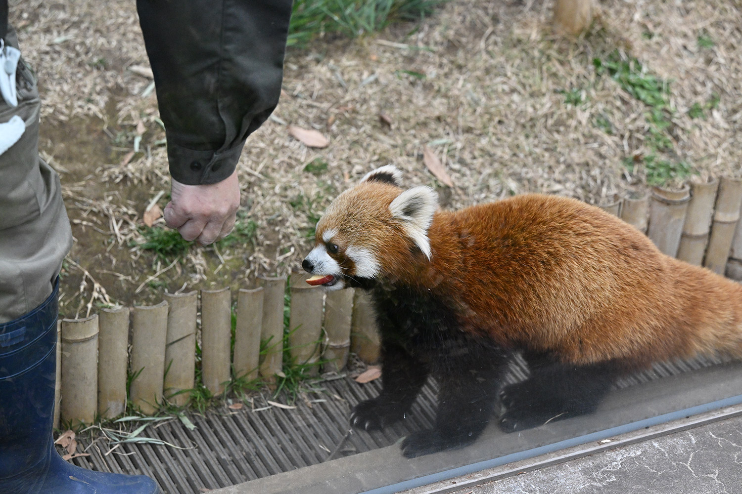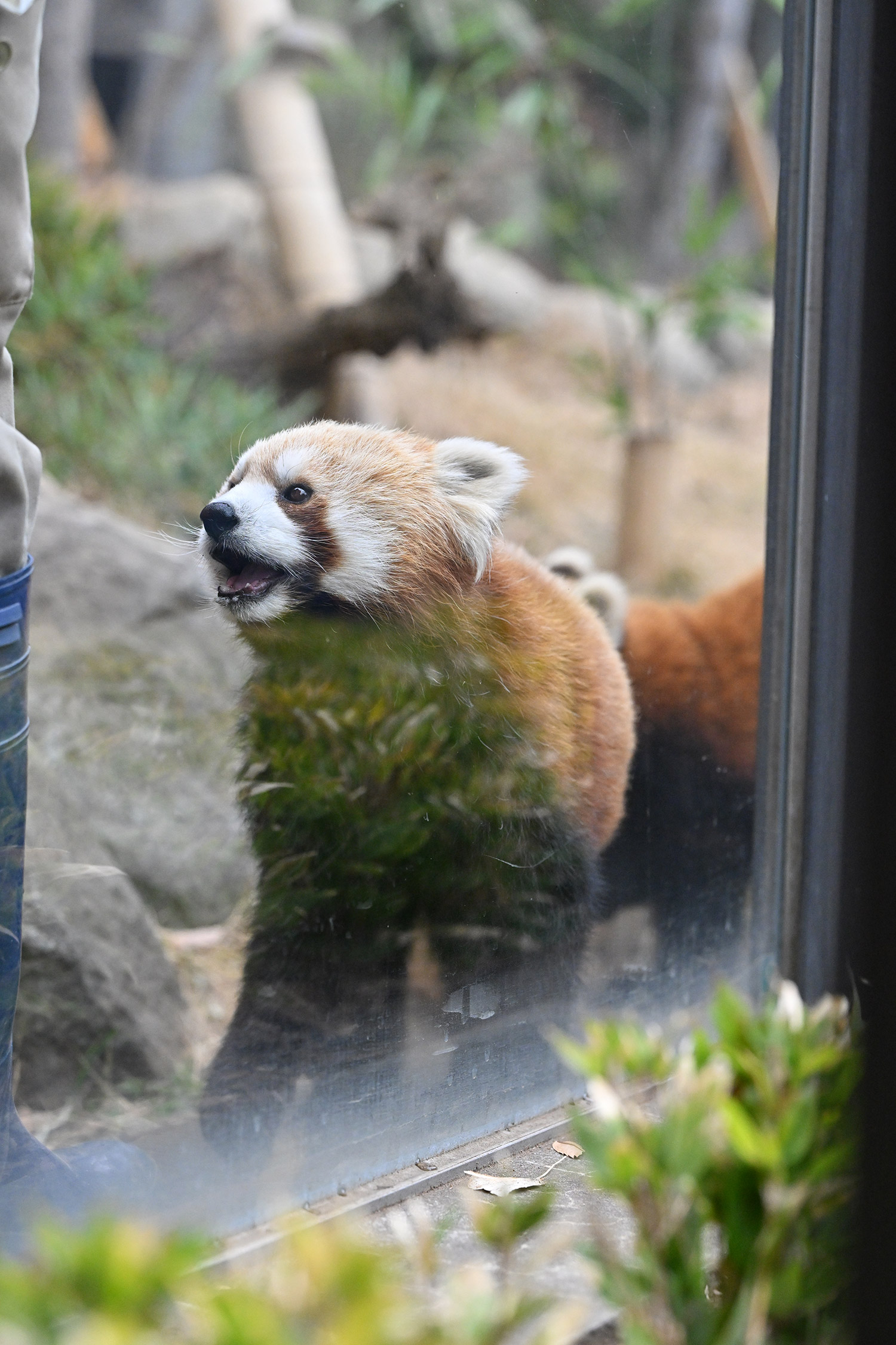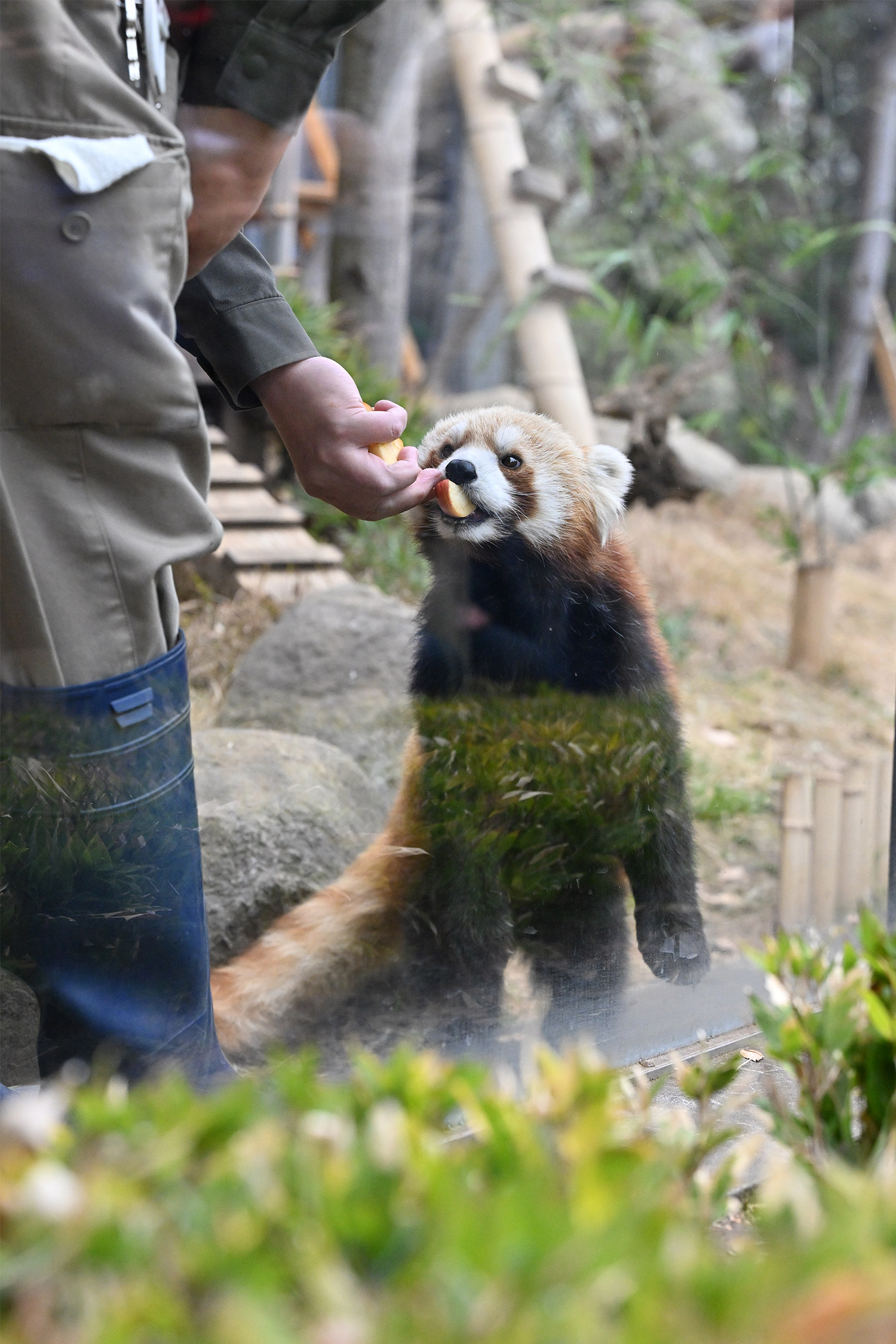 レッサーパンダ、飼育員さんにおねだりしている姿、カメラ目線でじっとみつめるお顔、可愛いです。