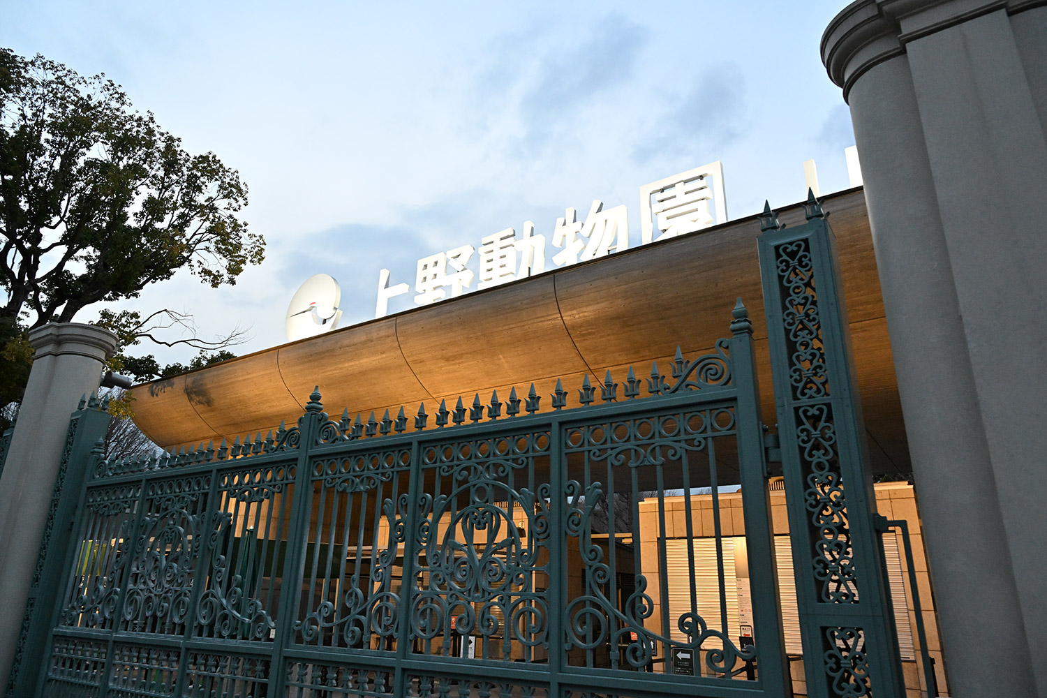 証明に浮かび上がる上野動物園の正門、綺麗ですね。