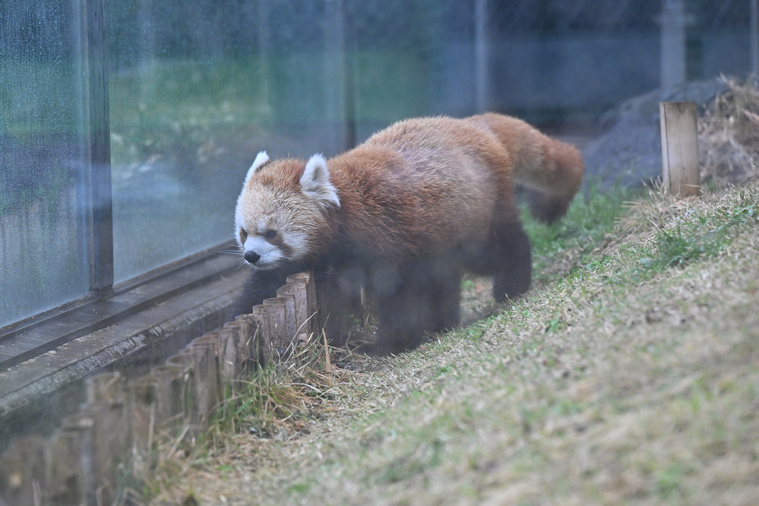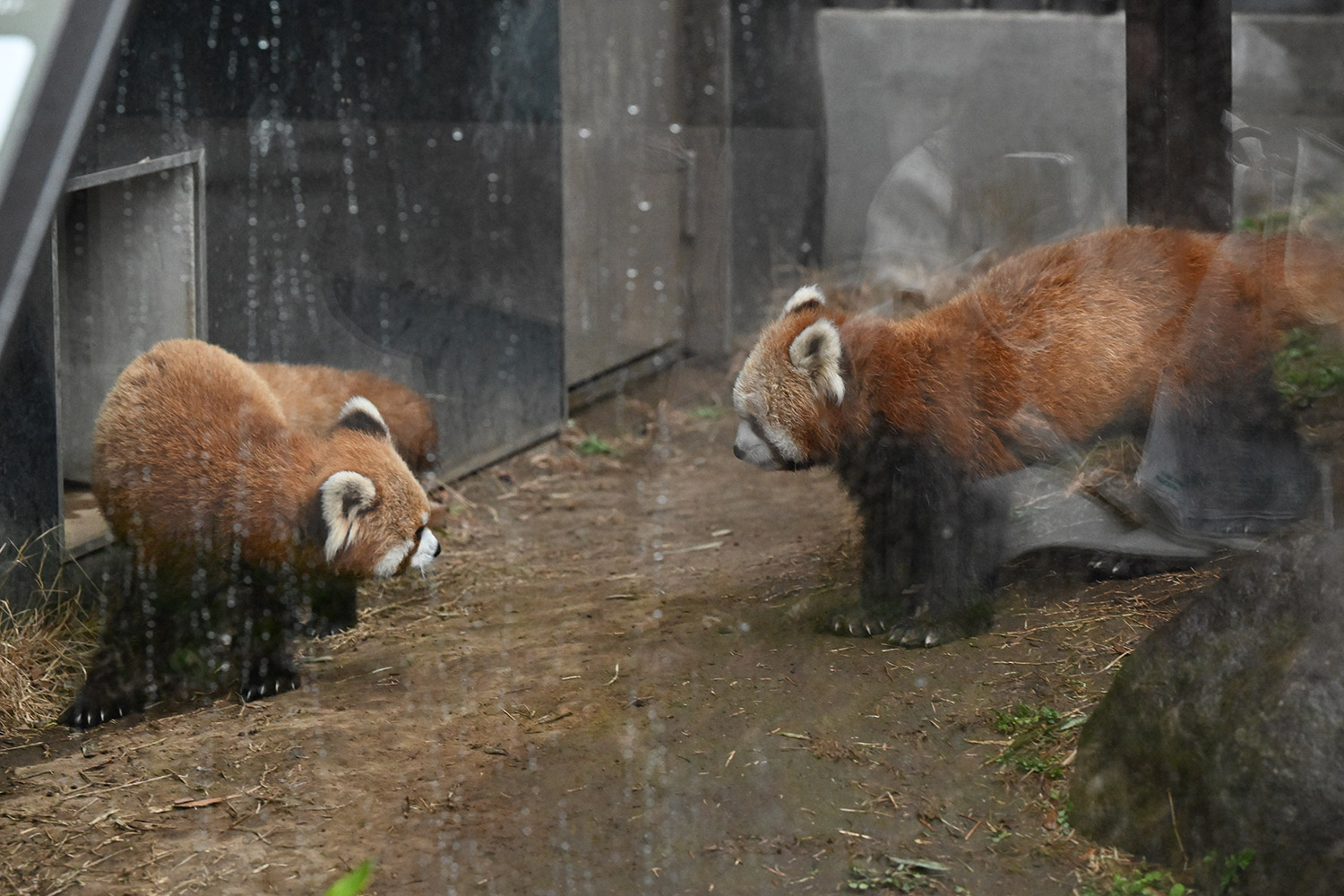雨ざーざーの中のお散歩のカリンちゃん、よこ顔真正面のまるい顔とてもかわいいです・・・。ルカちゃんやぐらから下りてきて雨がそぼ降るなか花冷えのなか、ふたりで歩きだして・・・。雨も楽しい、そんな雰囲気にも感じました。