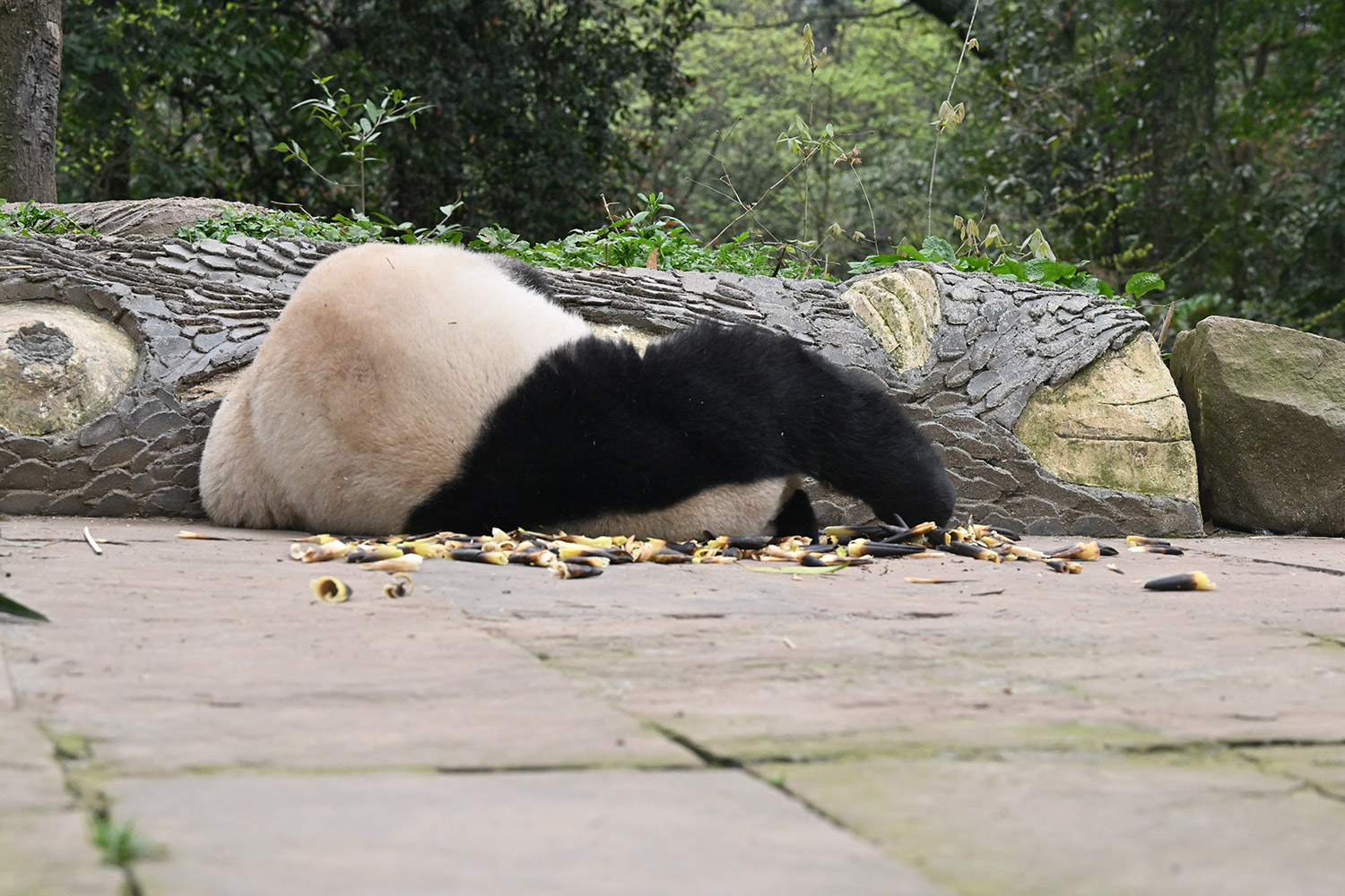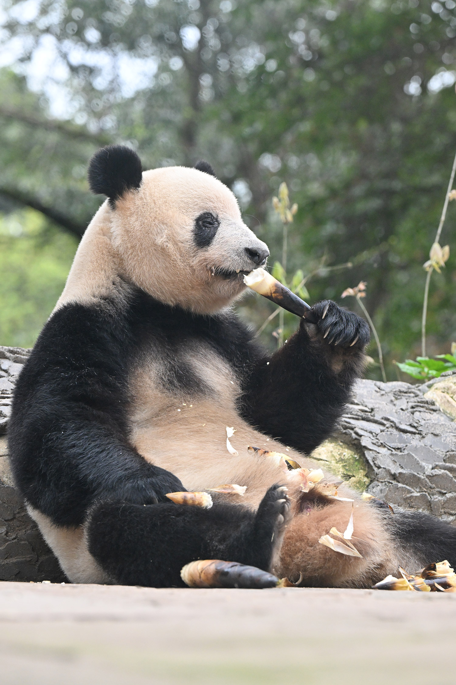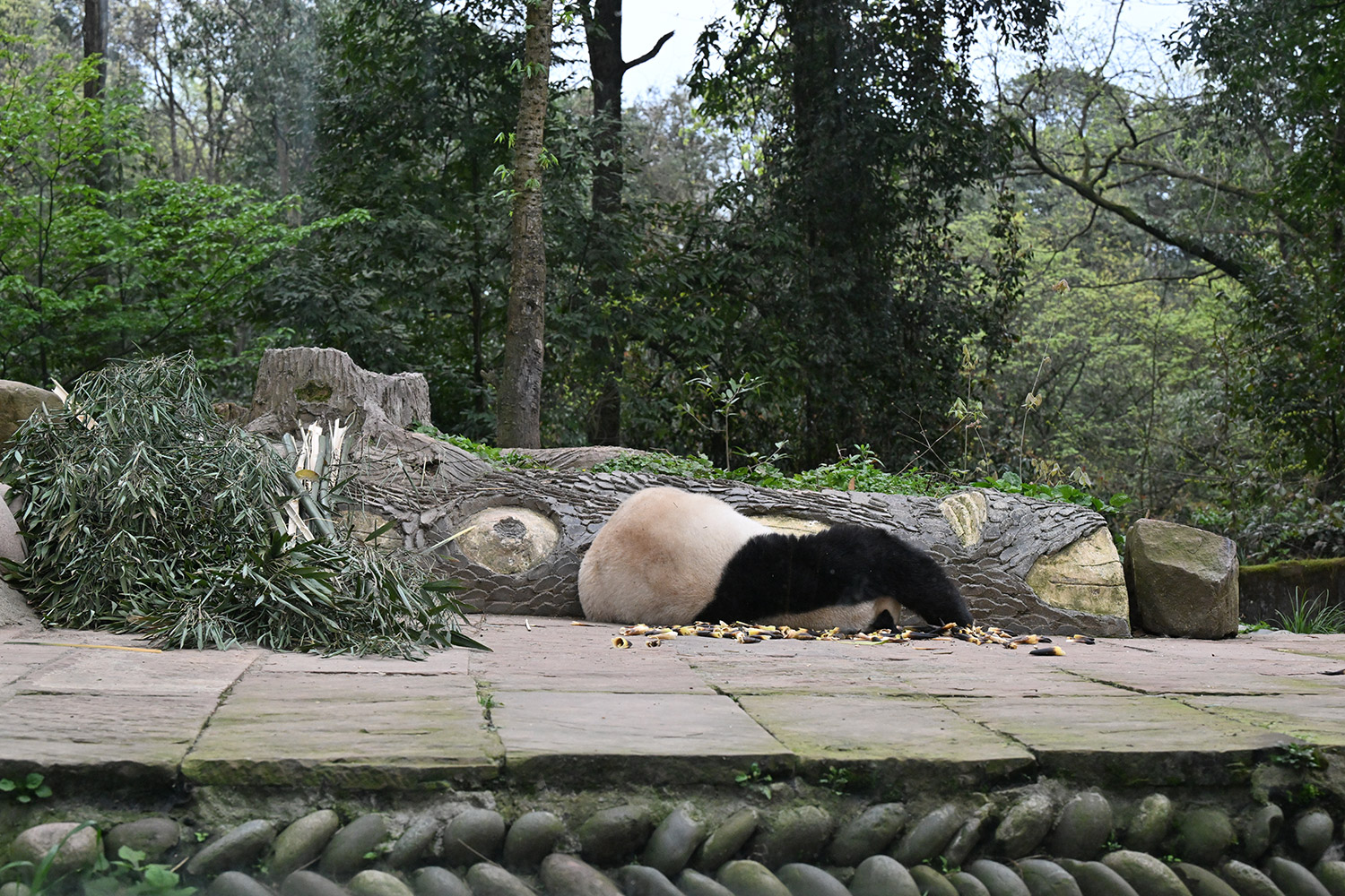 皆さま、おはようございます。5日目。シンママのゴロゴロタイムは、セクシーですね。シャン姉、今日は1個の林檎咥えながら定位置に。筍大きいね。筍の二刀流?餌待ちは、べったり低姿勢で蘭蘭さん待ち。丁度目線が合うのかな?
