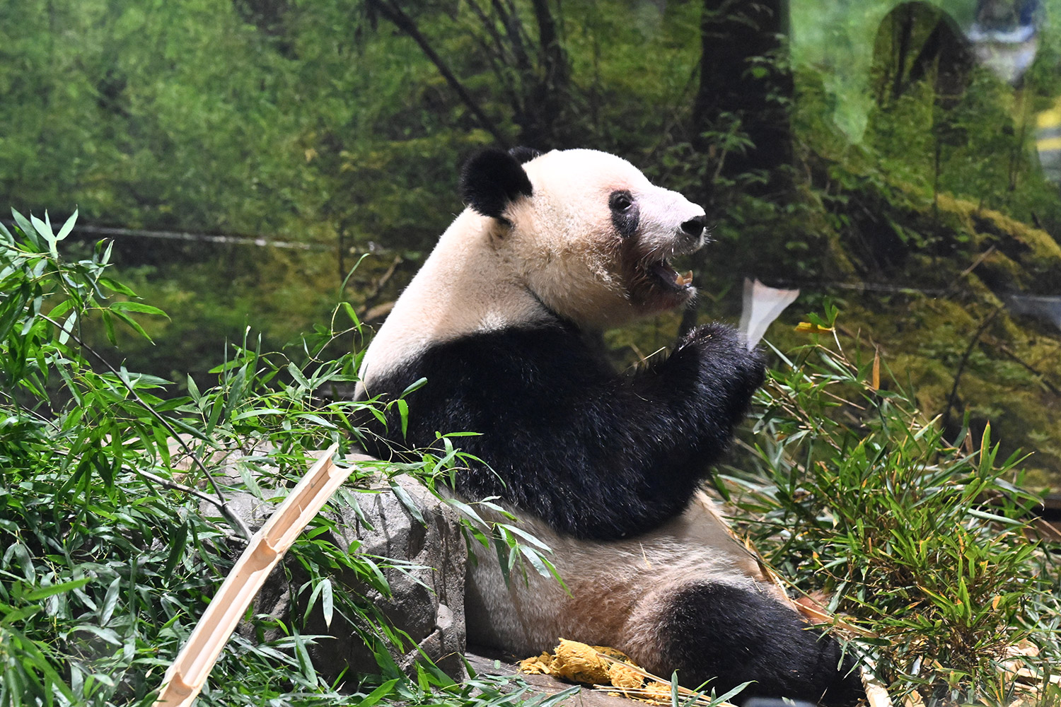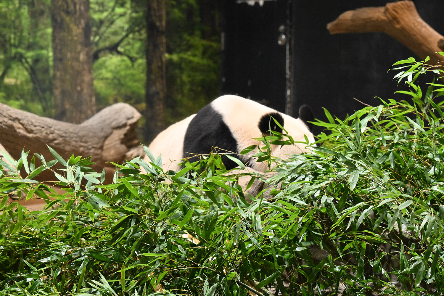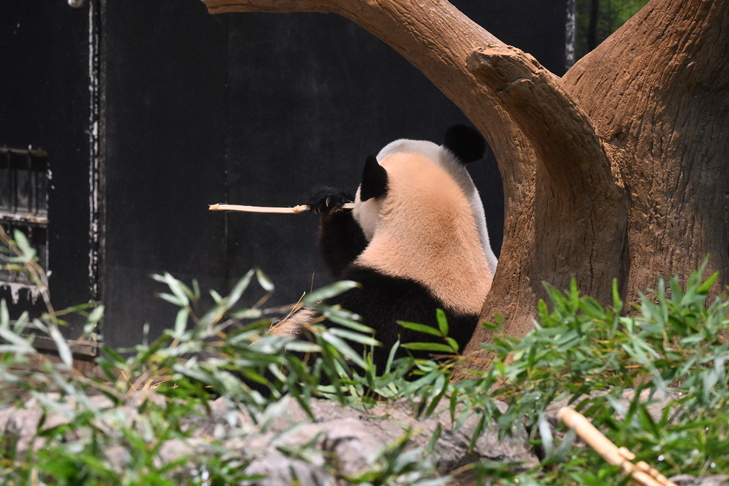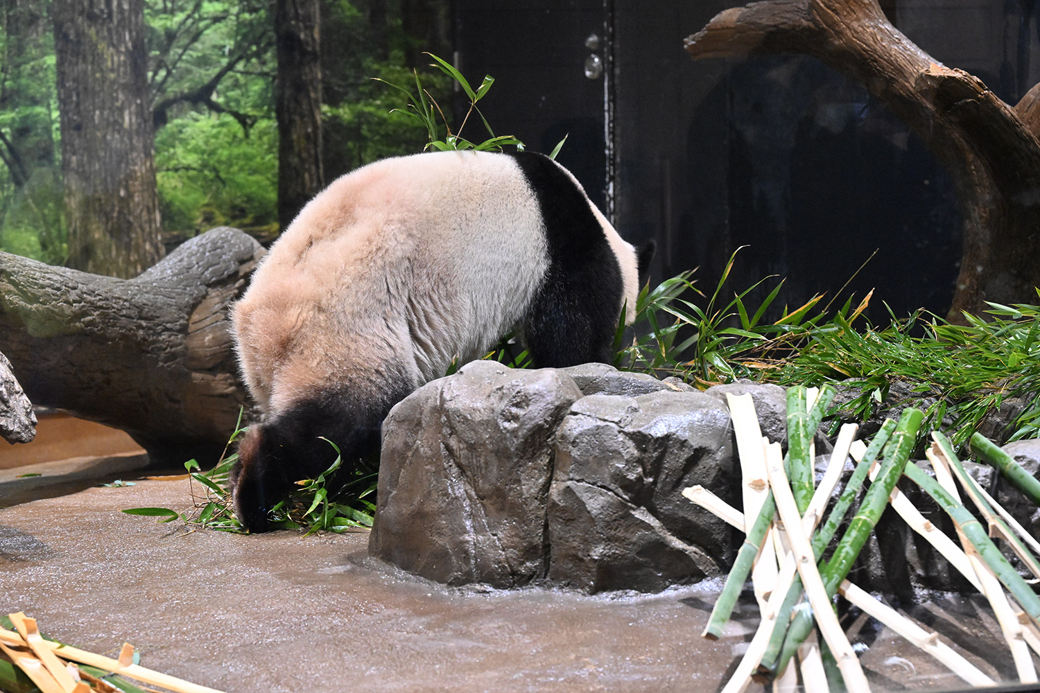 今日のパンダは13:30からです。明日から検疫に入るため、お庭で見られるのは今日がラストとなりました。