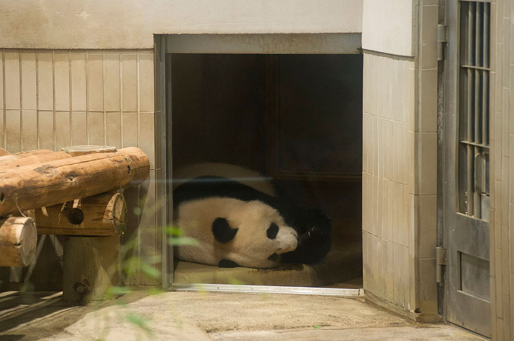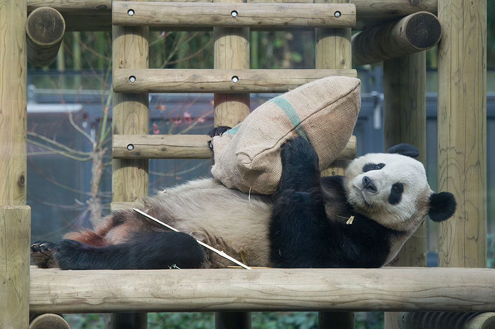 - シンシンはお行儀よくパンダ座り、リーリーは大胆に寝食い。