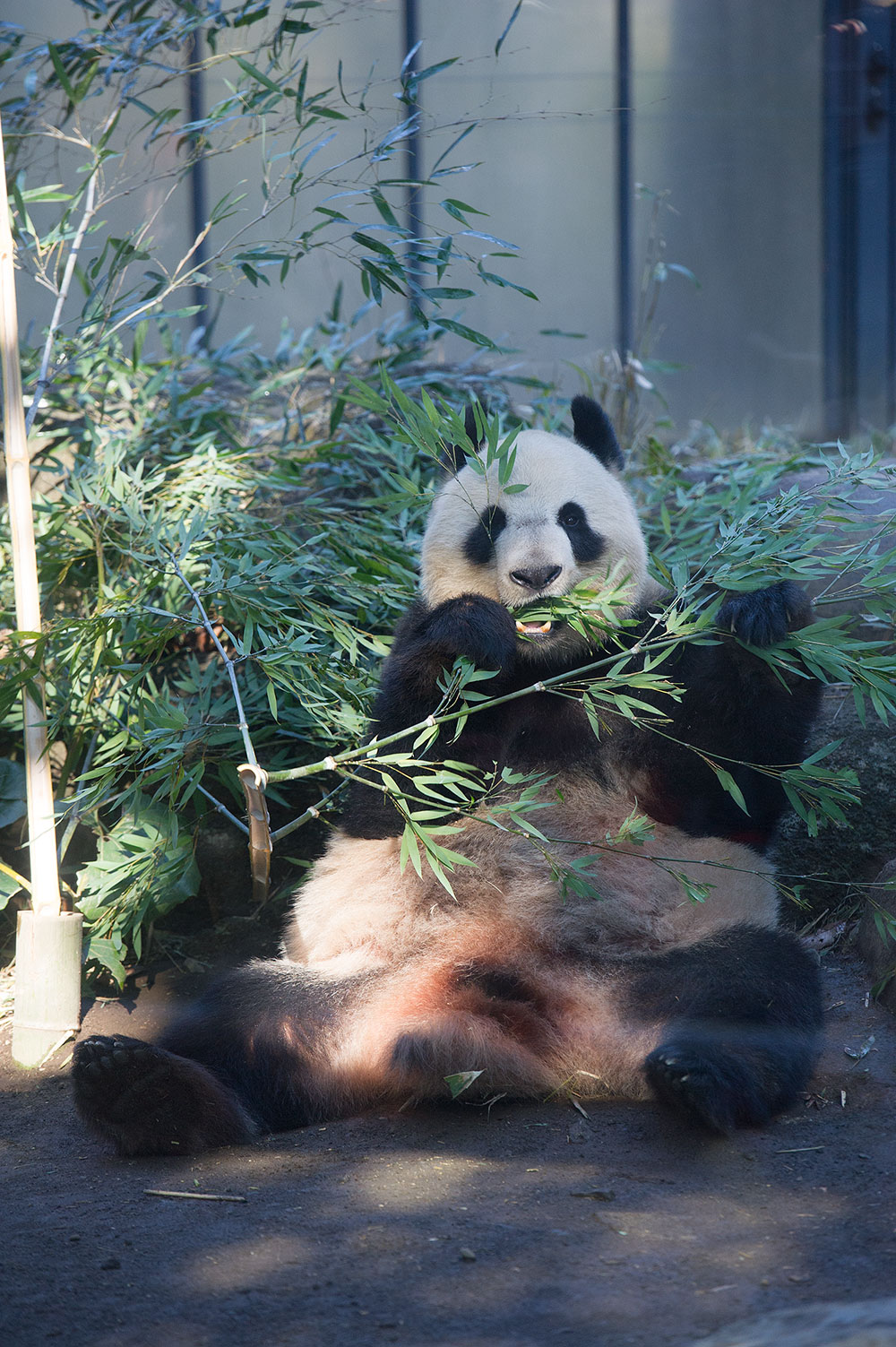 前足を自由に使えるように座って食べる様子。四つん這いではなく、おすわりをした状態で竹を食べる事が多い。次第に姿勢が悪くなって気づいたらごろんと寝っ転がっていることも。よりかかれるような傾斜や、小石があるところを選んで座る。
