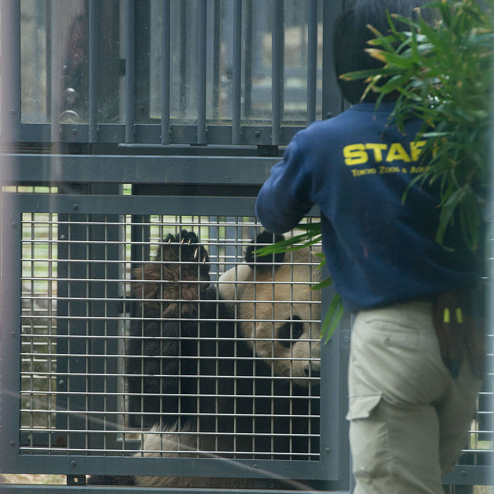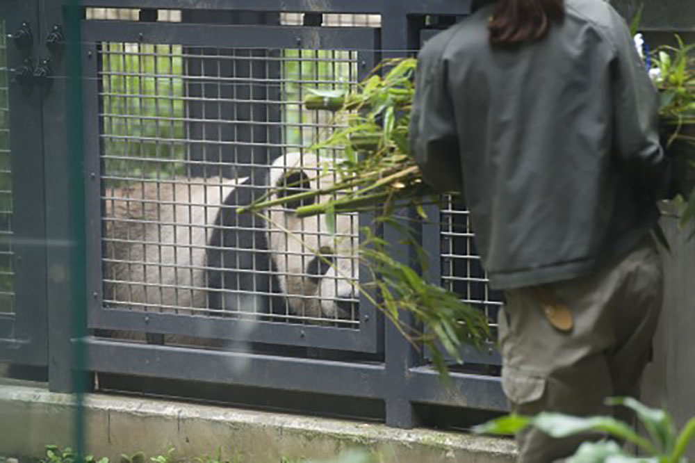 餌をあげること。食べ残した竹を片付けて、新鮮な竹に入れ替える。1時間30分~2時間に1回の間隔で行われる。食べ残した古い竹は基本的には食べない。