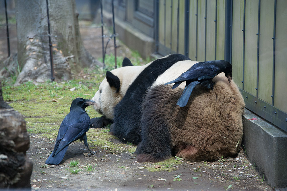 上野公園にはカラスがとても多く、パンダ舎の中も自由に出入りしている。繁殖期なるとパンダの毛をむしって巣に持ち帰る。子育てのシーズンになると親子でパンダのところにやってくる。パンダ舎の近くに巣がある。