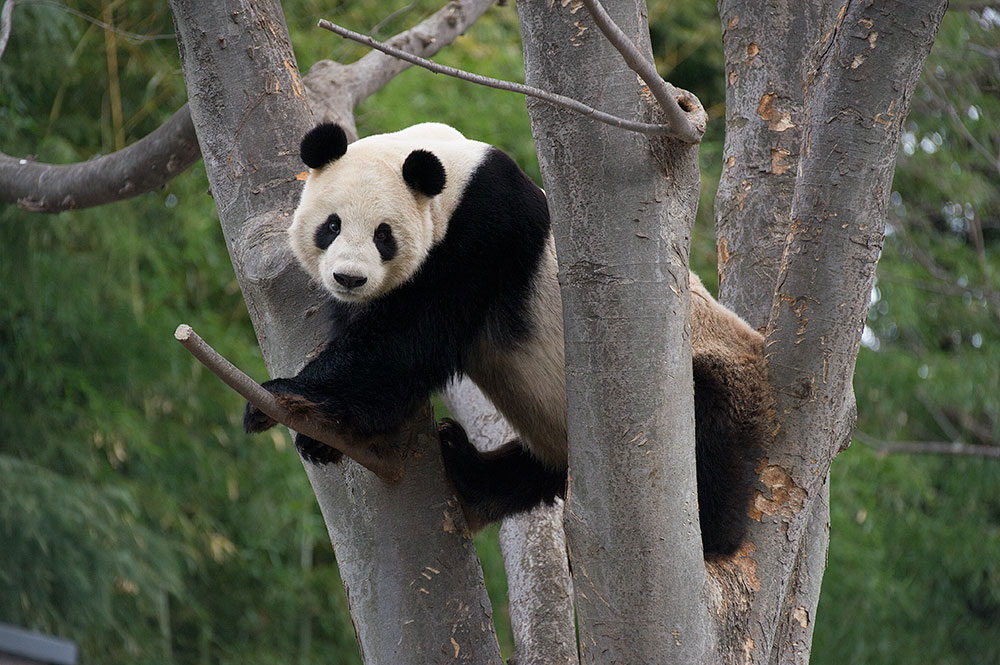 パンダは木登り上手。大きな体でありながら、あっというまに高いところまでひょいと登ってしまう。木登りをするのは物音に驚いた時や、テンションが上がった時。