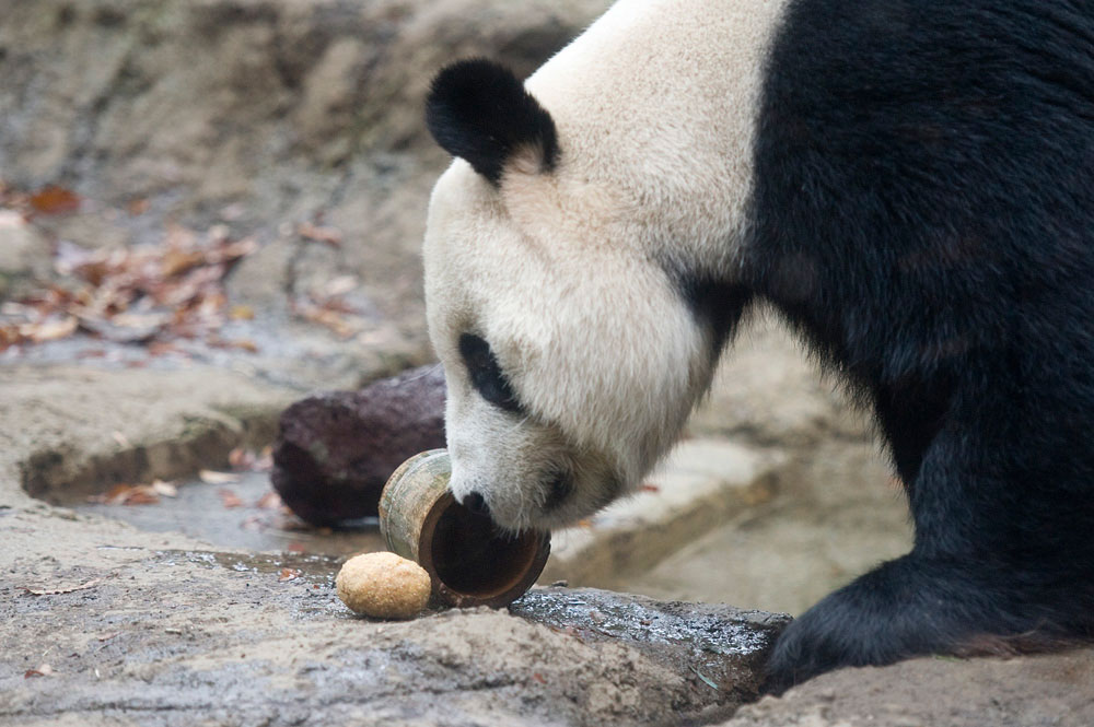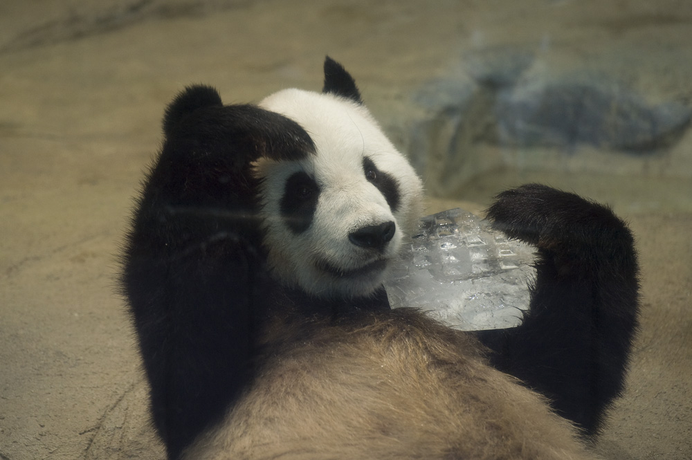 - シンシンは氷の中のおやつを取り出そうと夢中になっていた。