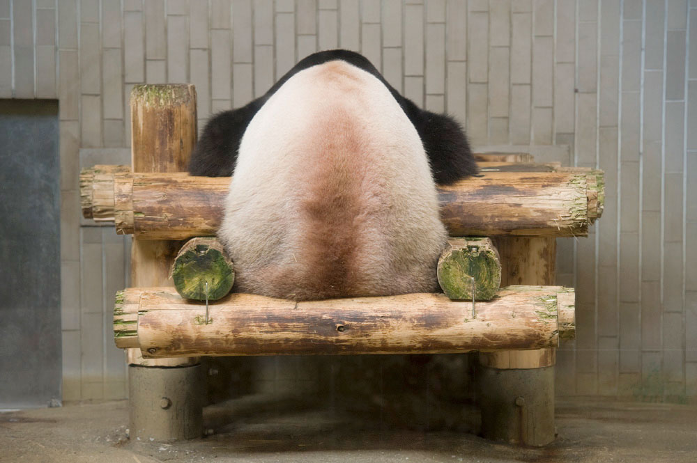 頭を垂らして寝ている様子。シンシンが好んでよくやる姿勢。頭に血が登らないのか、かえって休まらないのではないか、などなどお客さんは口々に言う。