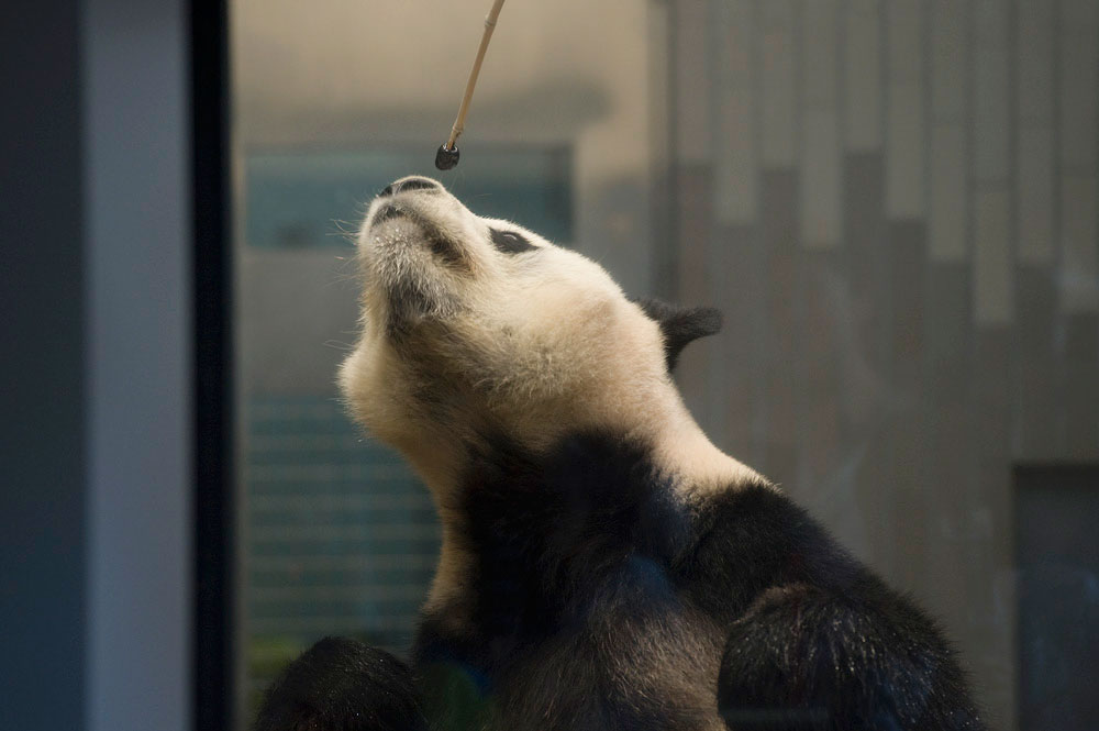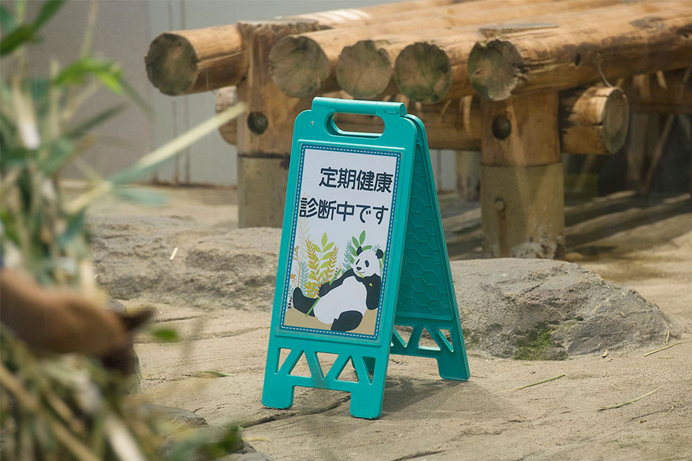 パンダの健康状態をチェックする時間。繁殖の時期が近づくと頻繁に行うようになる。採血や尿を採取して、ホルモンの数値を調べたりする。