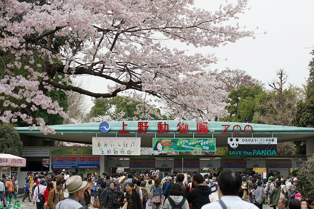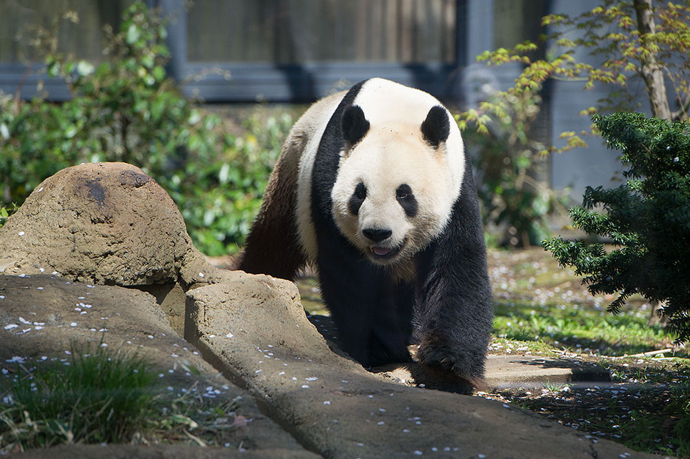 春は動物園が一番混雑する季節。お花見シーズンともなると公園中が人で埋まる。動物園内も見事な桜がたくさん生えていて、パンダも空を見上げて桜を鑑賞しているよう。