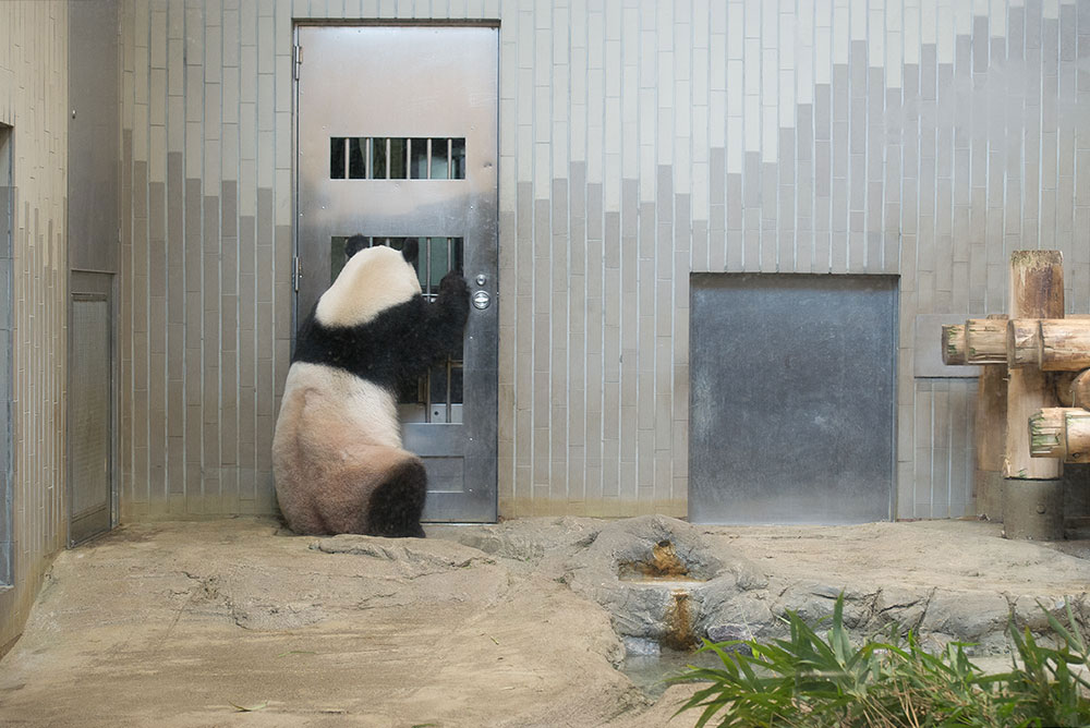 パンダが屋外で生活するスペース。手前の運動場と奥の運動場がメインで、さらに奥には非公開の運動場がある。運動場には大きな木・櫓・プール・ハンモック・砂場などがあり、パンダが飽きないように工夫されている。