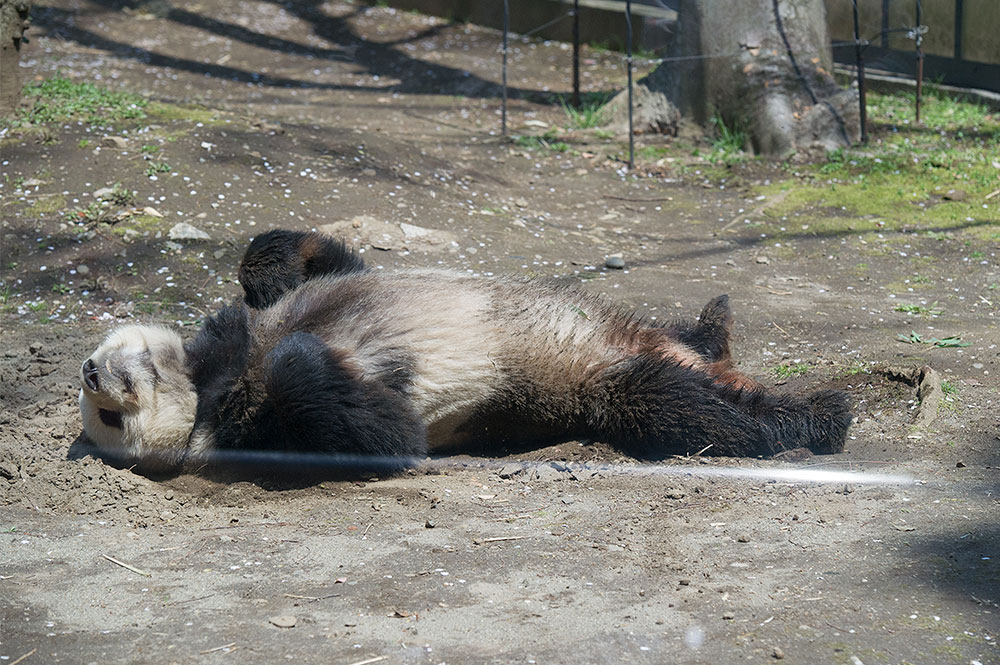 運動場には砂場があり、さくさくに耕してあると、パンダは砂の上でごろごろ転がる。なぜか2:30頃にごろごろ砂遊びをすることが多い。背中を砂にこすりつけてすりすり、前足でお腹に砂をかけるなどを1分程度する。シンシンはしない。