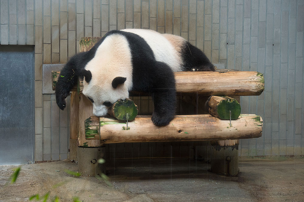 - リーリーはやぐらのてっぺんでお昼寝、シンシンはやぐらの下でお食事しています。