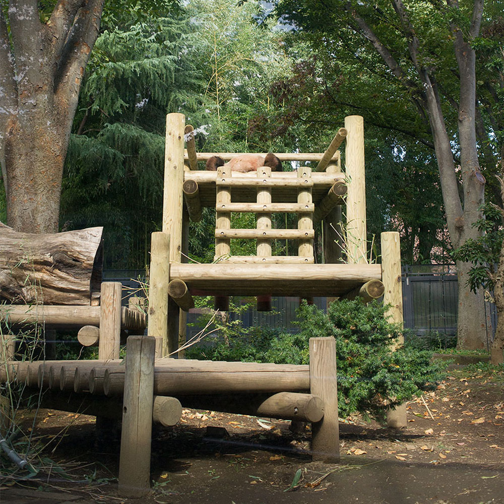 パンダが登って餌を食べたり、寝て過ごすための木製の台。高層の櫓はアスレチックとも呼ばれている。