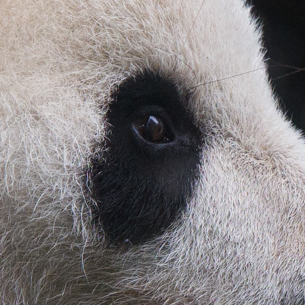 たれ目と見せかけて、実はけっこうつり目。食べているときはほとんど目を瞑っているけど、竹を選んでいるときはしっかり見開いて、瞳がキラキラ☆ まつげ(と呼ばれる毛)はとっても長く、白い毛と黒い毛があるよ。