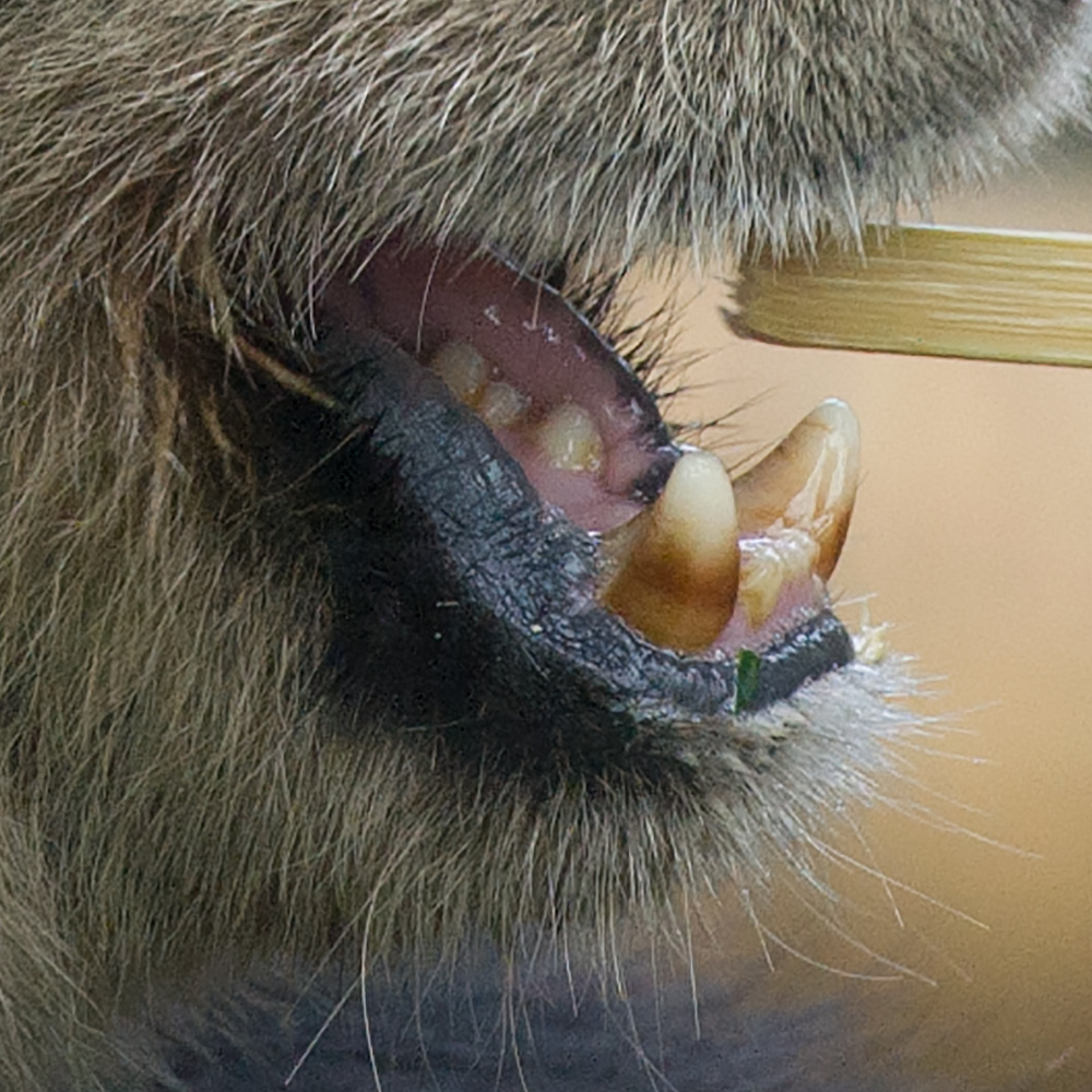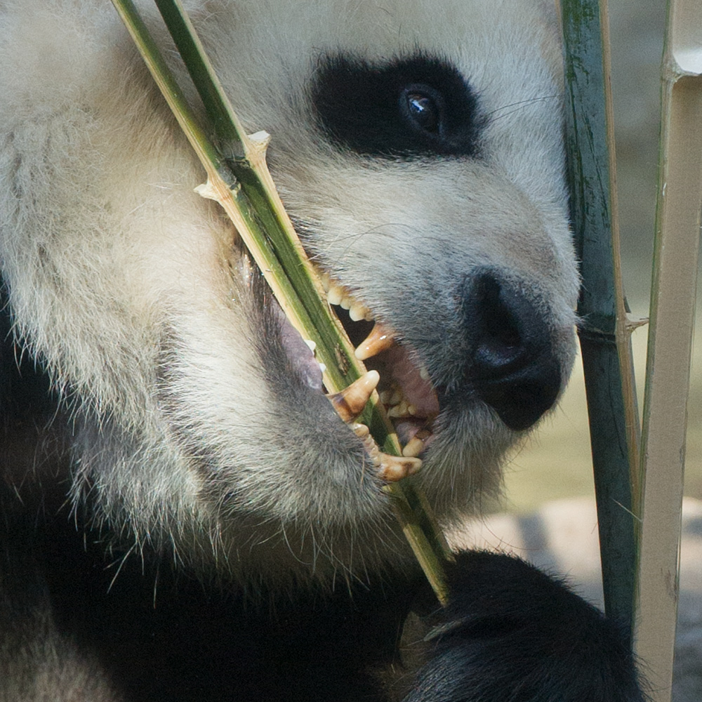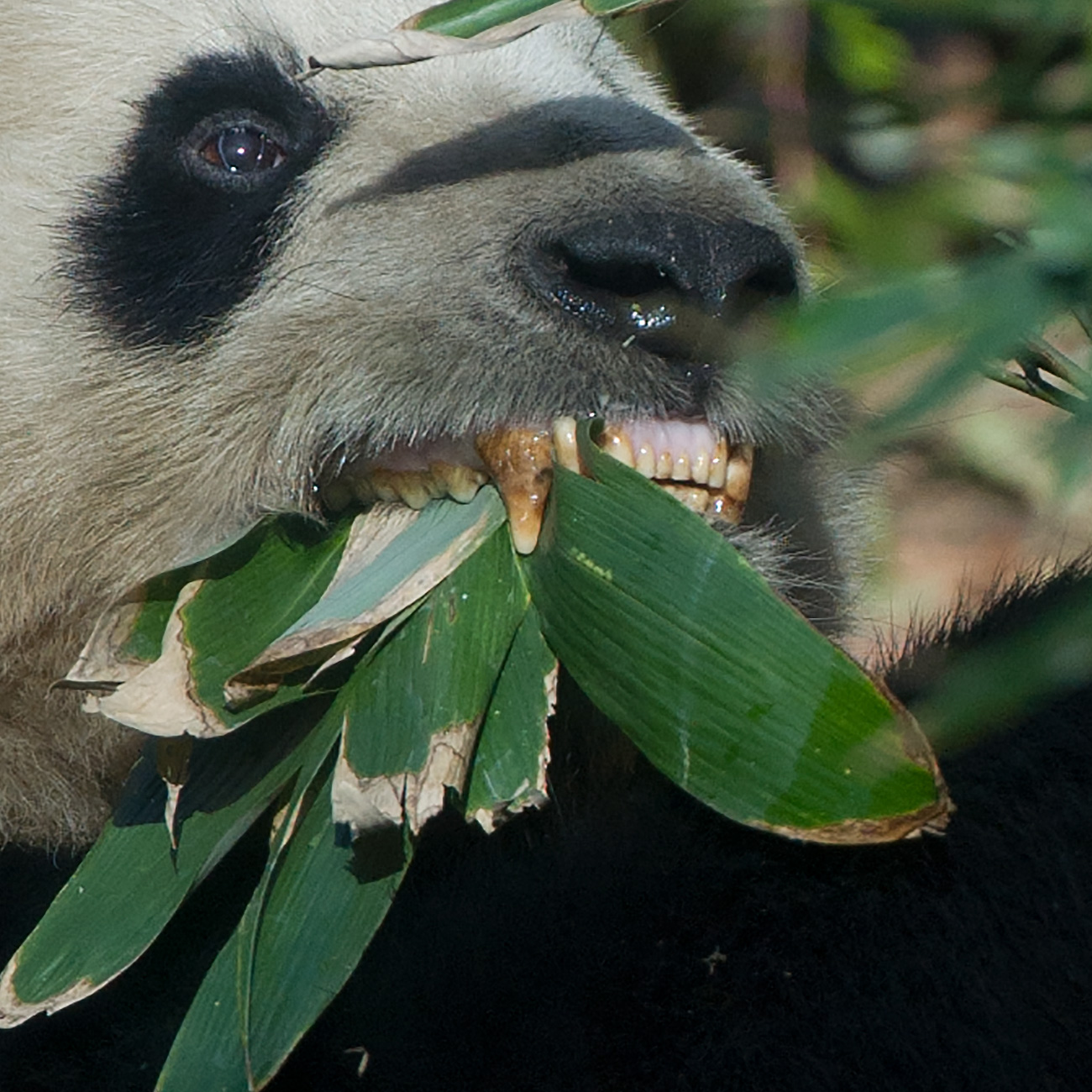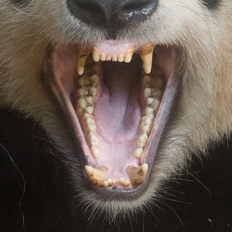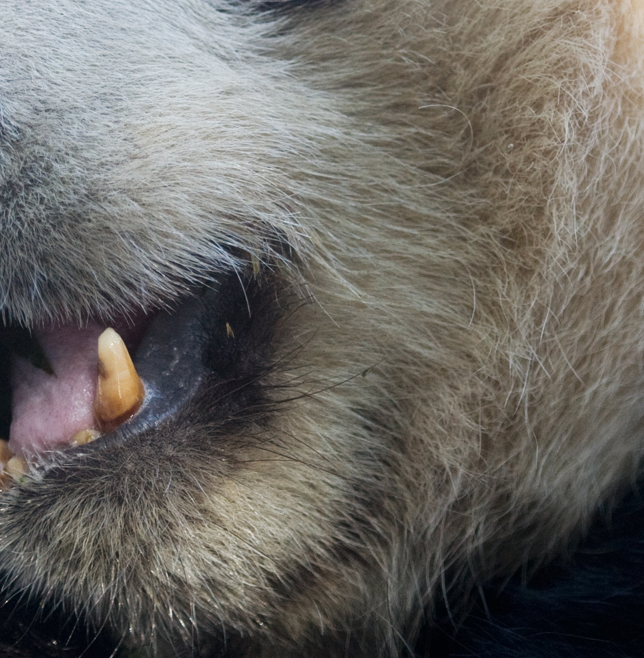 竹をたべるために特化した作りになっています。固い竹の幹をバリバリ割るための犬歯、竹の皮を剥くときや、幹や葉っぱをすりつぶすための臼歯が大きく平たい形をしています。葉っぱを束ねて噛みちぎるための前歯はとっても小さい。