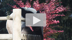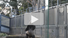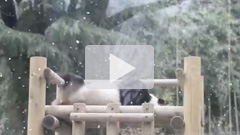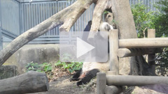 柵越しにシンシンを見てからスイッチがオン。麻袋を蹴散らして、勢いに任せて木登り。「コアラチック」