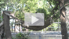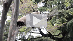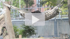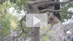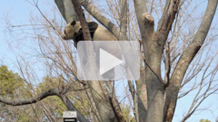 リーリーを観察のためシンシンの運動場に入れた際に木登りをして暴れる様子。2015年3月16日撮影