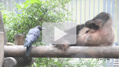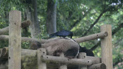 リーリーとシンシンがカラスに毛を抜かれる様子。睡眠第一のため、どんなにつつかれても起きない。