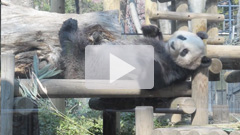 リーリーとシンシンがハンモックに載ってゆらゆらする様子。リーリーは瞑想、シンシンは大暴れ。「ノーフラッシュ!」
