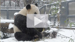 リーリーとシンシンが雪の中で竹を食べる様子。